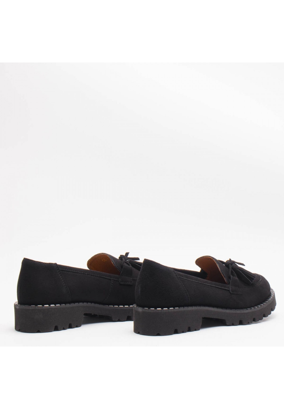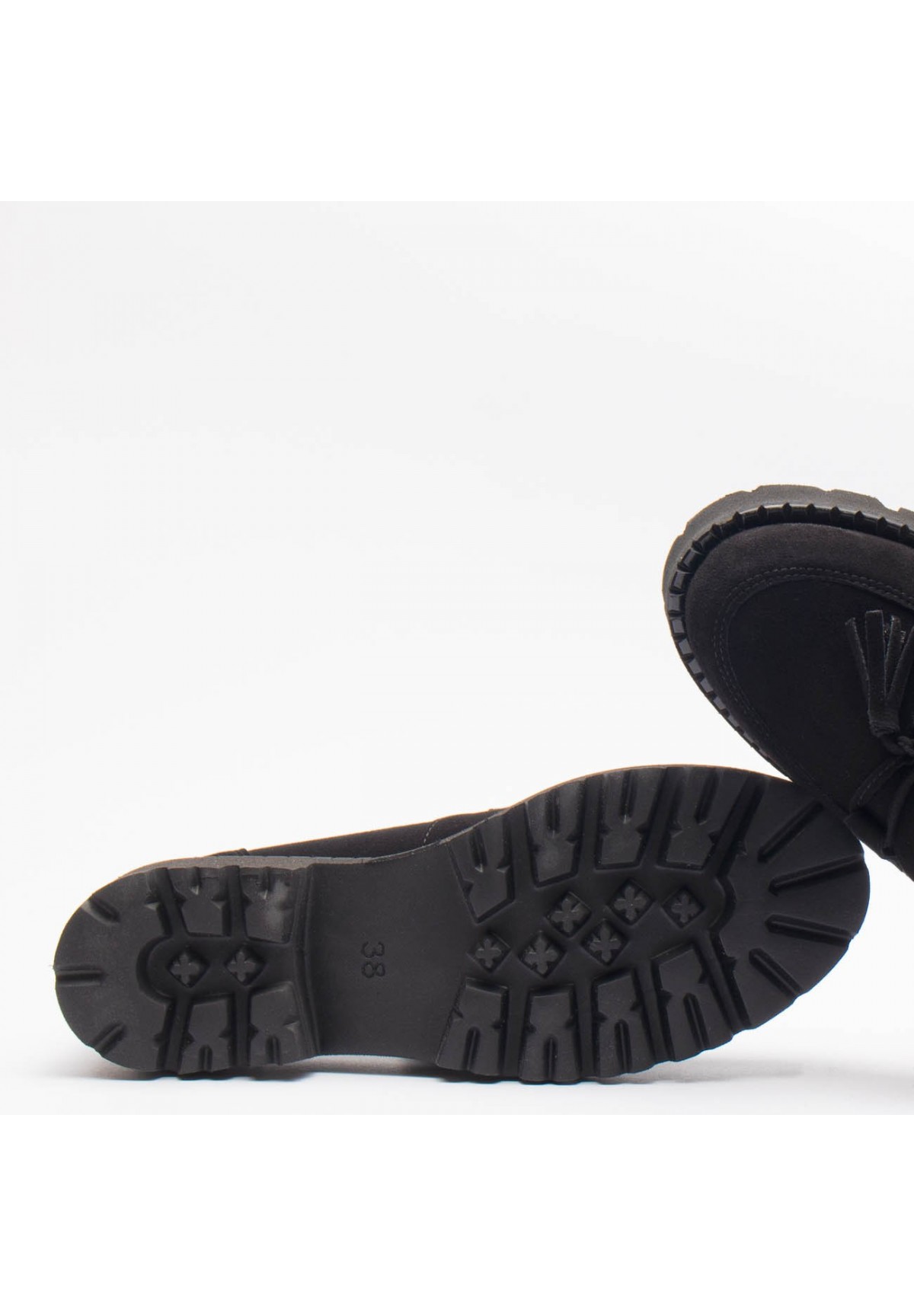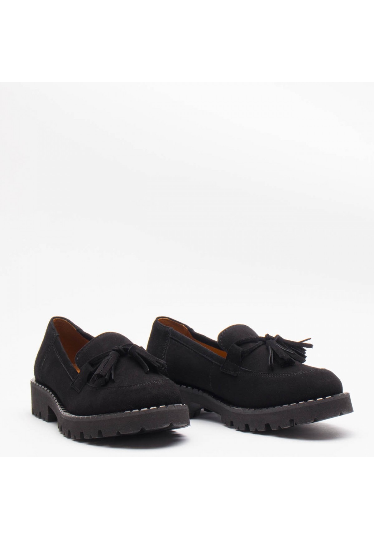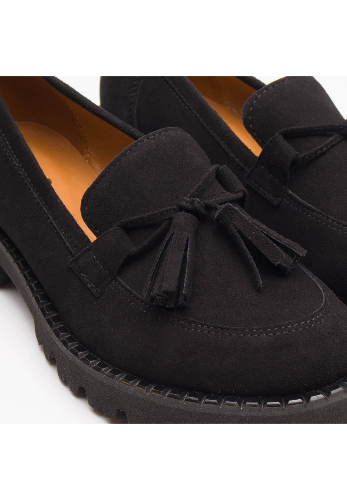 Klasyczne mokasyny wykonane z naturalnej skóry zamszowej w kolorze czarnym. Nosek przyozdobiony frędzlami.