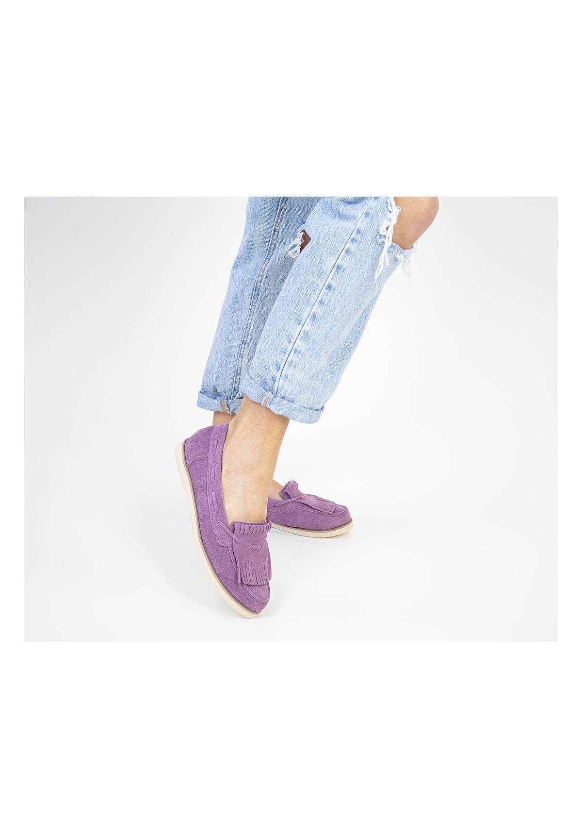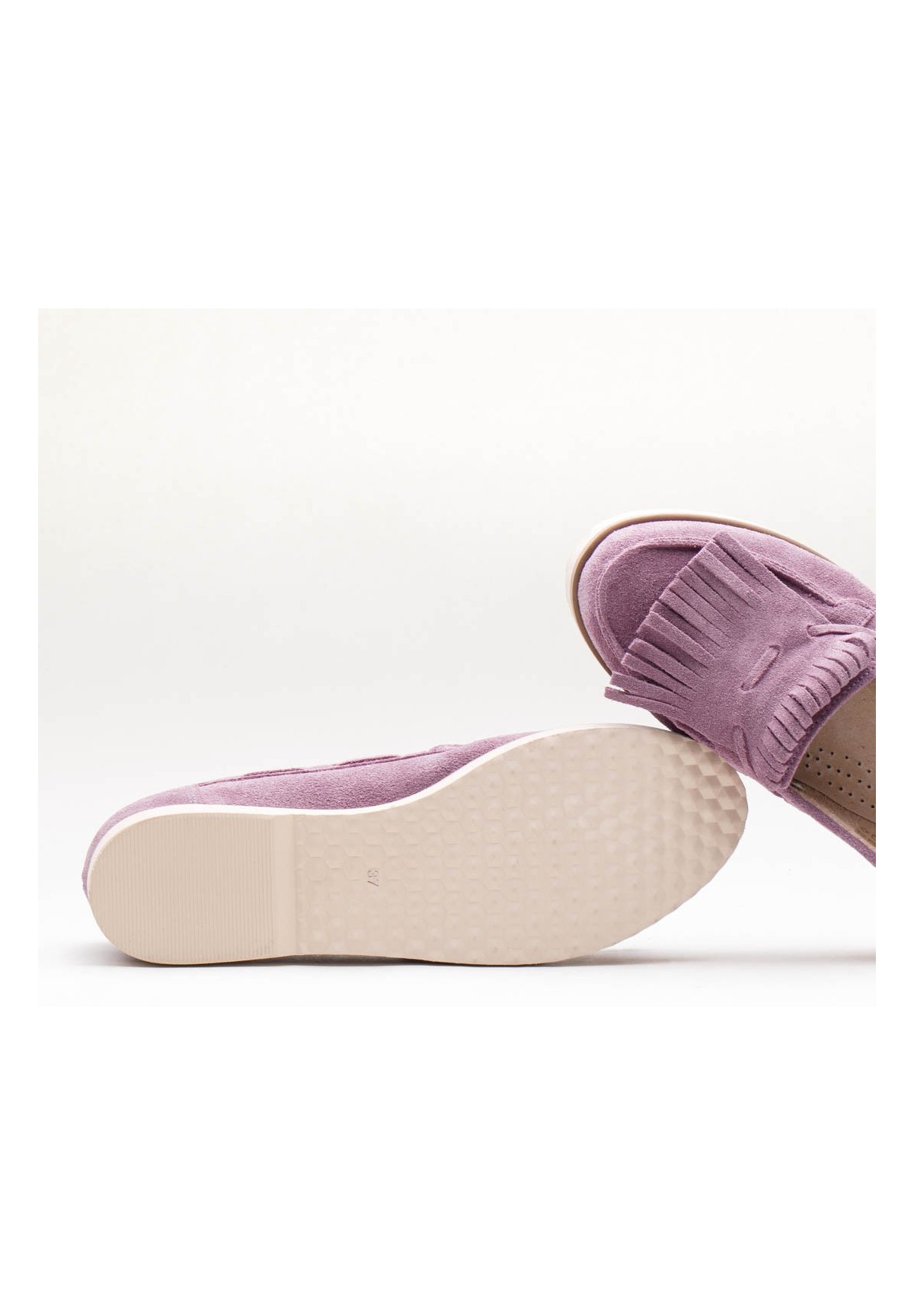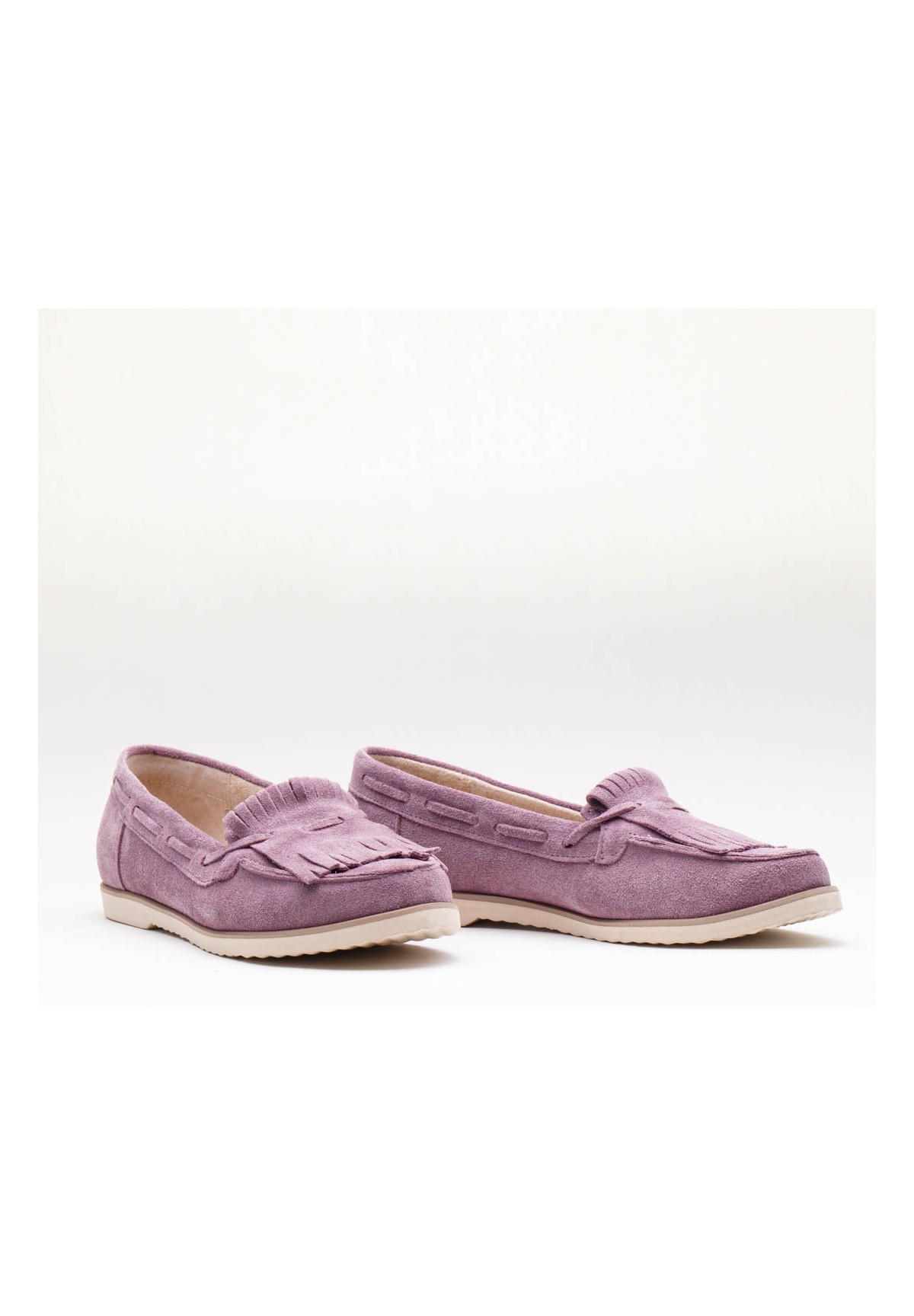 Klasyczne mokasyny damskie w przepięknym liliowym kolorze. Komfortowe dzięki płaskiej podeszwie oraz wewnętrznej wkładce z naturalnej skóry. Z przodu buta ozdobne frędzle. Buty wykonane z naturalnej skóry welurowej, doskonale sprawdzą się do letnich stylizacji.