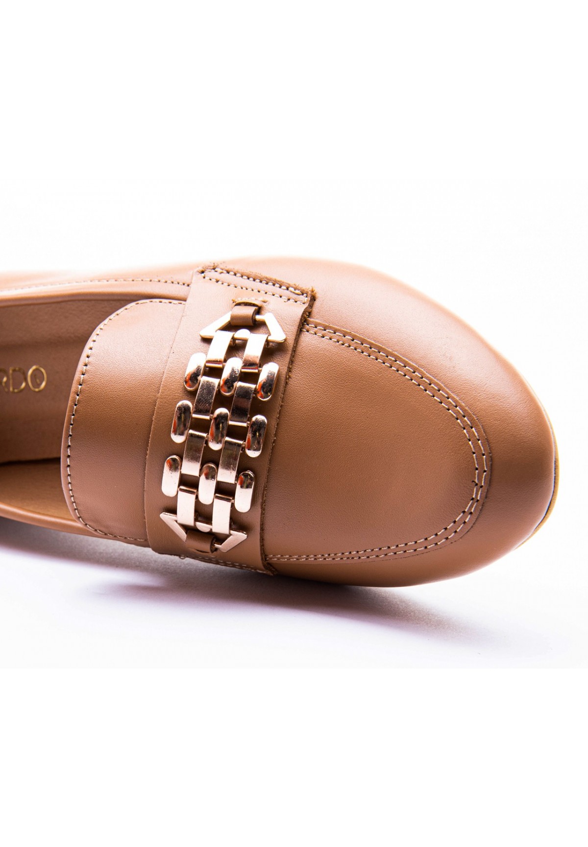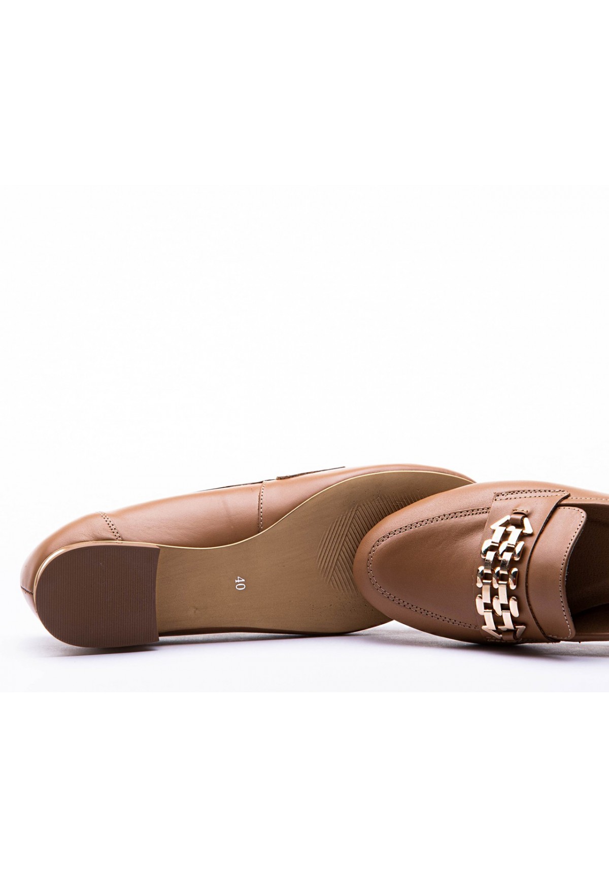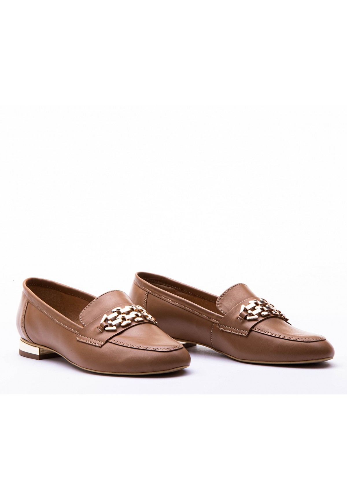 Klasyczne mokasyny wykonane z naturalnej skóry licowej w kolorze brązowym. Wnętrze w całości wyściełane miękką skórą. Nosek przyozdobiony złotymi elementami.