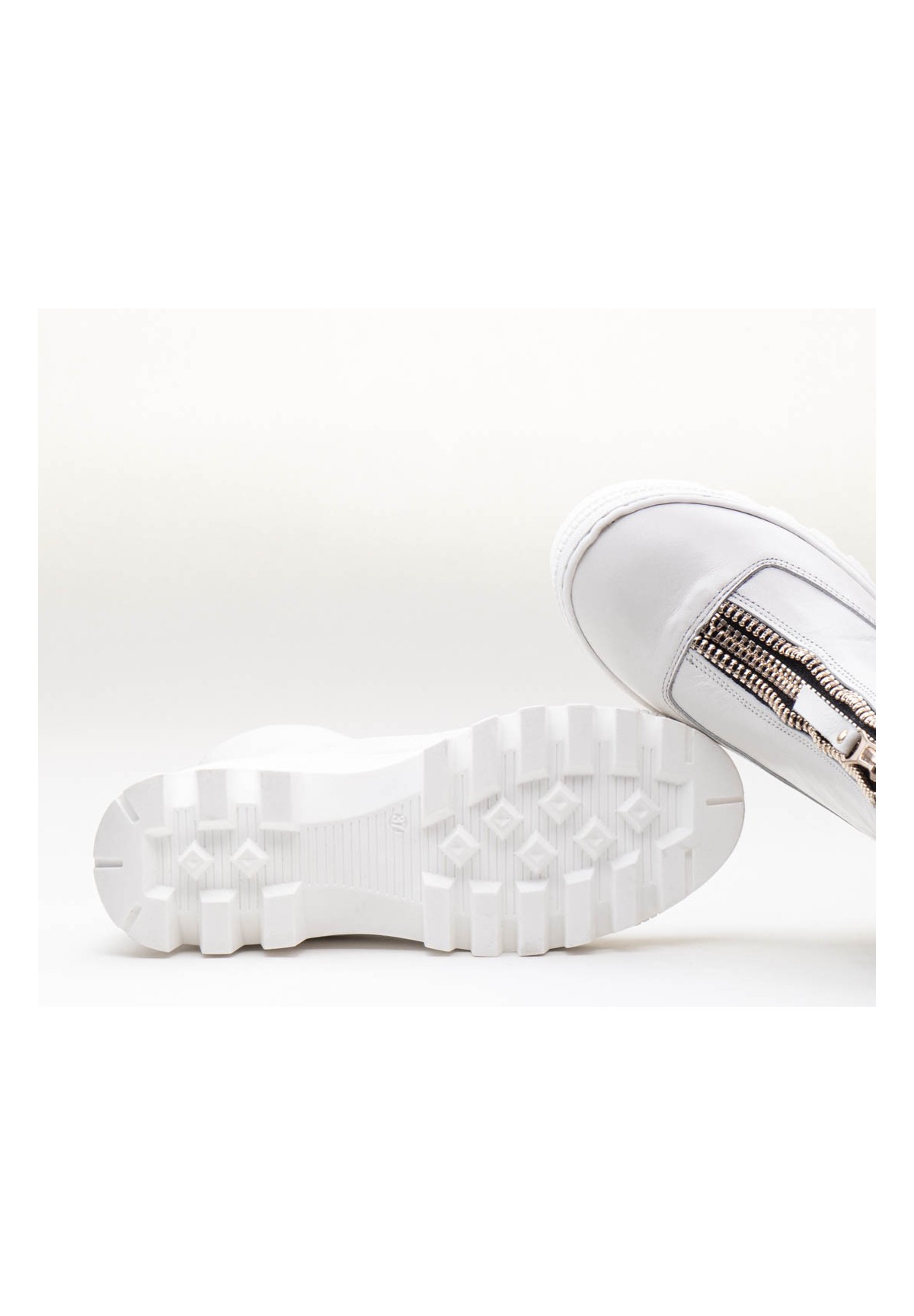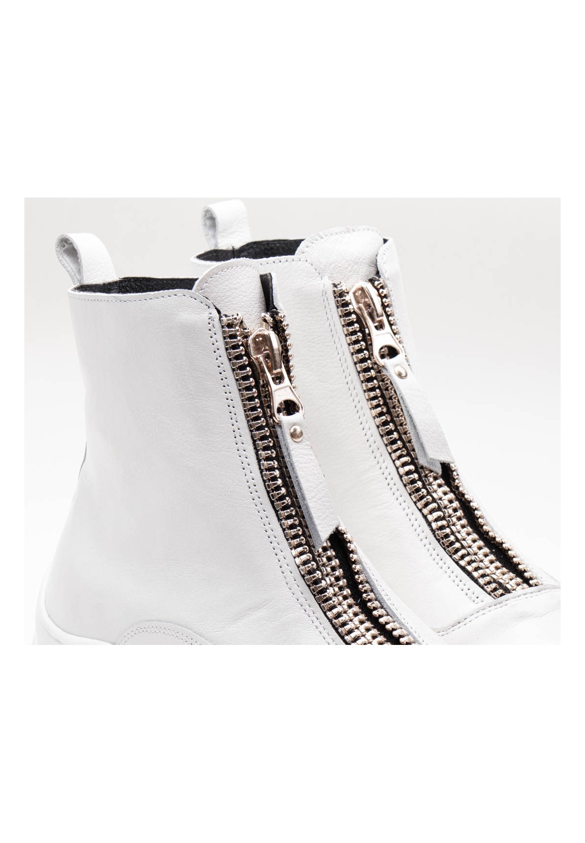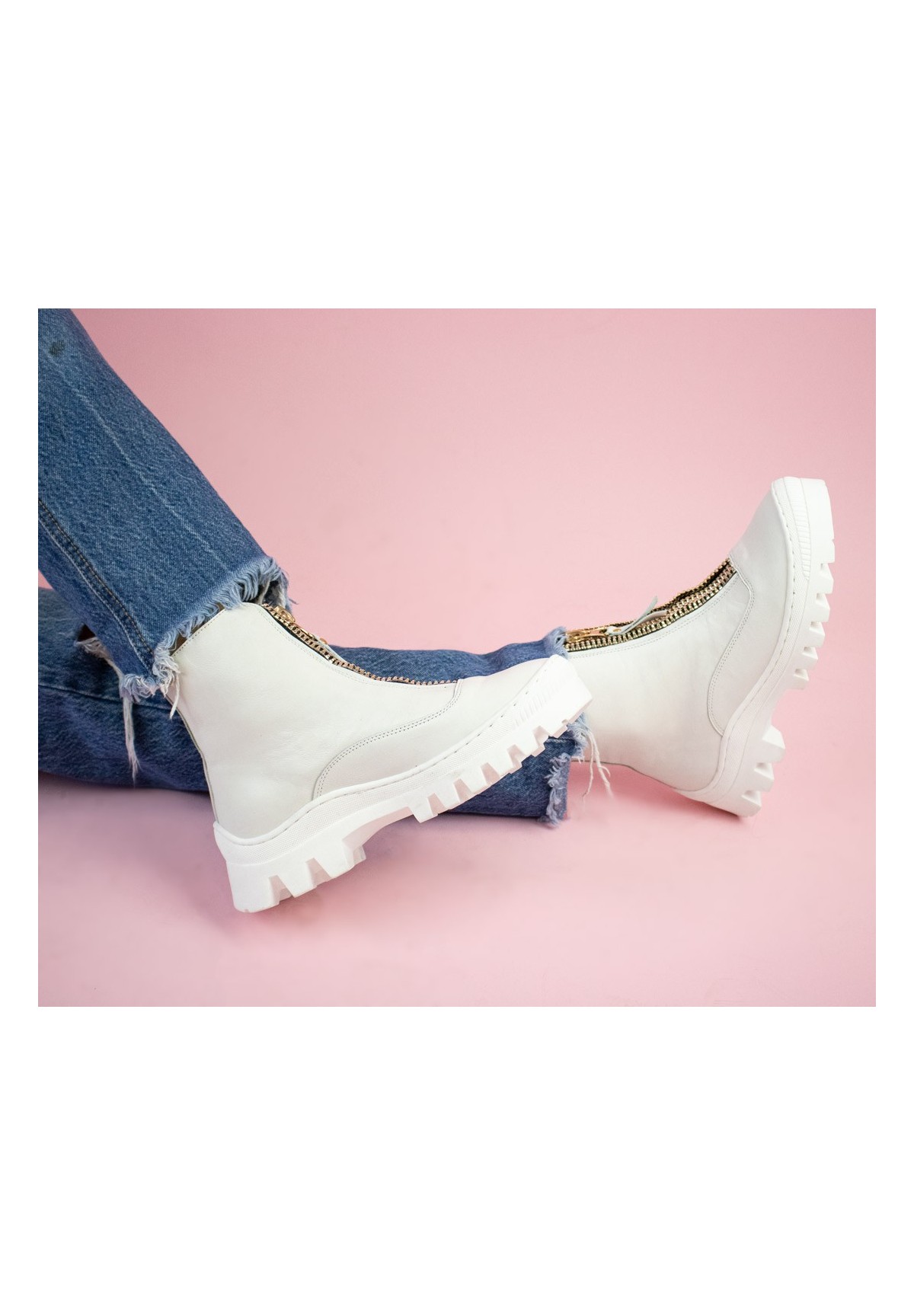 Niebanalnie prezentujące się, białe botki damskie, wykonane z naturalnej skóry licowej. Osadzone na grubej podeszwie, zapewniającej doskonałą amortyzacje podczas chodzenia. Cholewka z zamkiem w górnej części, w miejscu, gdzie przeważnie występują sznurowadła. Wewnątrz wyścielane skórą naturalną, która zapewnia stopom komfort.