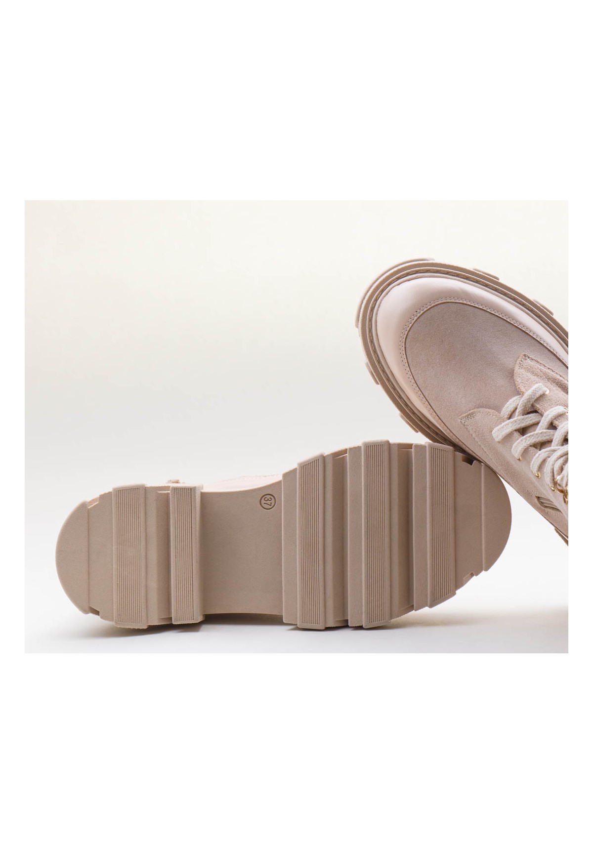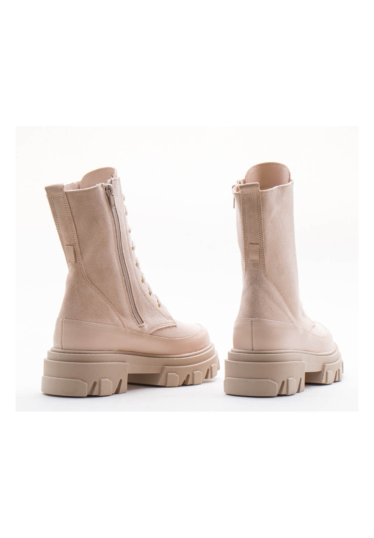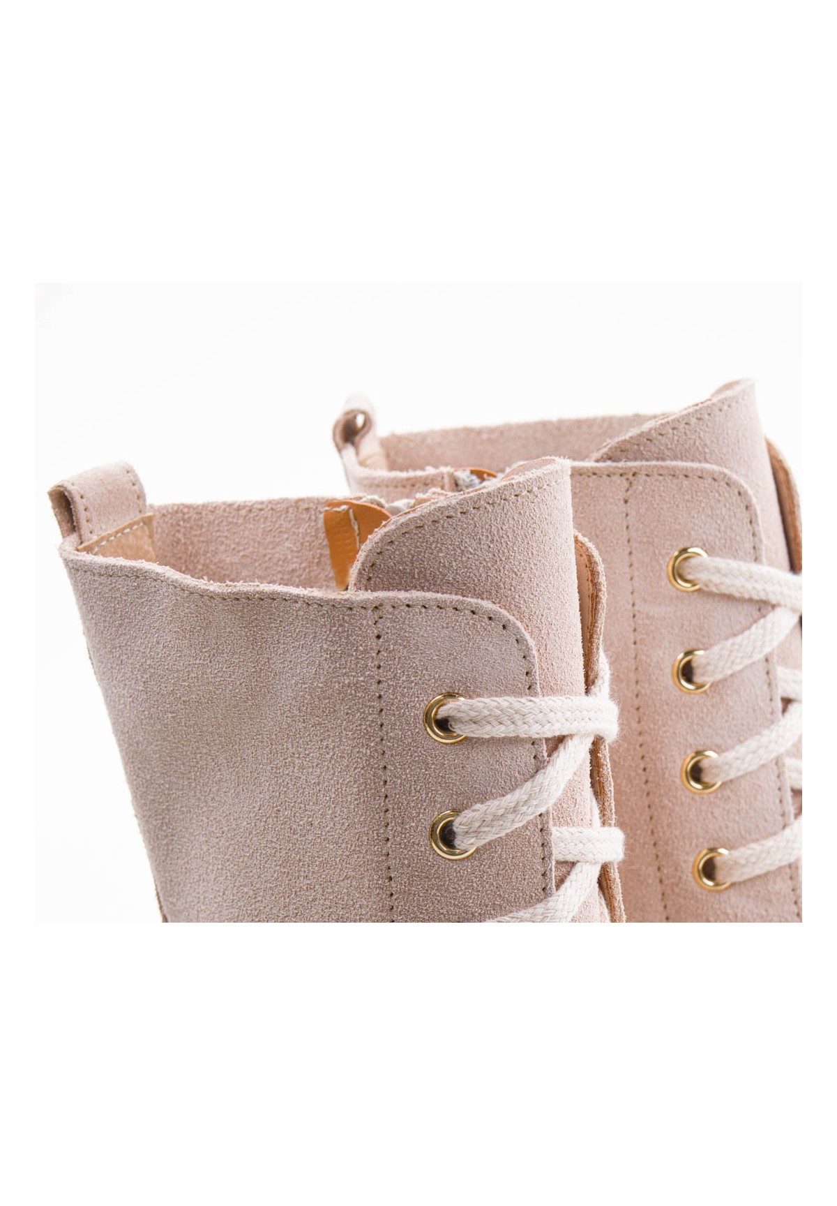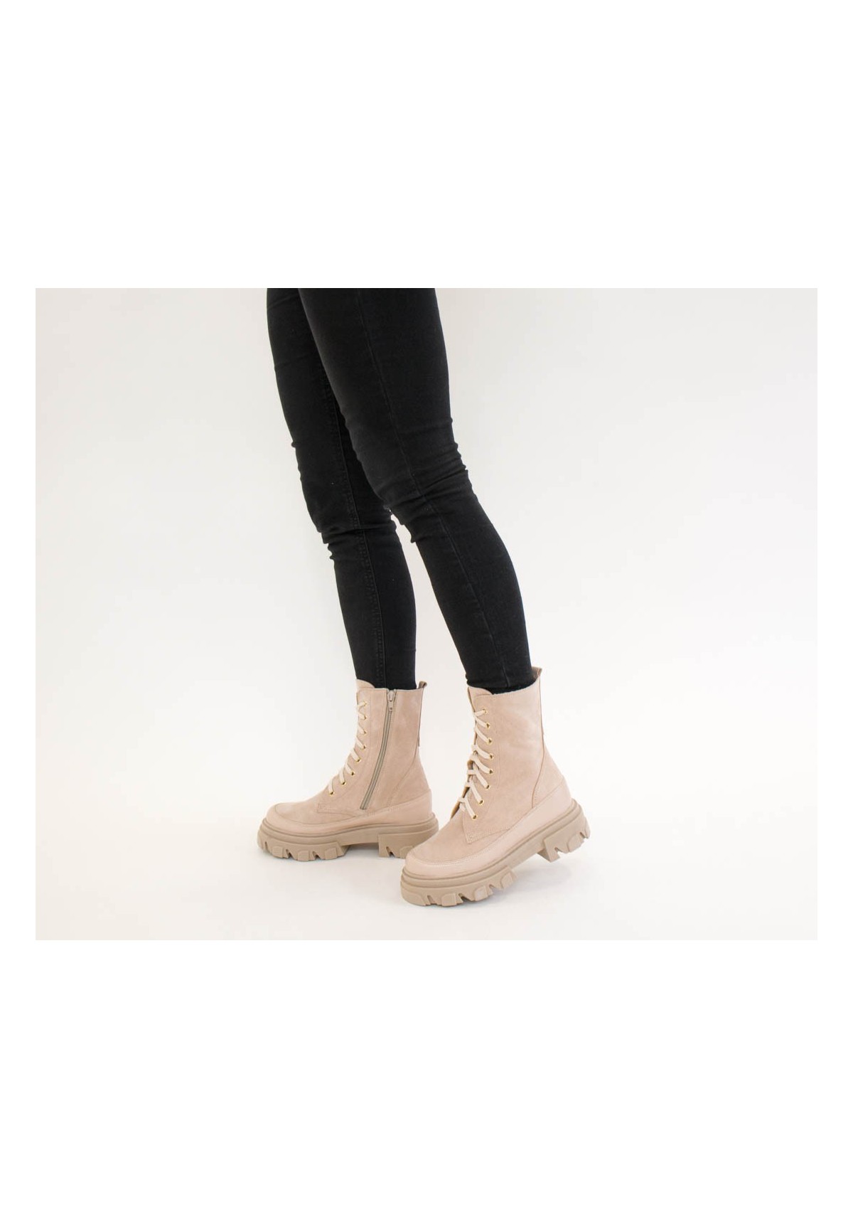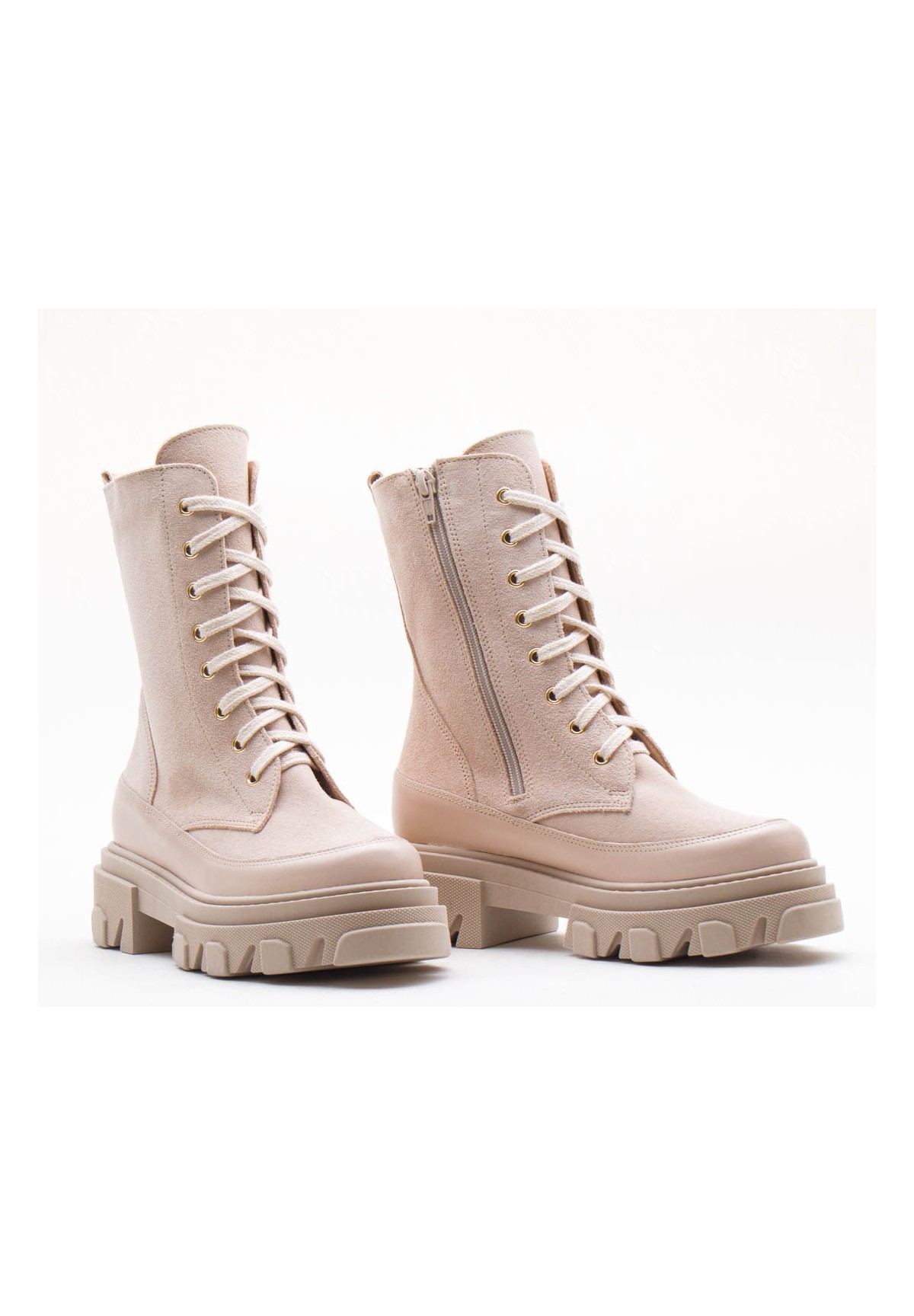 Wysokie botki damskie, wykonane z naturalnej skóry welurowej w kolorze beżowym. Zapinane na zamek. Dodatkowe sznurowanie zapewnia doskonałe dopasowanie cholewki do tęgości stopy. Buty na grubej podeszwie, która zapewnia komfort chodzenia nawet przez długi czas. Wewnątrz znajduje się skórzana wkładka, dzięki której stopa nie poci się, ma zapewnioną doskonałą cyrkulację powietrza. Buty nieocieplane.