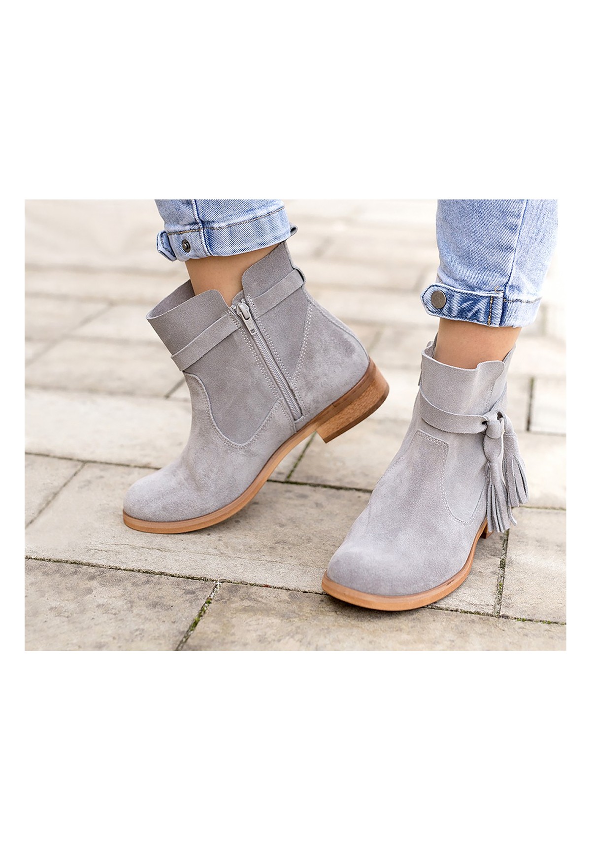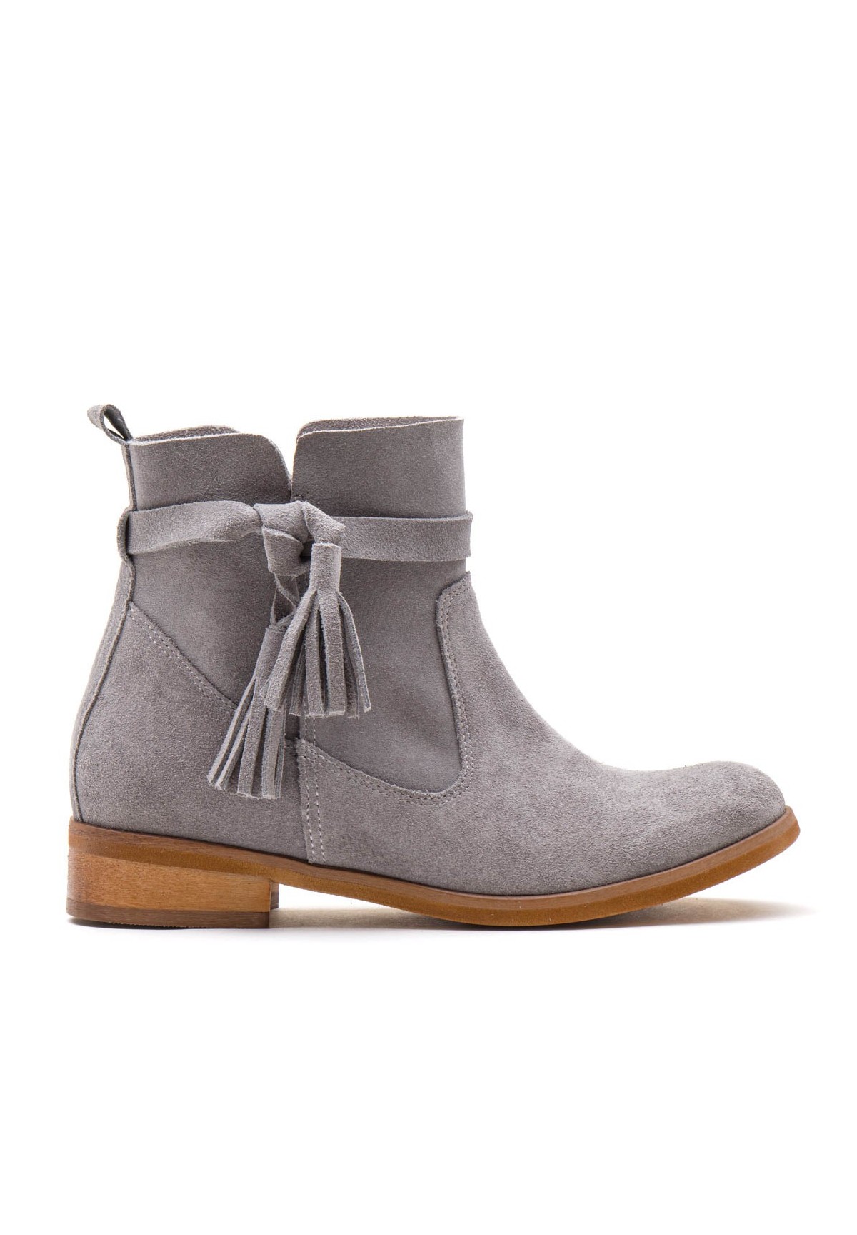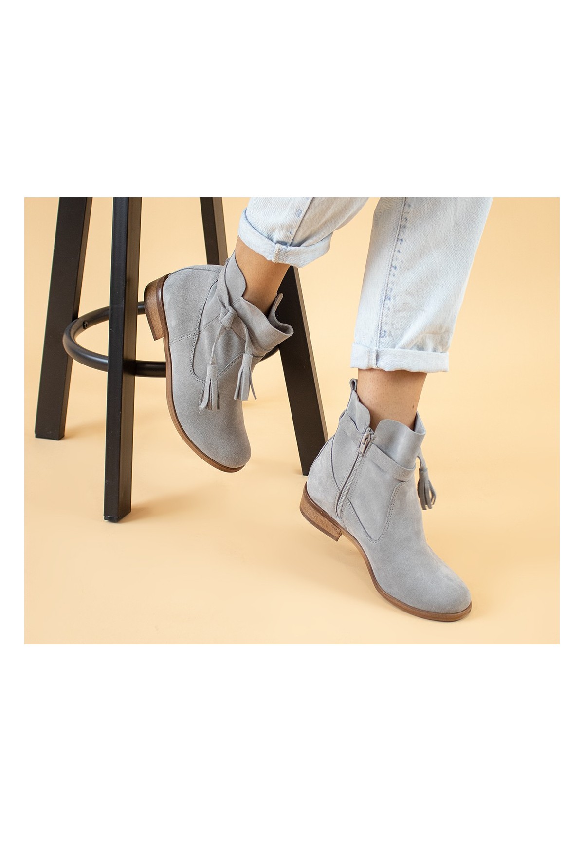 Botki damskie wykonane z naturalnej skóry welurowej w kolorze szarym. Zapinane na zamek. Buty osadzone na płaskiej podeszwie z niskim obcasem. Niezwykle wygodne. Wewnątrz znajduje się skórzana wkładka, zapewniająca komfort stopom. Ozdobione przy kostce ciekawym wiązaniem z frędzlami.