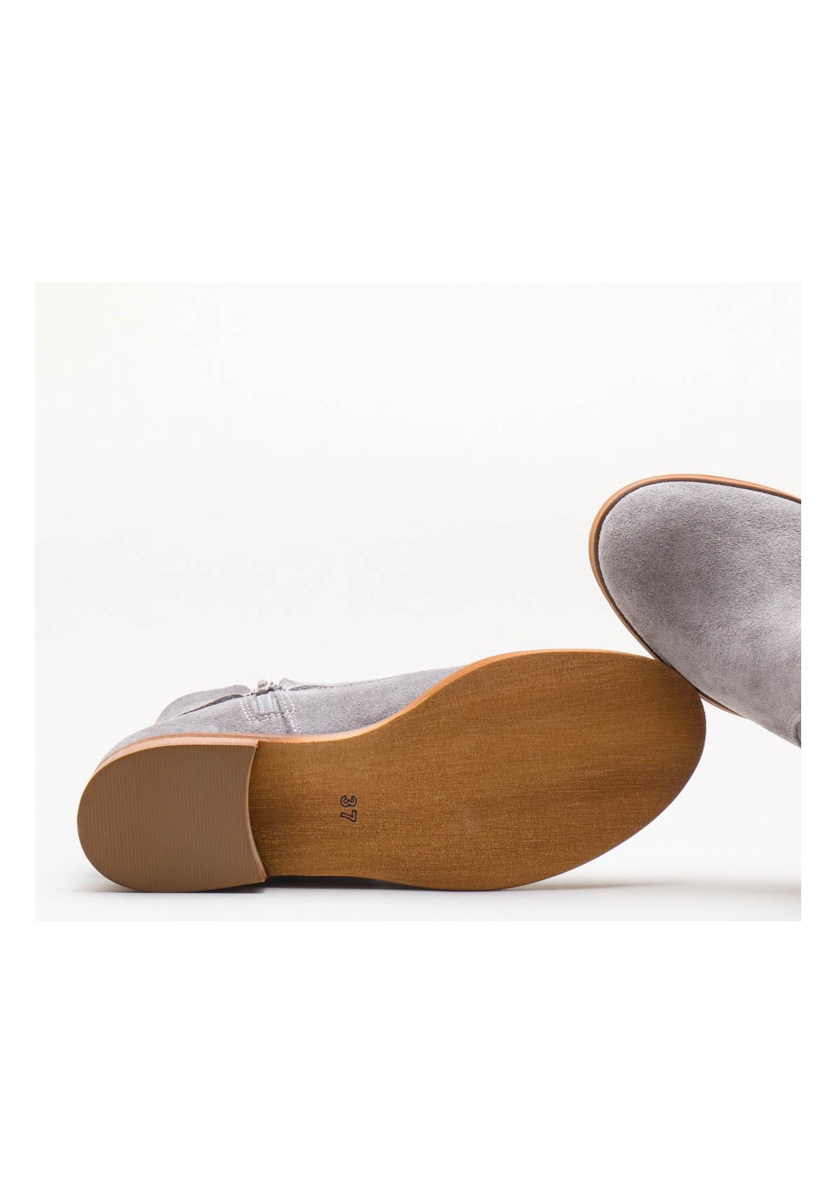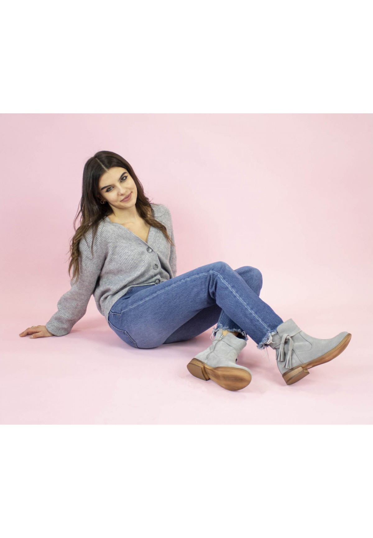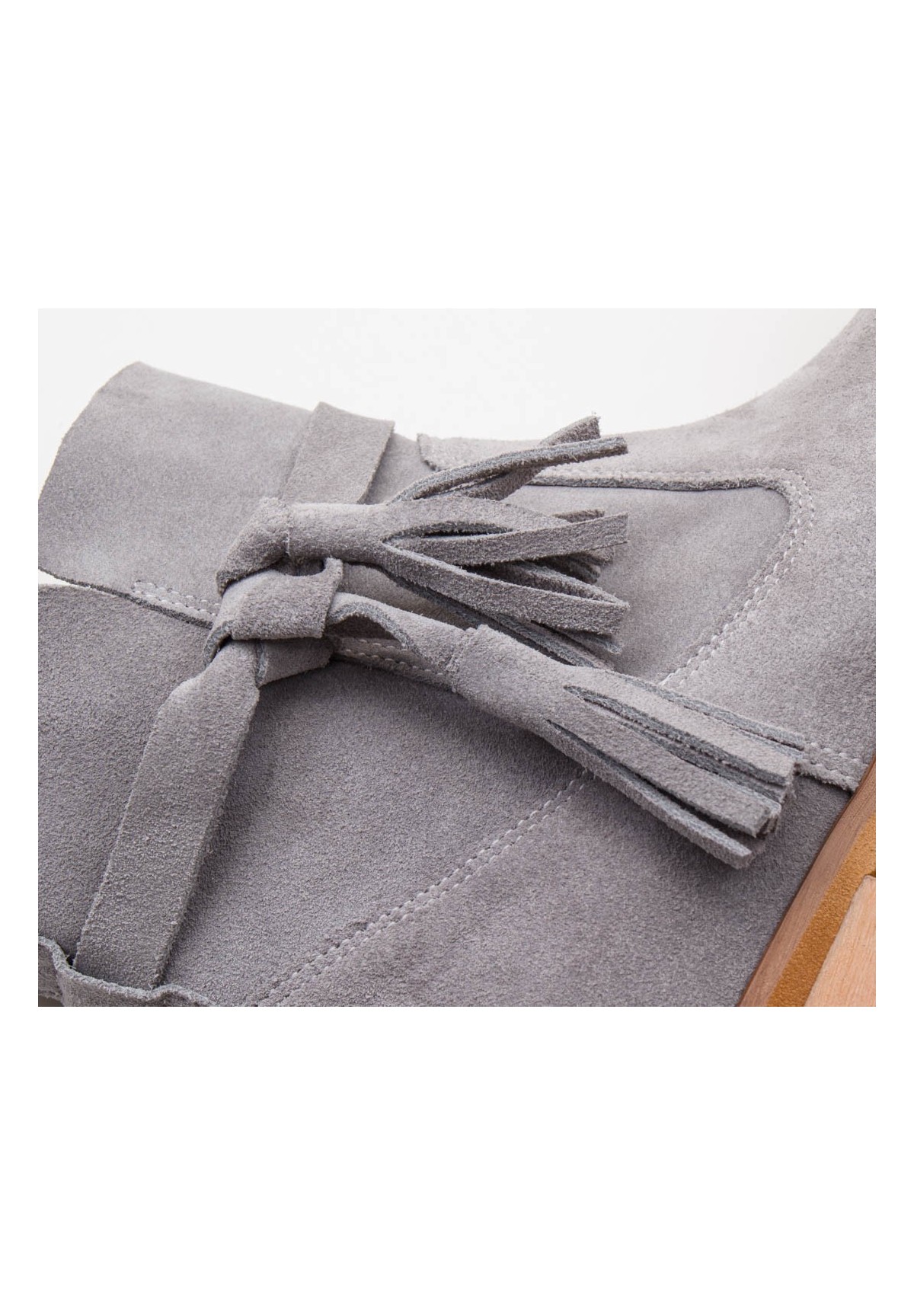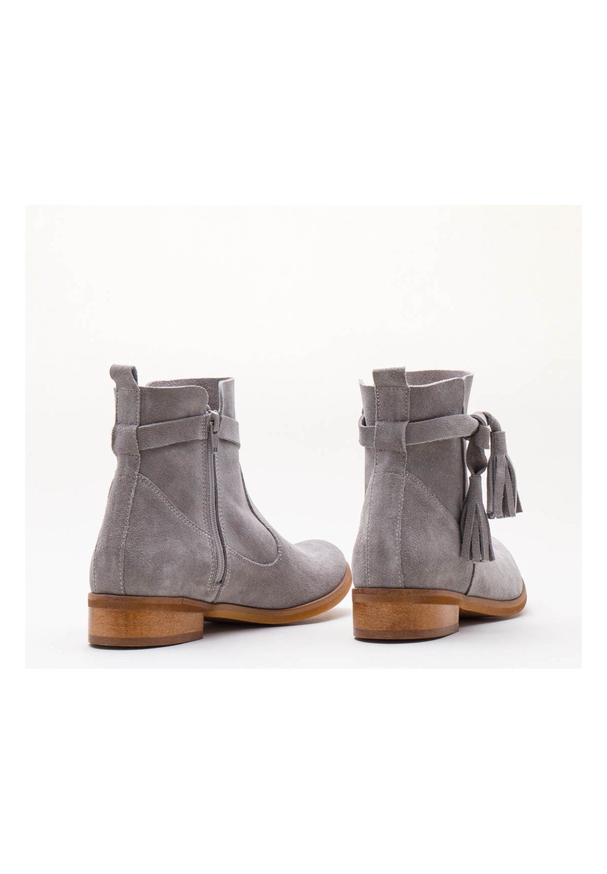 Botki damskie wykonane z naturalnej skóry welurowej w kolorze szarym. Zapinane na zamek. Buty osadzone na płaskiej podeszwie z niskim obcasem. Niezwykle wygodne. Wewnątrz znajduje się skórzana wkładka, zapewniająca komfort stopom. Ozdobione przy kostce ciekawym wiązaniem z frędzlami.