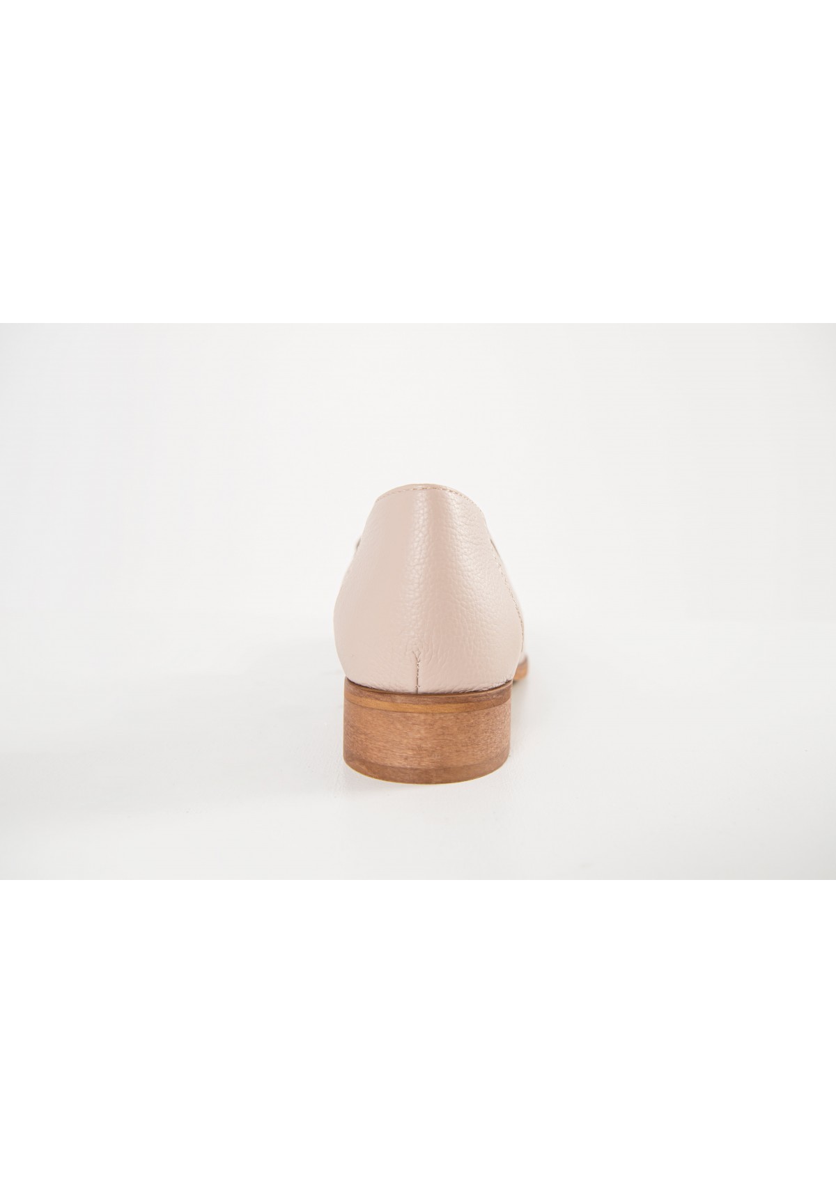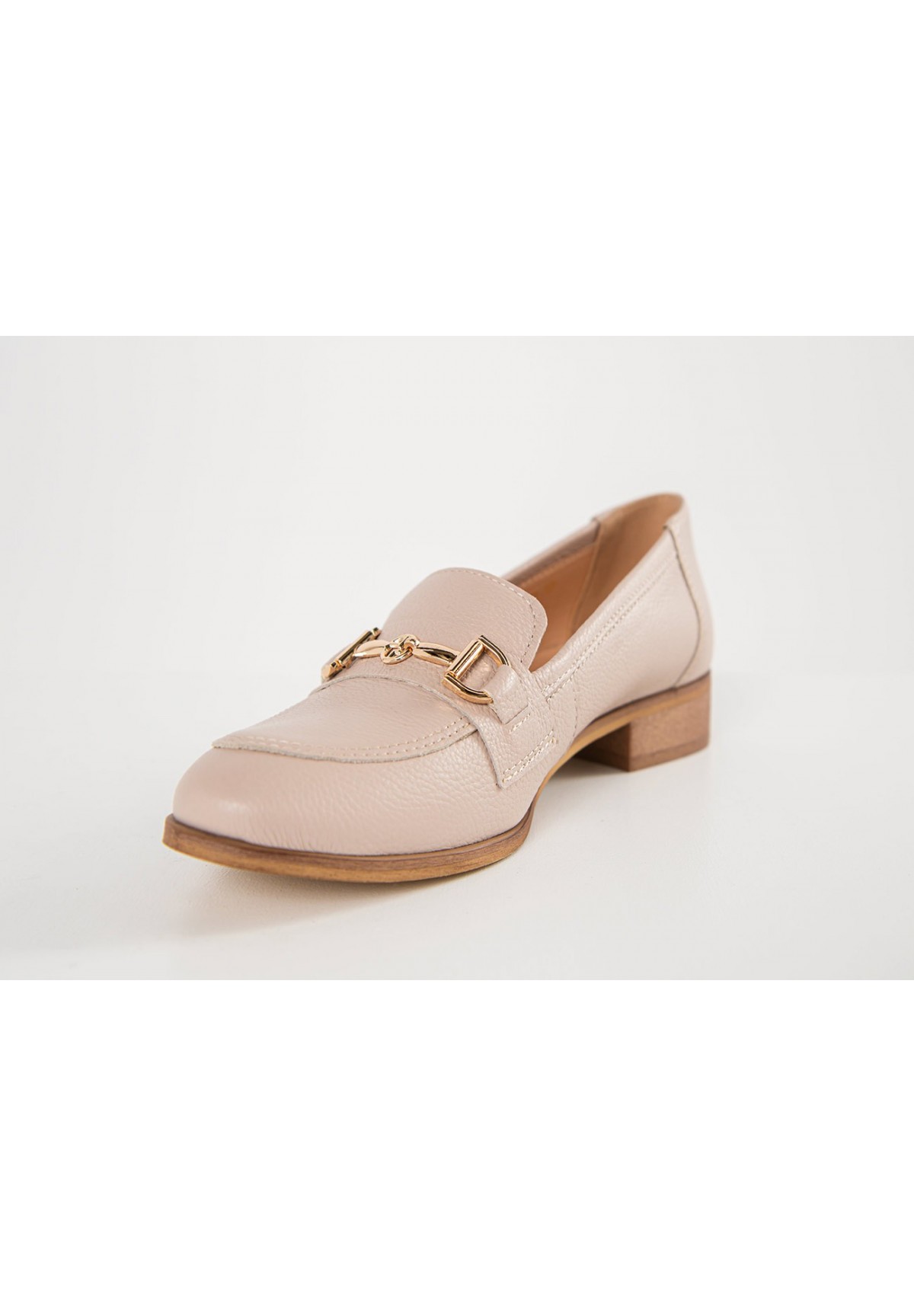 Klasyczne mokasyny damskie, wykonane z naturalnej skóry licowej w kolorze beżowym, zapewniają wygodę oraz trwałość. Wpiszą się idealnie w codzienną garderobę. Nosek przyozdobiony dekoracyjna złota klamrą. Wnętrze w całości wyścielone miękką skórą, co zapewnia stopie doskonałą cyrkulację powietrza. Buty mają ciekawie wyglądające obszycia i smukłą budowę. Świetnie sprawdzą się do spodni przed kostkę oraz zwiewnych sukienek.