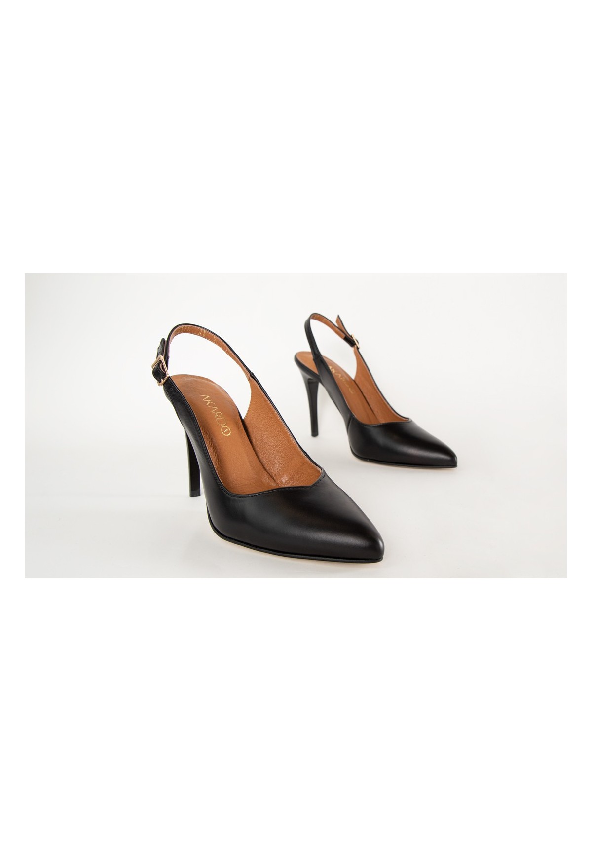 Czarne czółenka damskie na wysokim, wąskim obcasie. Pięknie prezentują się na nodze optycznie ją wyszczuplając. Wykonane z naturalnej, gładkiej skóry licowej, dzięki której są bardzo komfortowe. Model charakteryzuje się odkrytą piętą. Zapinane na regulowany pasek. Wewnątrz wyściełane wkładką ze skóry naturalnej zapobiegającej otarciom, z logo AKARDO. Kolor, z którego wykonane są buty, będzie pasował do wielu stylizacji.