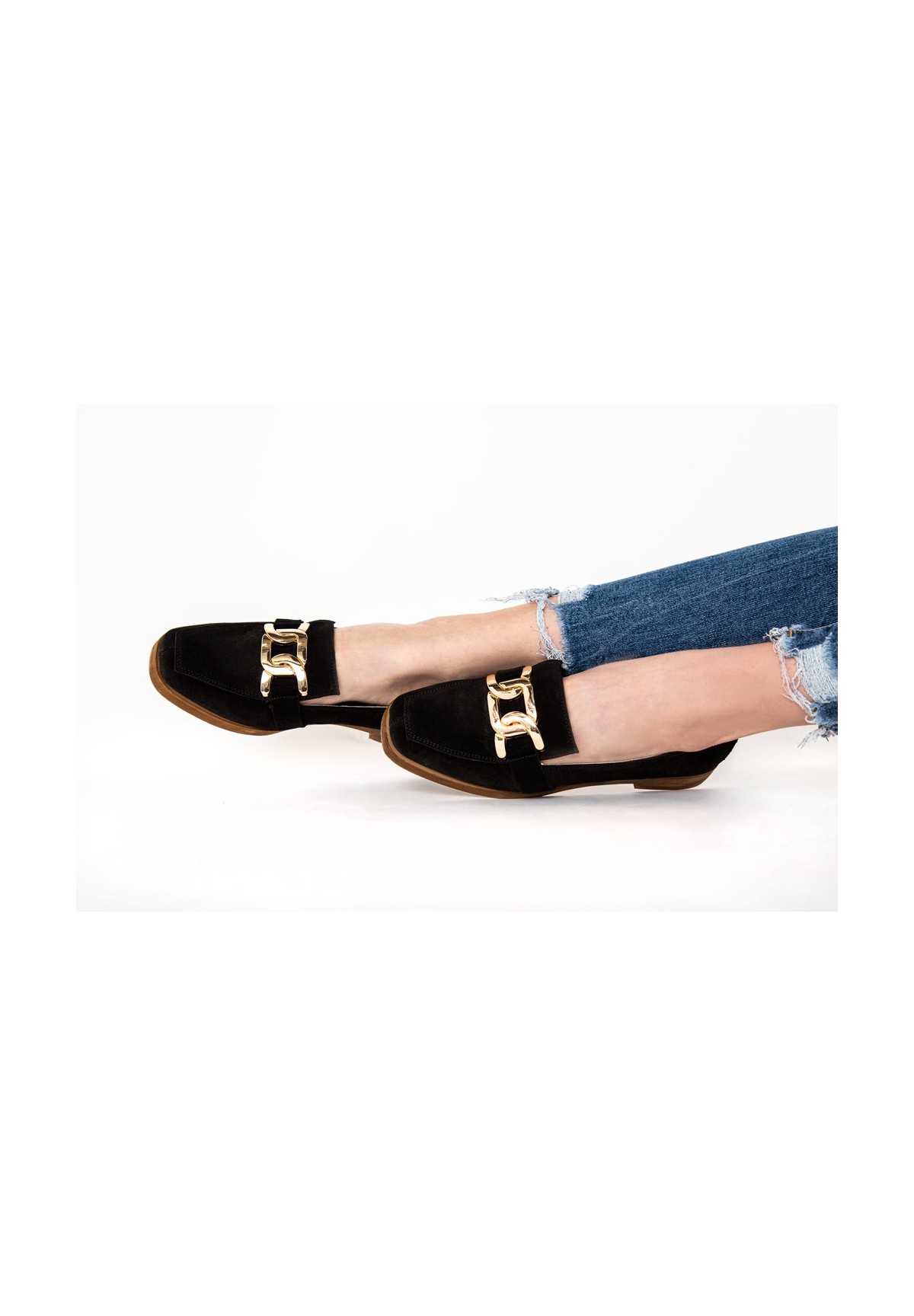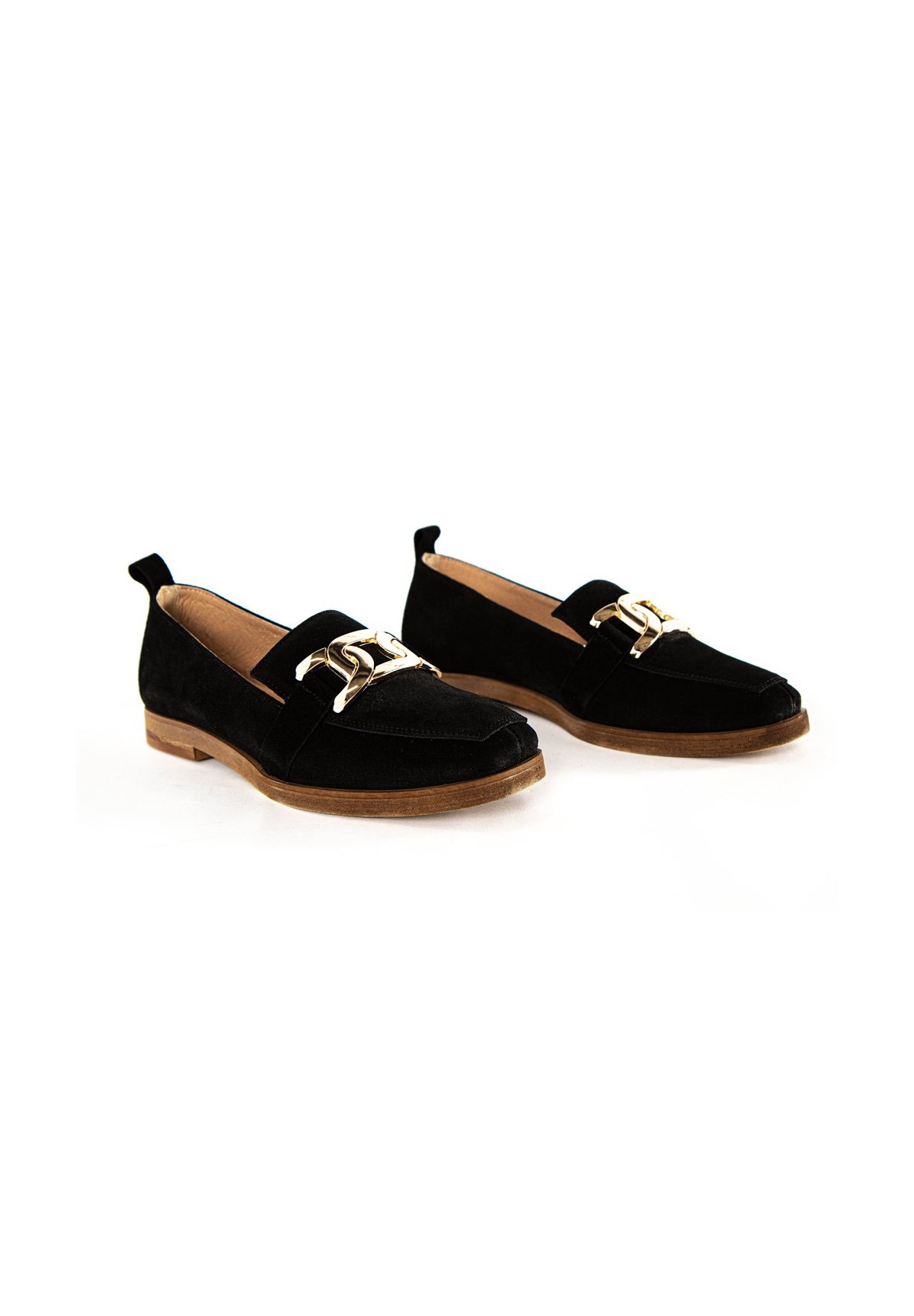 Mokasyny damskie, to idealne rozwiązanie dla kobiet ceniących wygodę i elegancję w jednym. Wykonane z naturalnej skóry licowej w kolorze czarnym, z pewnością zapewnią komfort podczas chodzenia. Nosek w kwadrat sprawia, że palce mają pełną swobodę ruchów, a naturalna wkładka zapobiega odparzaniu i obtarciu stopy. Model ozdobiony złotą klamrą, pełniącą funkcję dekoracyjną.