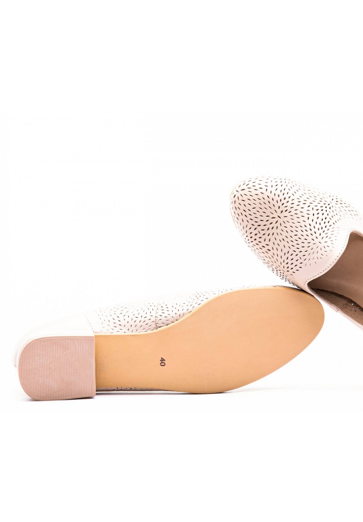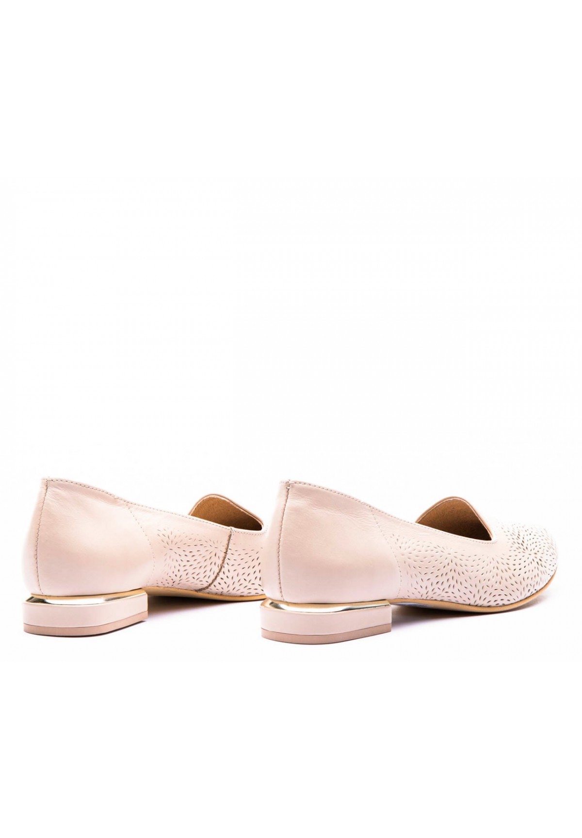 Ręcznie wykonane półbuty damskie, o klasycznym, beżowym kolorze. Stworzone z naturalnej, miękkiej skóry, dzięki której komfort użytkowania jest niezwykle wysoki. Skóra pokryta jest drobnym wytłaczanym wzorem, sprawiając, że ich wygląd nie jest banalny. Posiadają niski obcas ze złotą wstawką, dodającą elegancji. Buty doskonale sprawdzą się na co dzień, jak i do pracy.