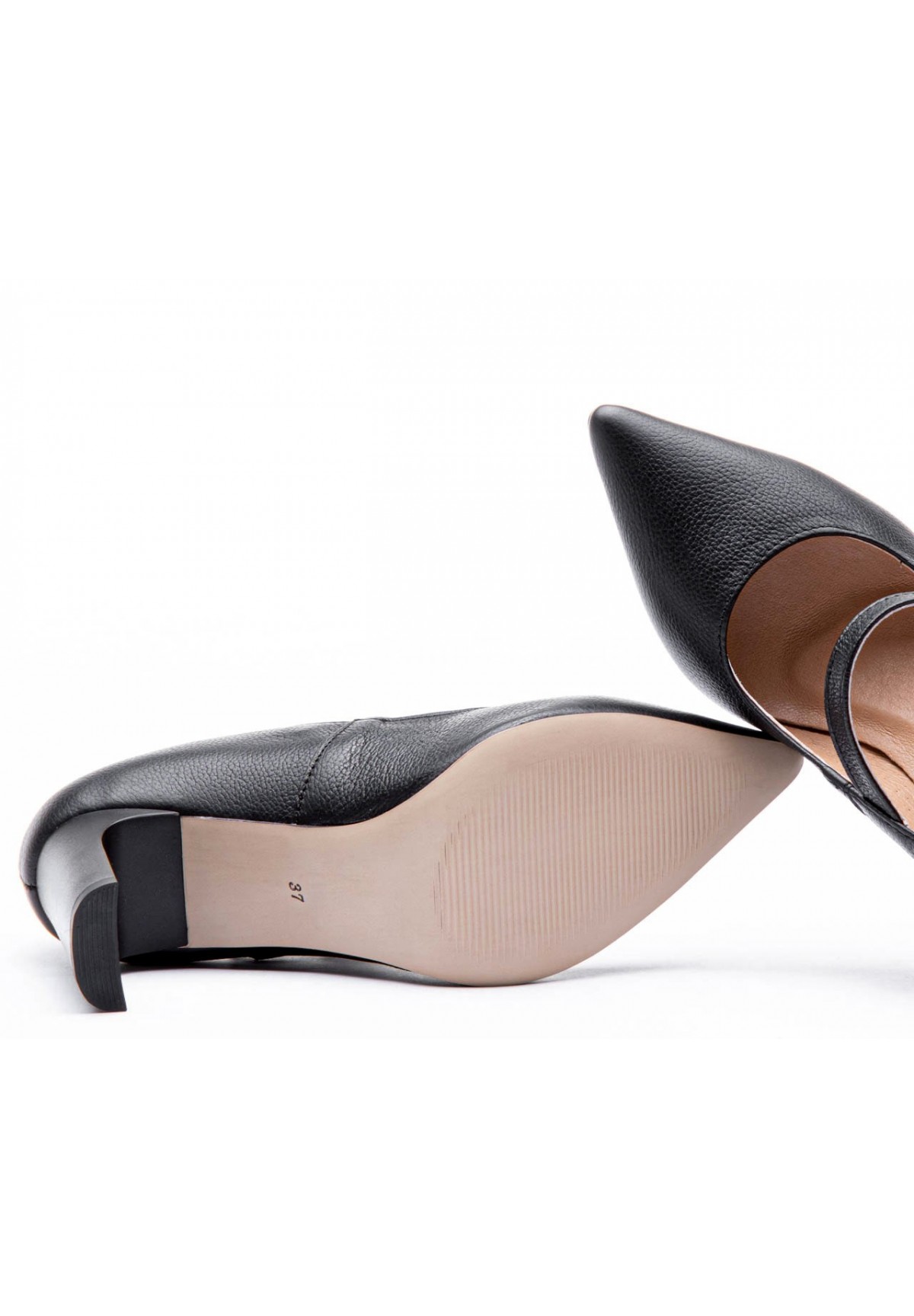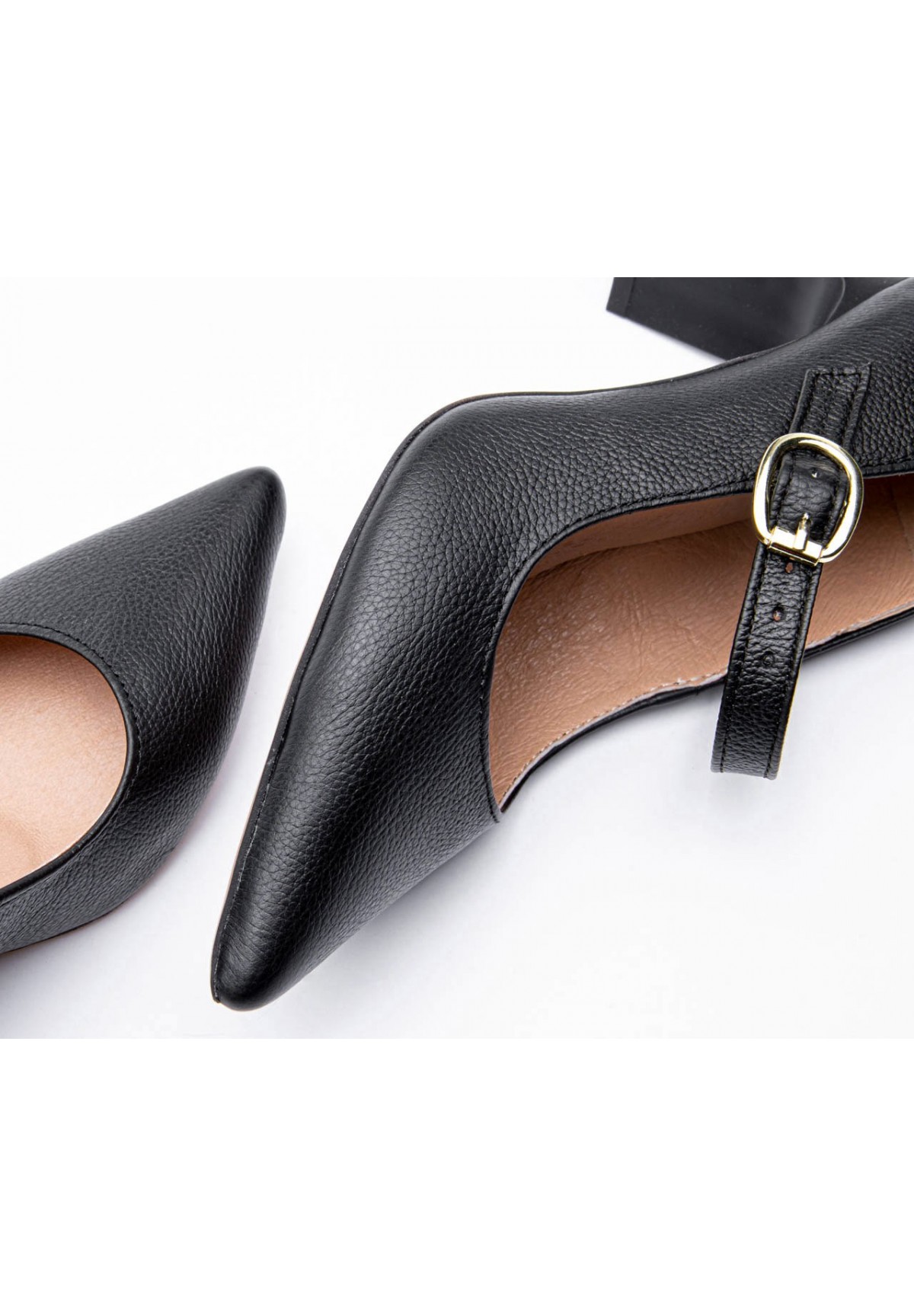 Czółenka damskie w klasycznej czerni dopełnią niejedną stylizacje. Wykonane z naturalnej skóry licowej, o groszkowej fakturze. Zdobione cienkim paskiem ze złotą sprzączką. Dzięki noskom w szpic optycznie wydłużają nogi. Średniej wielkości, szeroki obcas oraz miękka wyściółka zapewniają komfort użytkowania przez długi czas. Doskonałe zarówno na wielkie wyjścia, jak i do pracy.