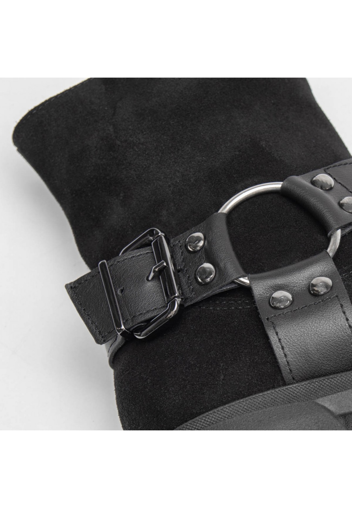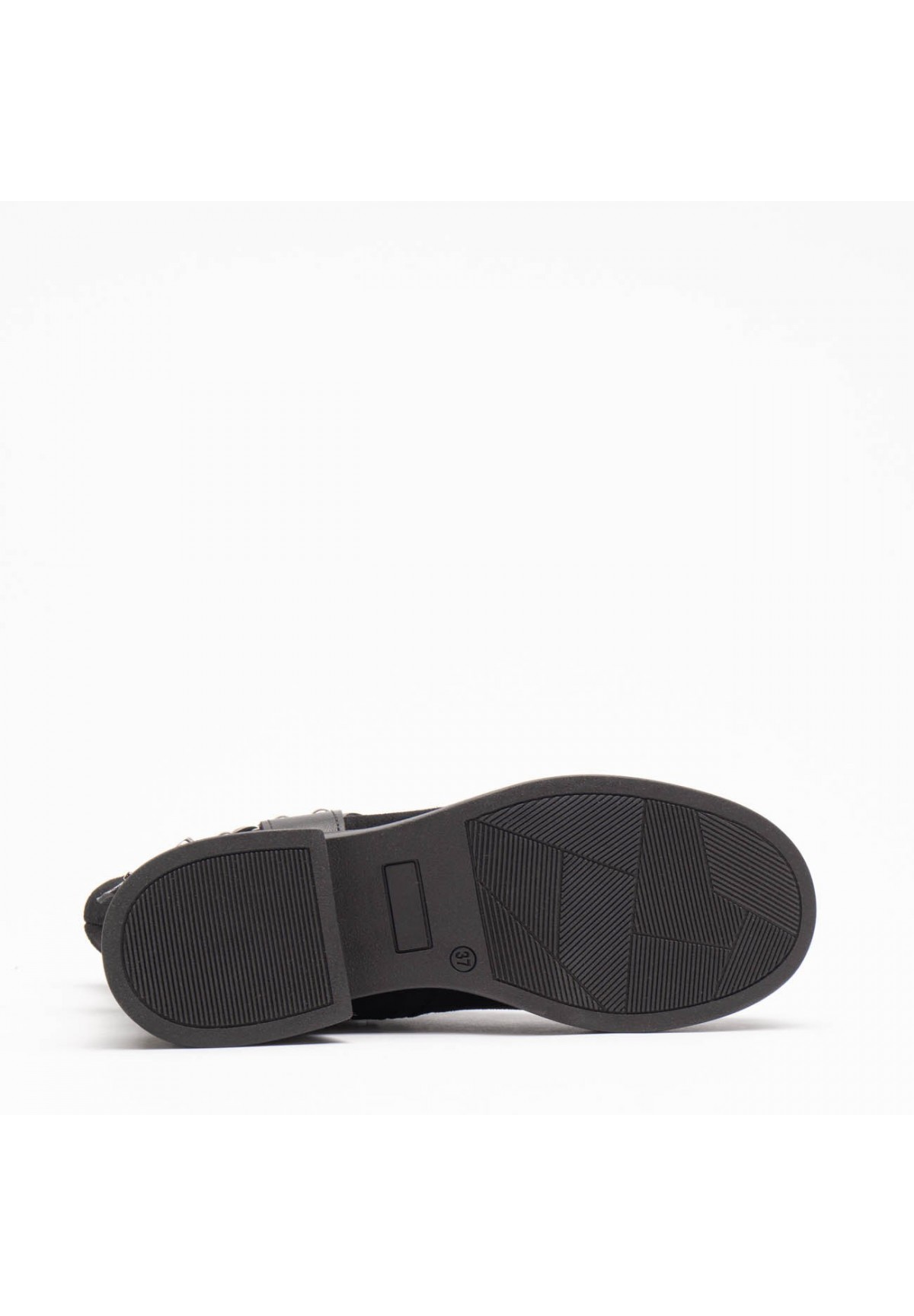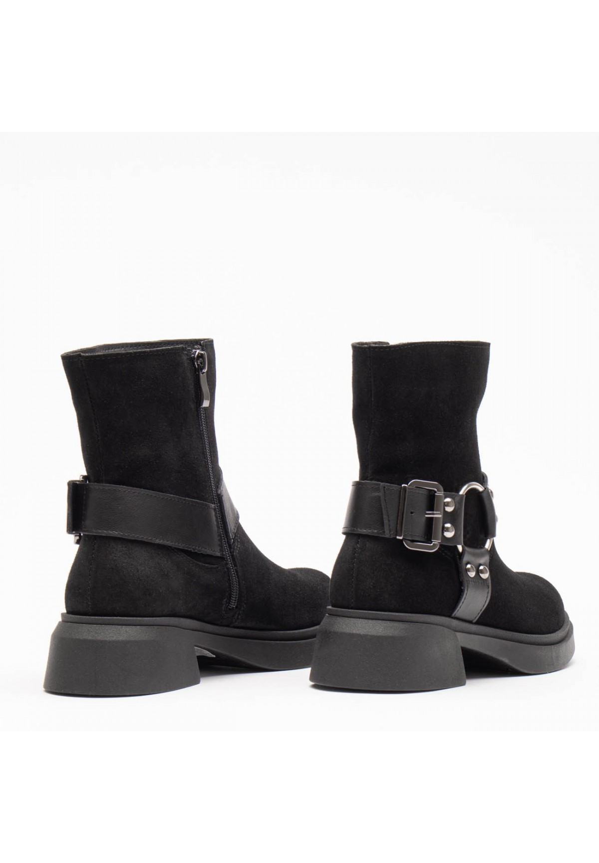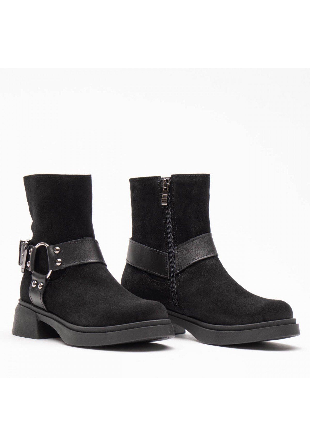 Botki damskie wykonane z luksusowej skóry naturalnej w welurowym wykończeniu, to niezwykle eleganckie i komfortowe obuwie, które doskonale sprawdzi się w wielu różnych okolicznościach. Ten model łączy w sobie wyjątkową jakość wykonania z modnym designem, tworząc buty, które z pewnością przyciągną uwagę. Podeszwa o grubości 2 cm zapewnia stabilność i wygodę podczas chodzenia. Dodatkowo, buty posiadają szeroki obcas o wysokości 4 cm, który nadaje im elegancji i pozwala na komfortowe chodzenie przez dłuższy czas. Zapięcie na zamek po wewnętrznej stronie ułatwia zakładanie i zdejmowanie botków, jednocześnie zachowując ich estetyczny wygląd. Dodatkowo ozdobione są one przy kostce trzema paskami ze skóry licowej z metalowym kołem i klamrą, co nadaje im wyjątkowego uroku i stylu.