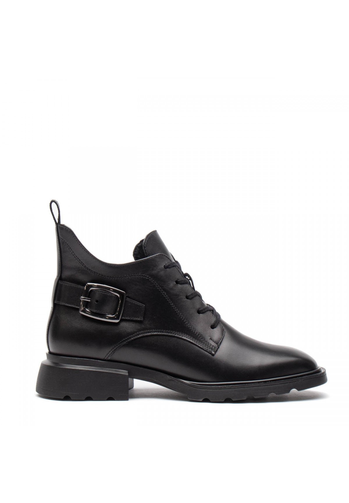 Botki damskie w kolorze czarnym to doskonałe połączenie stylu, wygody i funkcjonalności. Wykonane z wysokiej jakości skóry naturalnej licowej, te buty z pewnością staną się niezastąpionym elementem Twojej garderoby, szczególnie w okresie zimowym. Zewnętrzna strona botek zachwyca gładką, czarną skórą licową, która dodaje butom elegancji i trwałości. Dodatkowo, ozdobna klamra umieszczona na cholewce nadaje butom subtelnego, designerskiego charakteru. Kwadratowy nosek nadaje całości nowoczesnego wyglądu, a jednocześnie pozostaje przestronny, co sprzyja komfortowi noszenia.