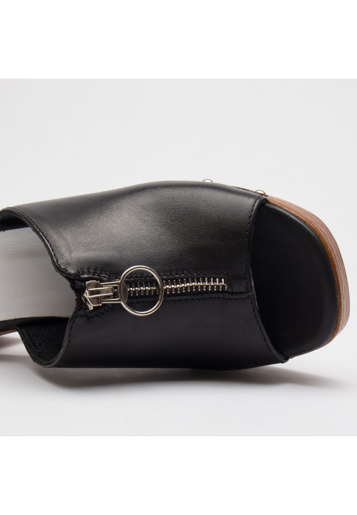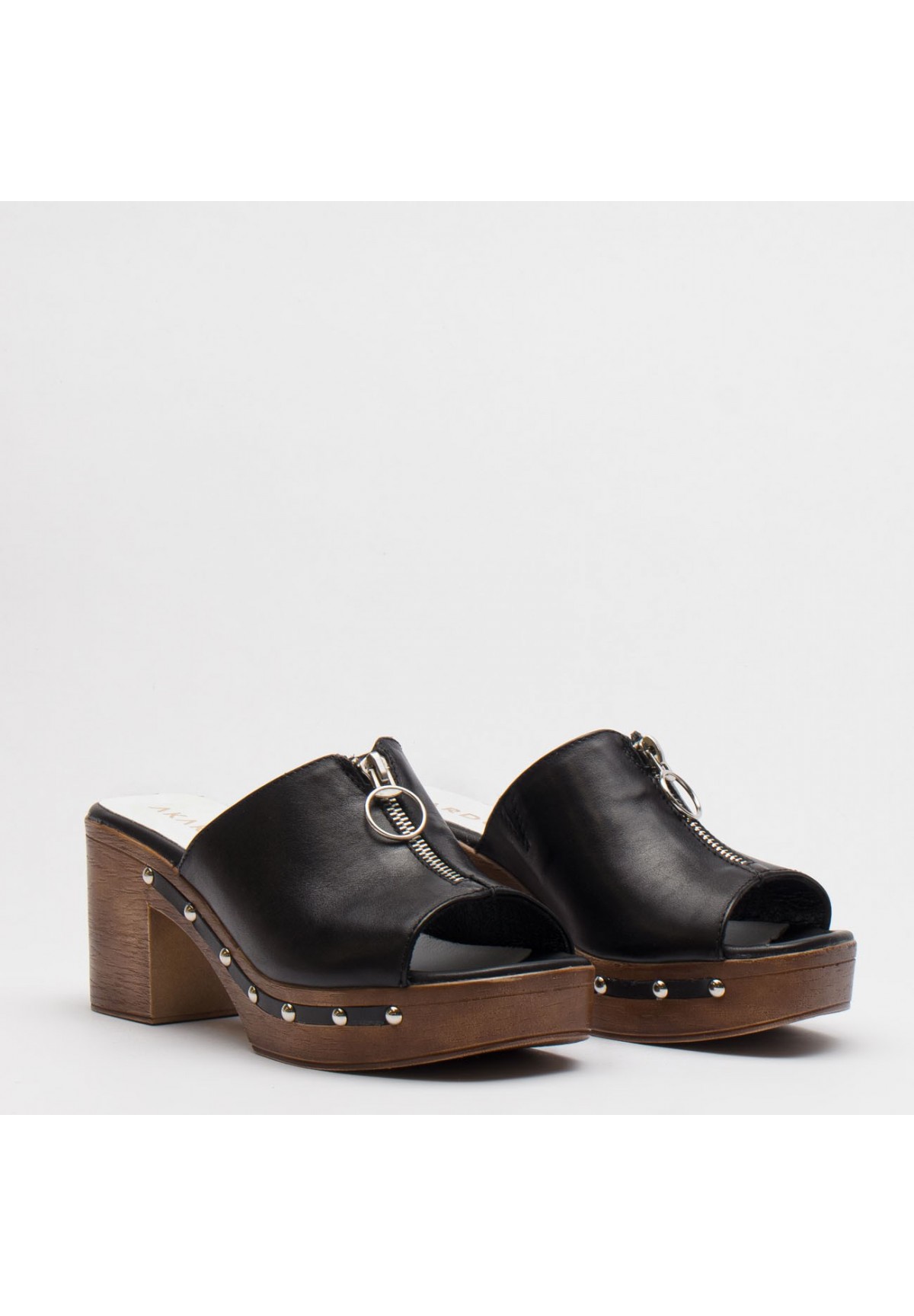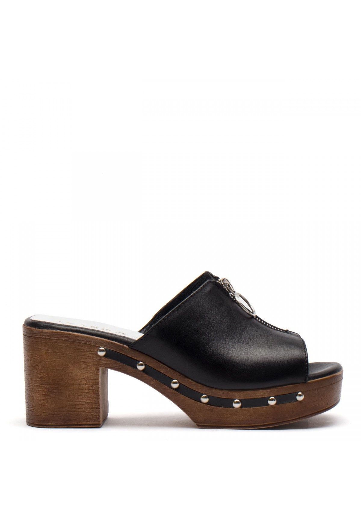 Zanurz się w niepowtarzalnym stylu retro z naszymi damskimi klapkami, inspirowanymi klasycznymi chodakami. Wykonane z wysokiej jakości naturalnej skóry licowej w czarnym kolorze, stanowią połączenie elegancji i wygody. Cholewka jest ozdobiona subtelnie imitacją zamka. Osadzone na solidnej platformie z obcasem typu słupek, zapewniają stabilność i pewność kroku. Podeszwa zdobiona nitami oraz skórzaną wstawką dodaje charakteru i stylu. Wnętrze wyściełane miękką, naturalną skórą zapewnia komfort noszenia przez cały dzień. Idealne dla tych, którzy cenią sobie nie tylko wygląd, ale także jakość i wygodę.