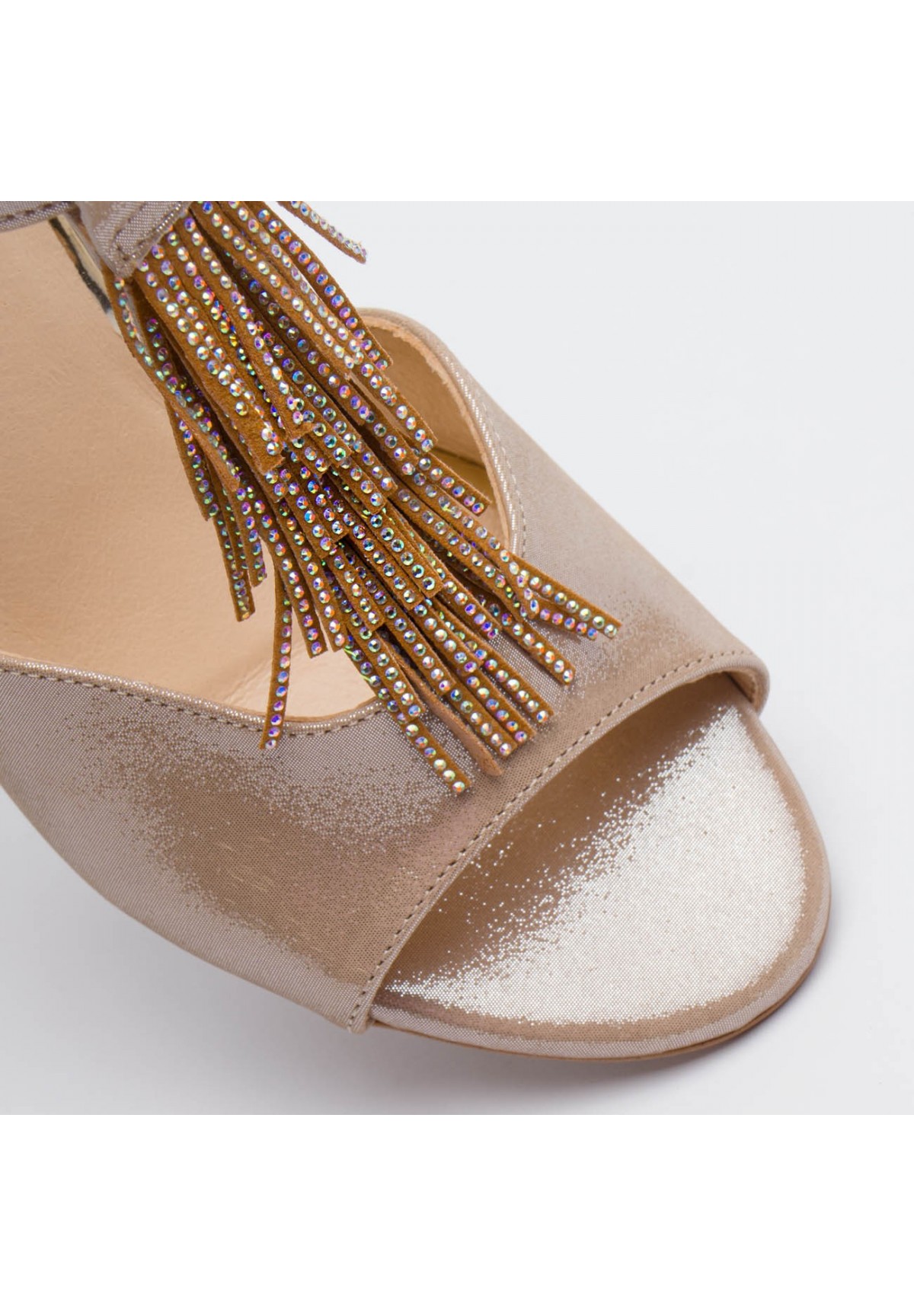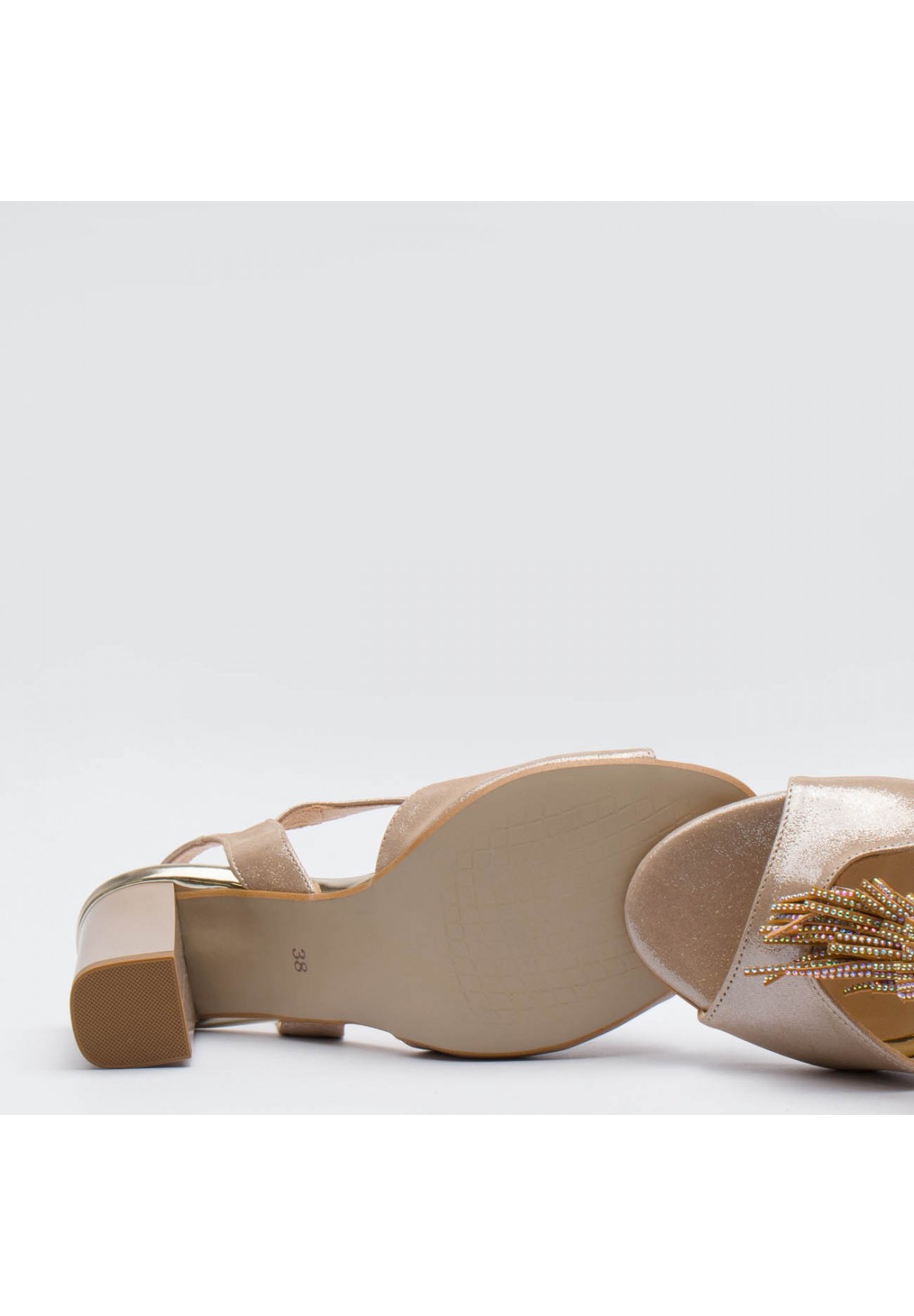 Zachwycające sandały damskie wykonane są z miękkiej skóry naturalnej zamszowej w eleganckim beżowym, połyskującym kolorze. Buty zdobione błyszczącymi elementami, które dodają im subtelnej elegancji i efektowności. Nosek oraz pięta sandałów są odkryte, co podkreśla urodę stóp i nadaje całości lekkości i wdzięku. Zapinane na wysokości kostki za pomocą sprzączki, co zapewnia precyzyjne dopasowanie i pewne trzymanie się stopy. Wyposażone są w wyższy, stabilny obcas, który nie tylko dodaje butom elegancji, ale także zapewnia komfort i pewność kroku. Wnętrze sandałów wyściełane jest wkładką ze skóry naturalnej, co gwarantuje nie tylko komfort noszenia, ale także dobrą wentylację i odpowiednie wsparcie dla stóp, nawet podczas długotrwałego użytkowania.
