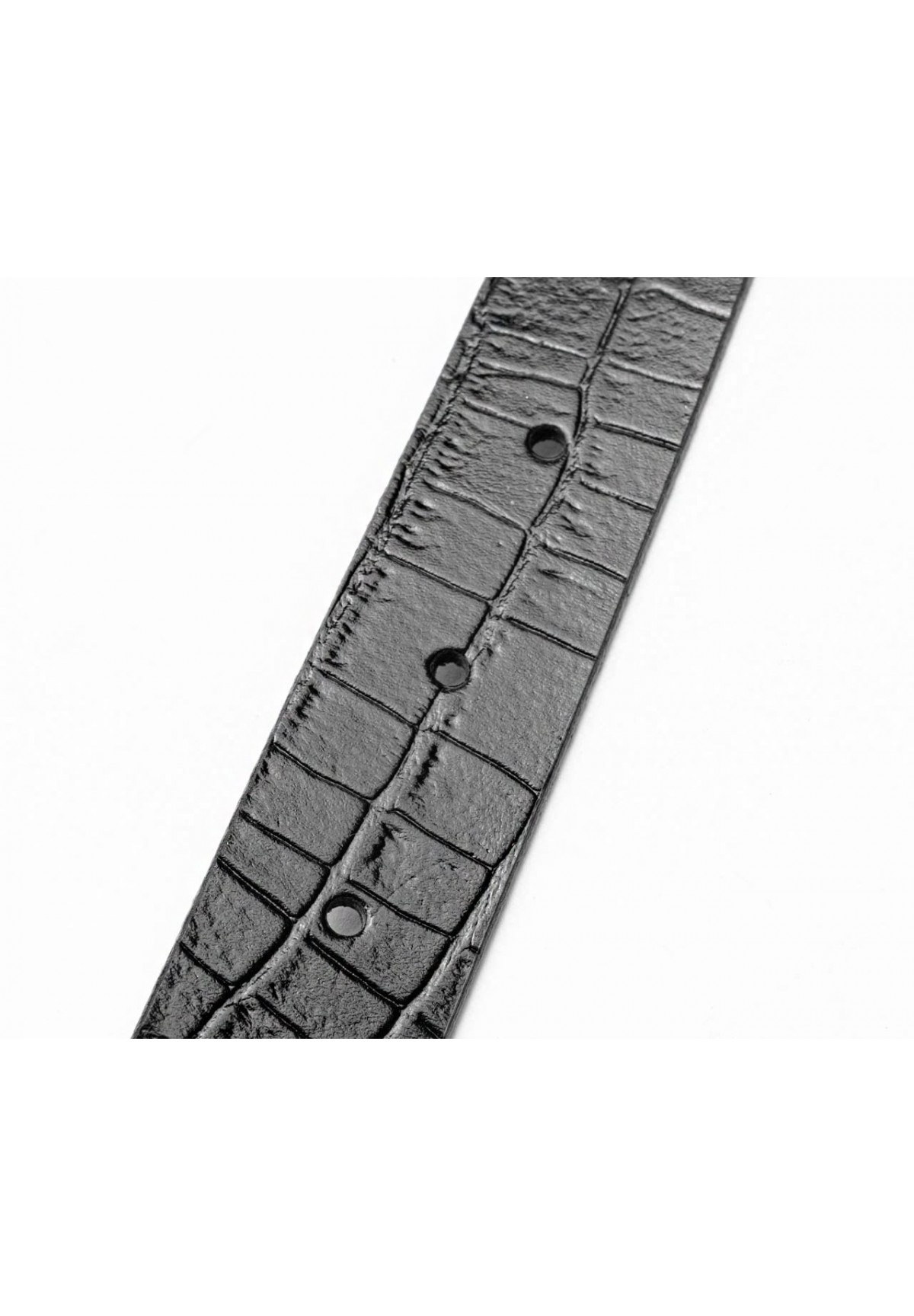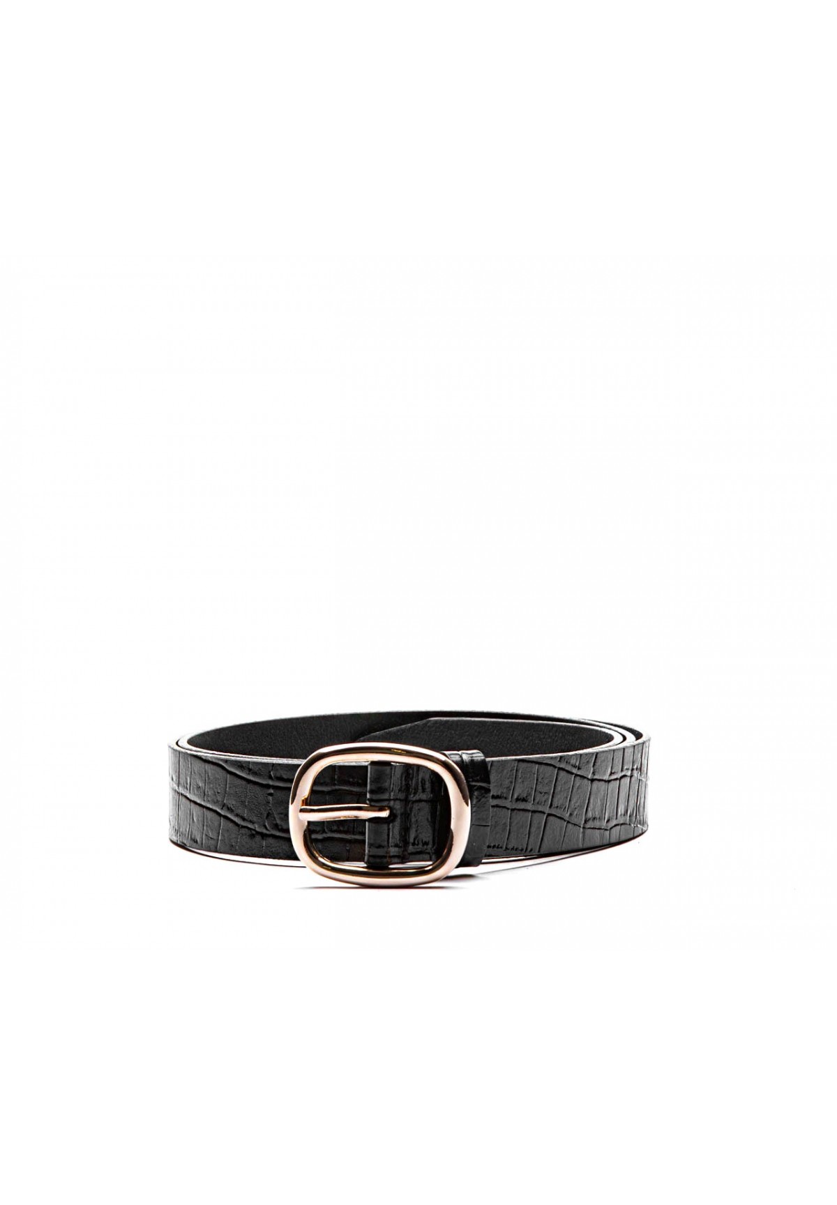 Elegancki pasek damski, wykonany z najwyższej jakości, tłoczonej skóry naturalnej w kolorze czarnym. Delikatnie błyszczący. Jako dodatek do sukienki czy swetra, świetnie podkreśli talię i z pewnością przyciągnie spojrzenia. Zapinany na złotą klamrę. Prezentowany model ma 3 cm szerokości.
