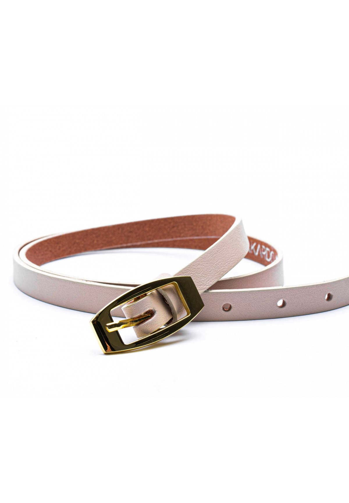 Stylowy pasek damski, zapinany za pomocą złotej klamry. Wykonany z naturalnej skóry licowej w uniwersalnym kolorze beżowym. Model o szerokości 1,5 cm, doda charakteru ulubionej stylizacji. Można go nosić do spodni, spódnic jak i sukienek. Wewnętrzna część paska z nadrukiem z logo AKARDO.