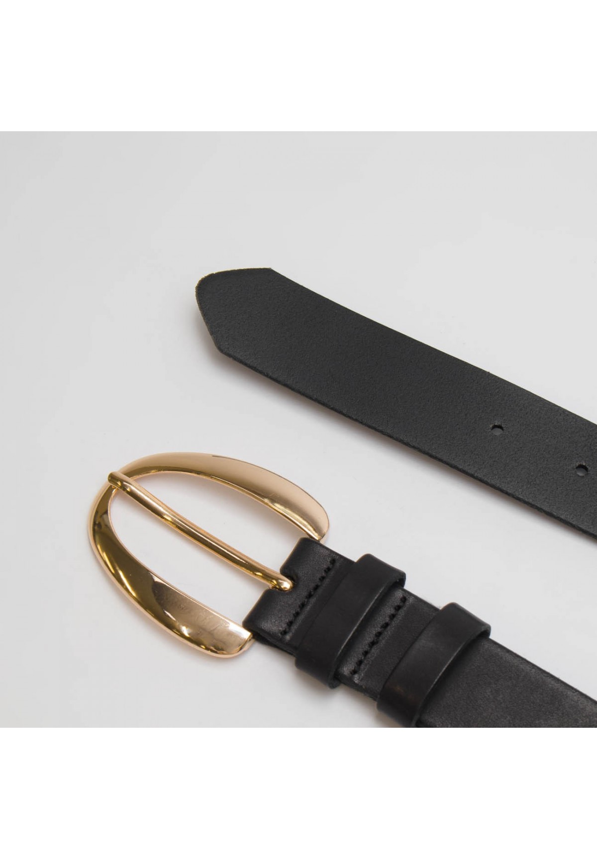 Pasek damski wykonany z najwyższej jakości naturalnej skóry licowej w głębokim, eleganckim, czarnym kolorze.  Jego szerokość wynosząca 3 cm nadaje mu proporcje idealne dla kobiecej sylwetki, równocześnie podkreślając styl i elegancję. Niezwykłą cechą tego paska jest jego klamra, która przyciąga uwagę swoim niebanalnym wzornictwem i wykończeniem. Klamra, wykonana z solidnego metalu w kolorze złotym, jest prawdziwym dziełem sztuki. Jej unikalny wzór sprawia, że pasek staje się nie tylko funkcjonalnym dodatkiem do stroju, ale również wyrazistym elementem designerskim. Skóra licowa użyta do produkcji paska jest miękka i przyjemna w dotyku, zapewniając nie tylko wygodę noszenia, ale również trwałość i elegancję.