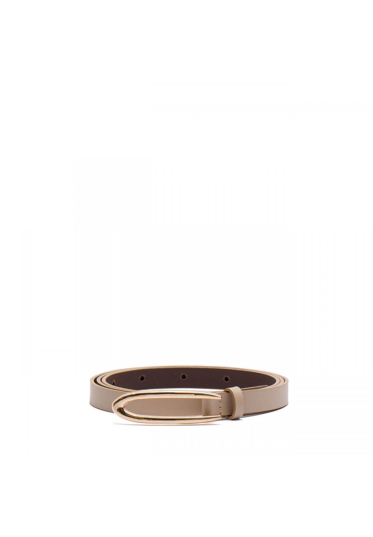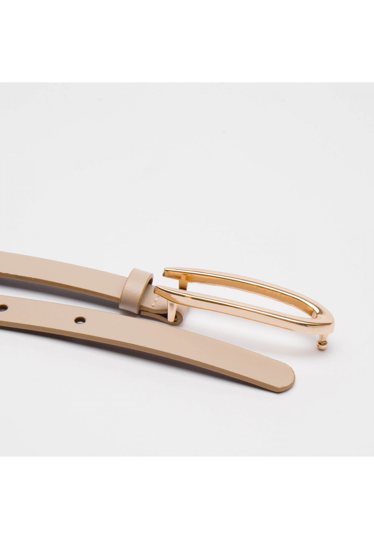 Cienki pasek damski w kolorze beżowym, wykonany z najwyższej jakości skóry naturalnej licowej, o gładkiej fakturze. Jego szerokość, wynosząca 1,5 cm, sprawia, że jest idealnym wyborem zarówno do codziennych, jak i bardziej formalnych stylizacji. Pasek posiada niebanalną klamrę, która nadaje mu charakter.