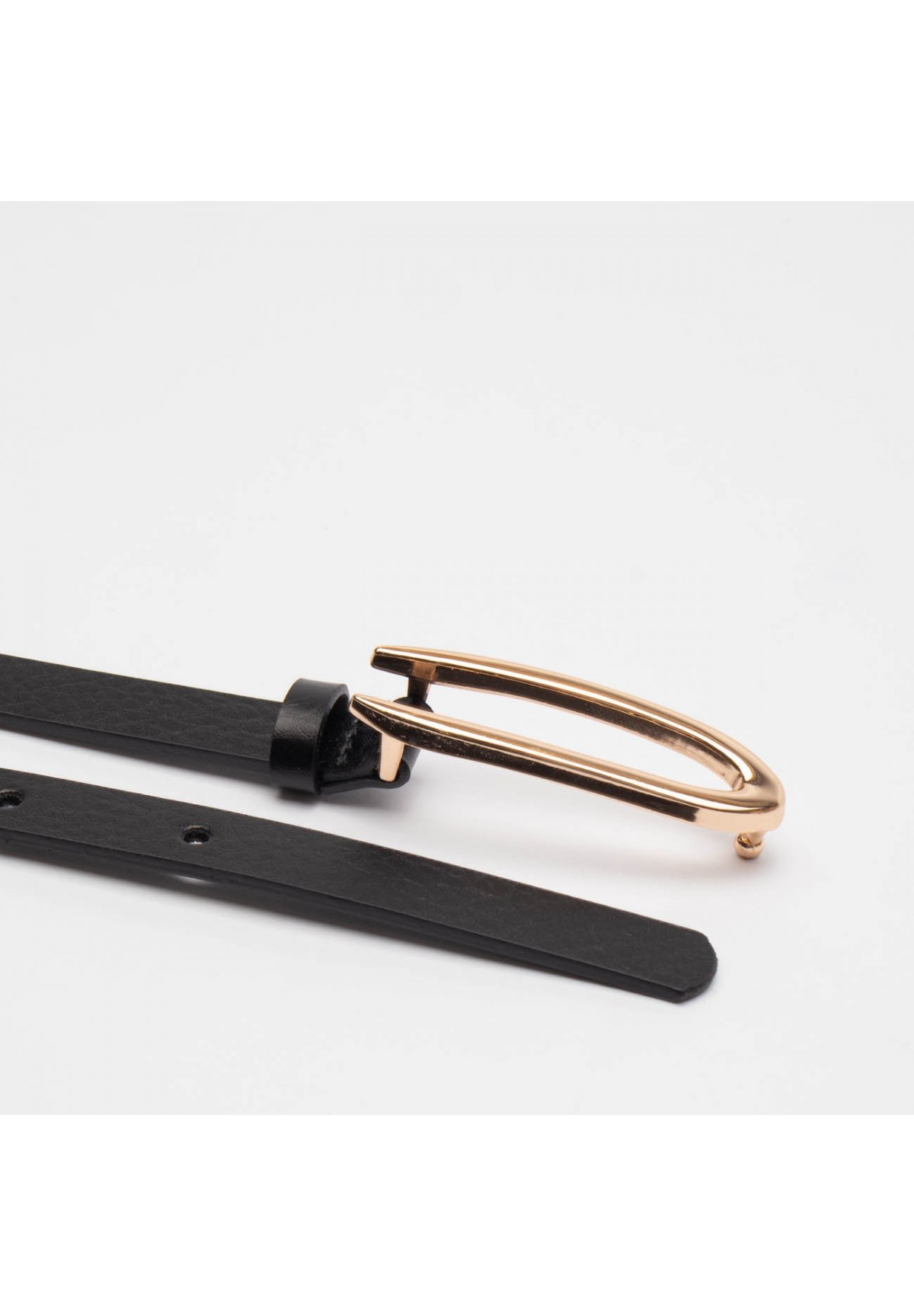 Cienki pasek damski w kolorze czarnym, wykonany z najwyższej jakości skóry naturalnej licowej, o groszkowanej fakturze. Jego szerokość, wynosząca 1,5 cm, sprawia, że jest idealnym wyborem zarówno do codziennych, jak i bardziej formalnych stylizacji. Pasek posiada niebanalną klamrę, która nadaje mu charakter.