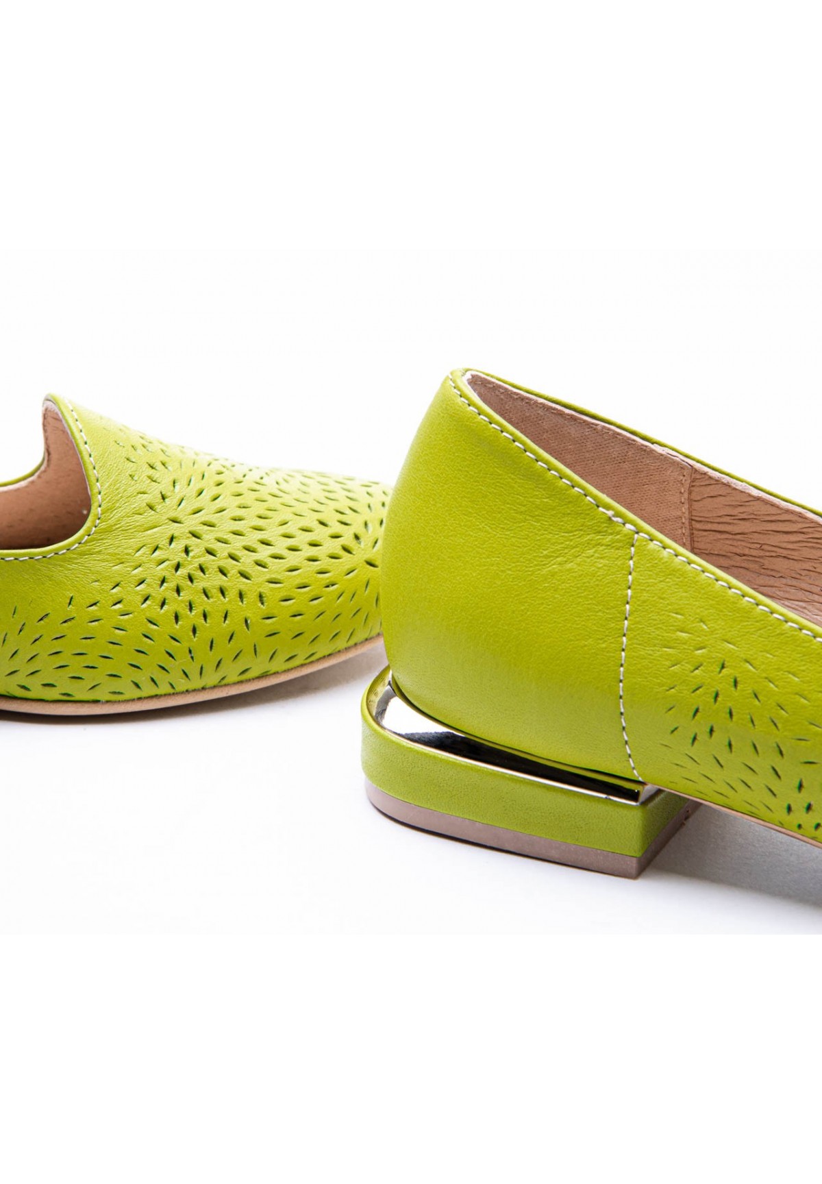 Ręcznie wykonane półbuty damskie, o nietuzinkowym, limonkowym kolorze. Stworzone z naturalnej, miękkiej skóry, dzięki której komfort użytkowania jest niezwykle wysoki. Skóra pokryta jest drobnym wytłaczanym wzorem, sprawiając, że ich wygląd nie jest banalny. Posiadają niski obcas ze złotą wstawką, dodającą elegancji. Buty doskonale sprawdzą się na co dzień, jak i do pracy.