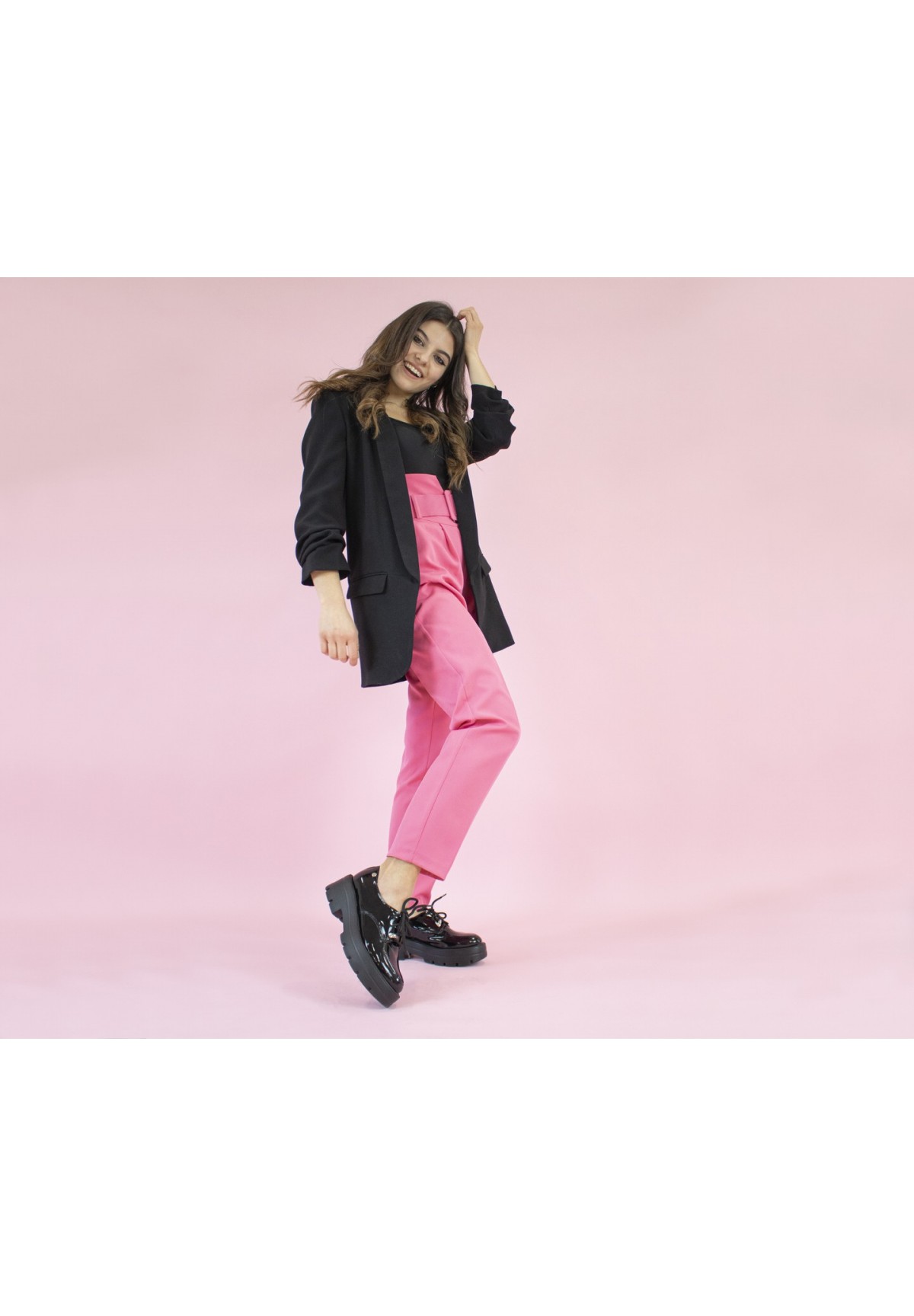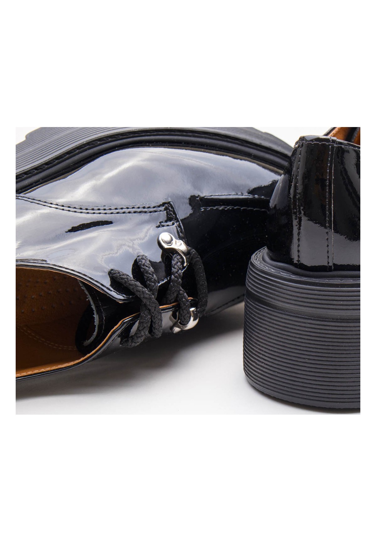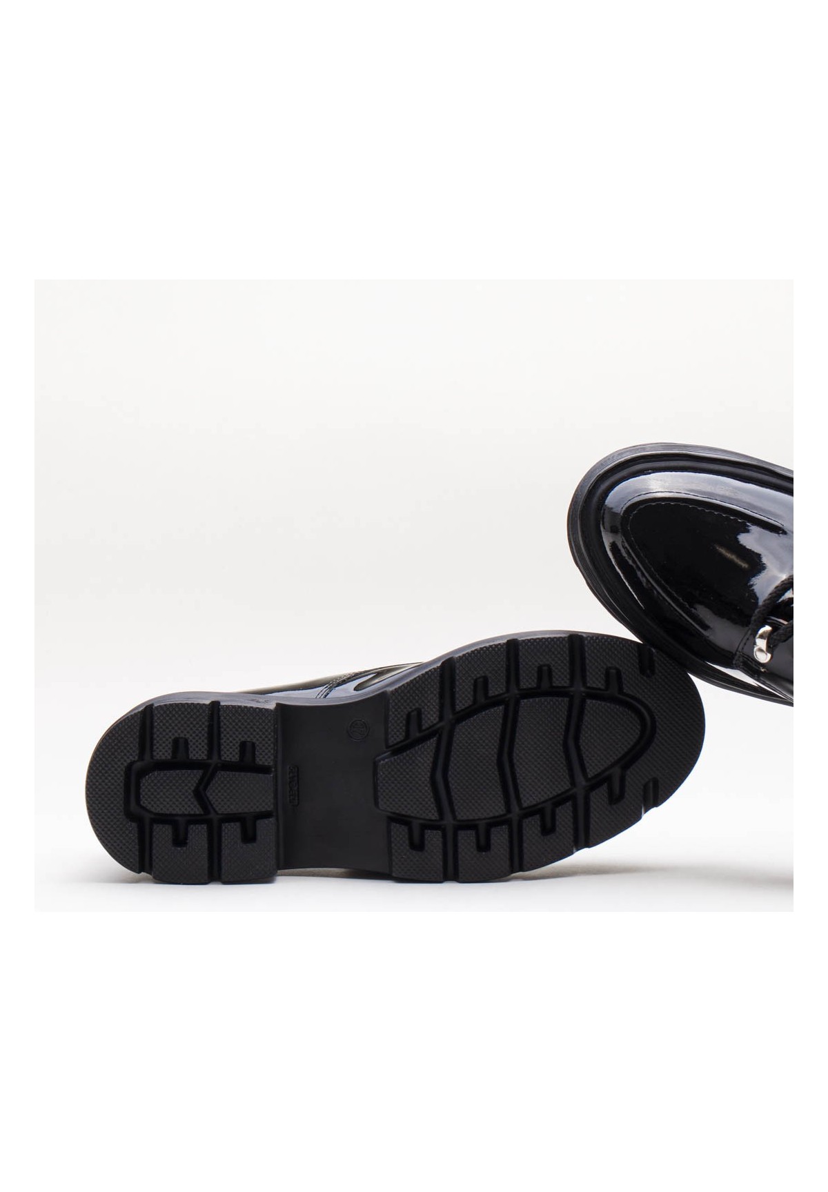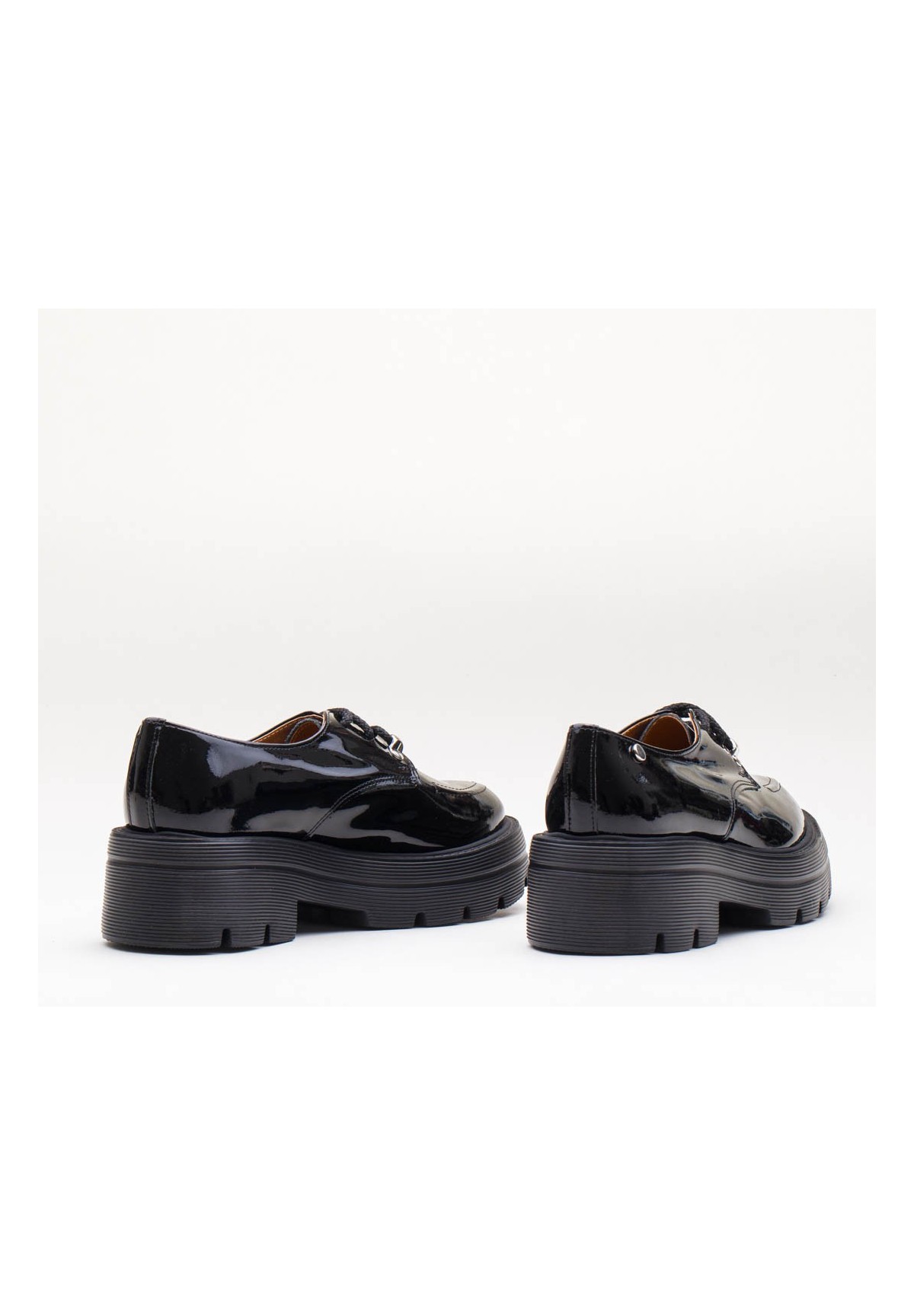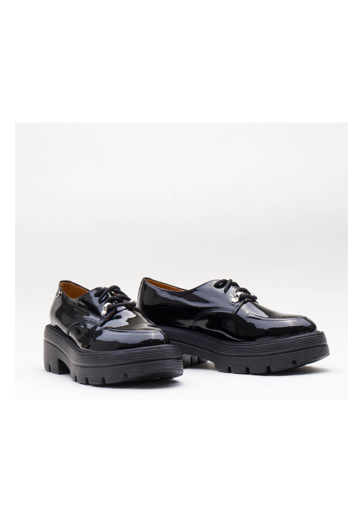 Czarne półbuty wykonane z naturalnej skóry lakierowanej na grubej podeszwie. Wiązane na sznurowadła.