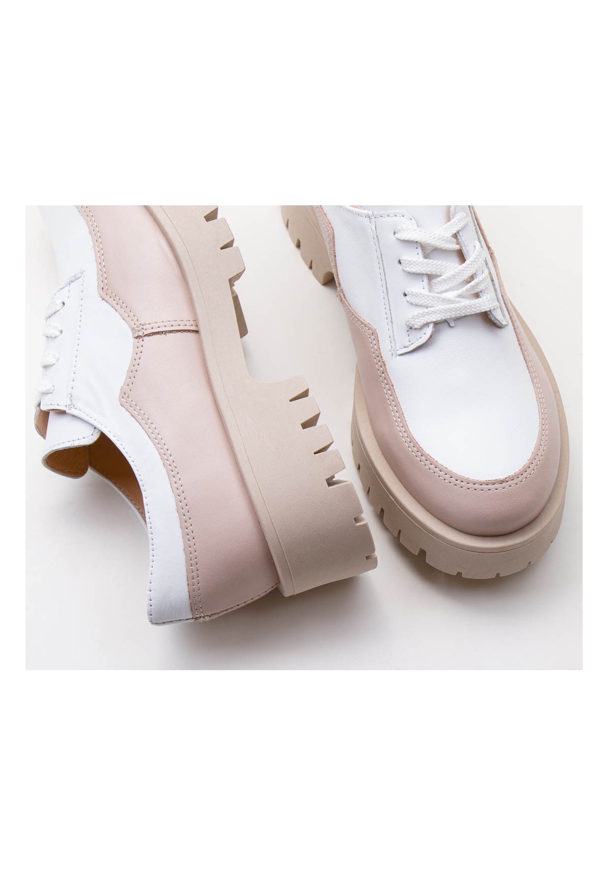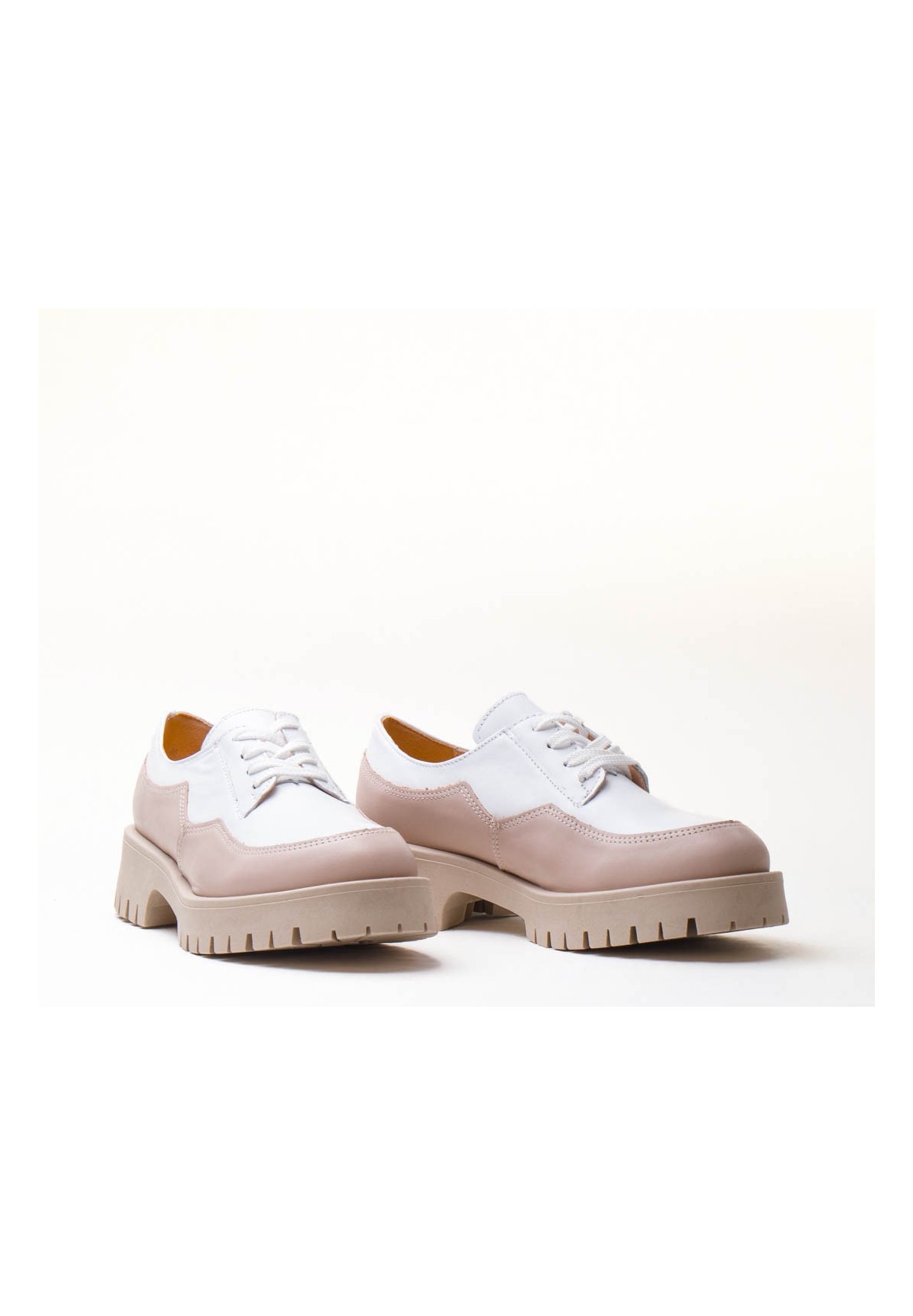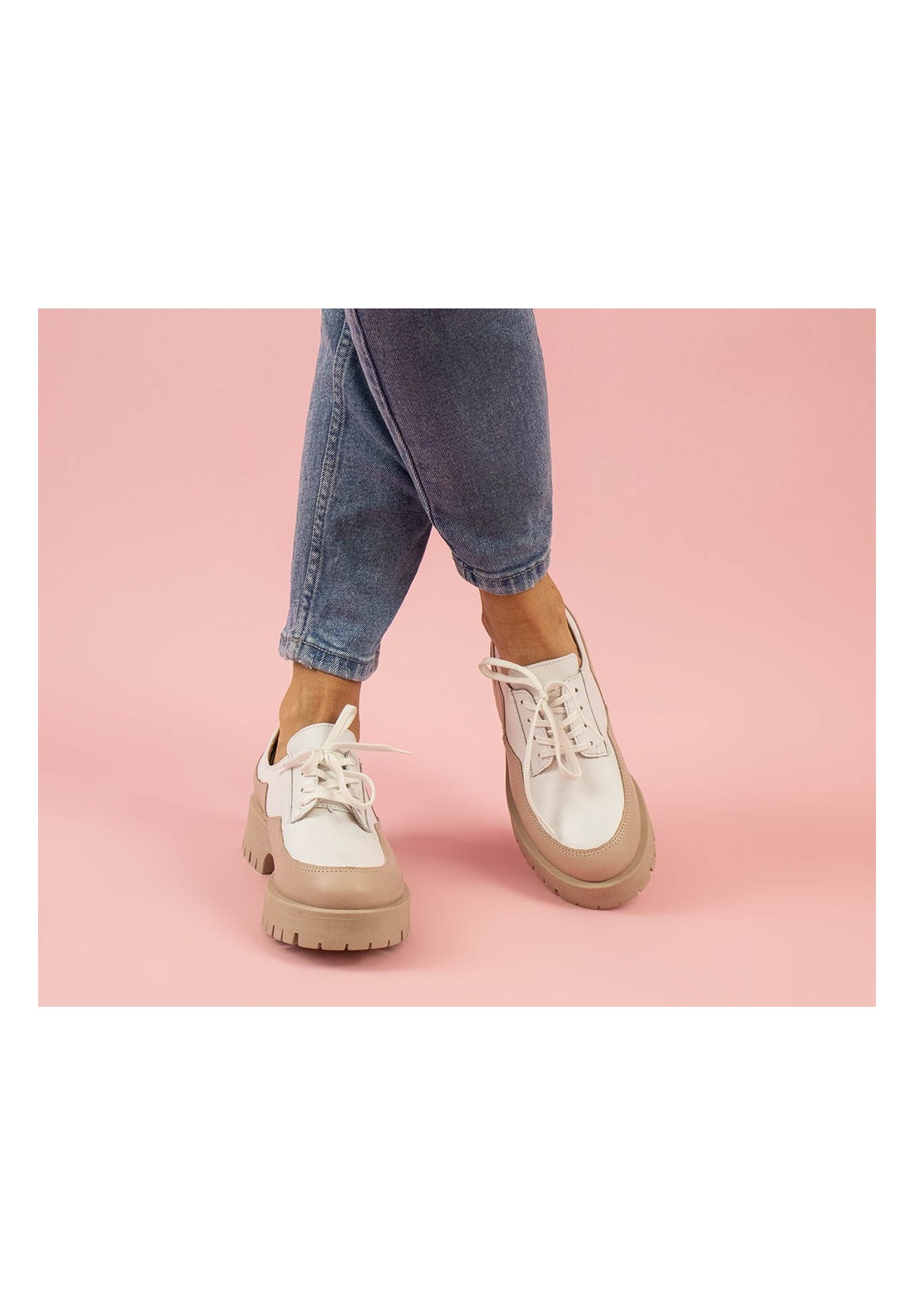 Biało-beżowe półbuty wykonane z naturalnej skóry licowej.
