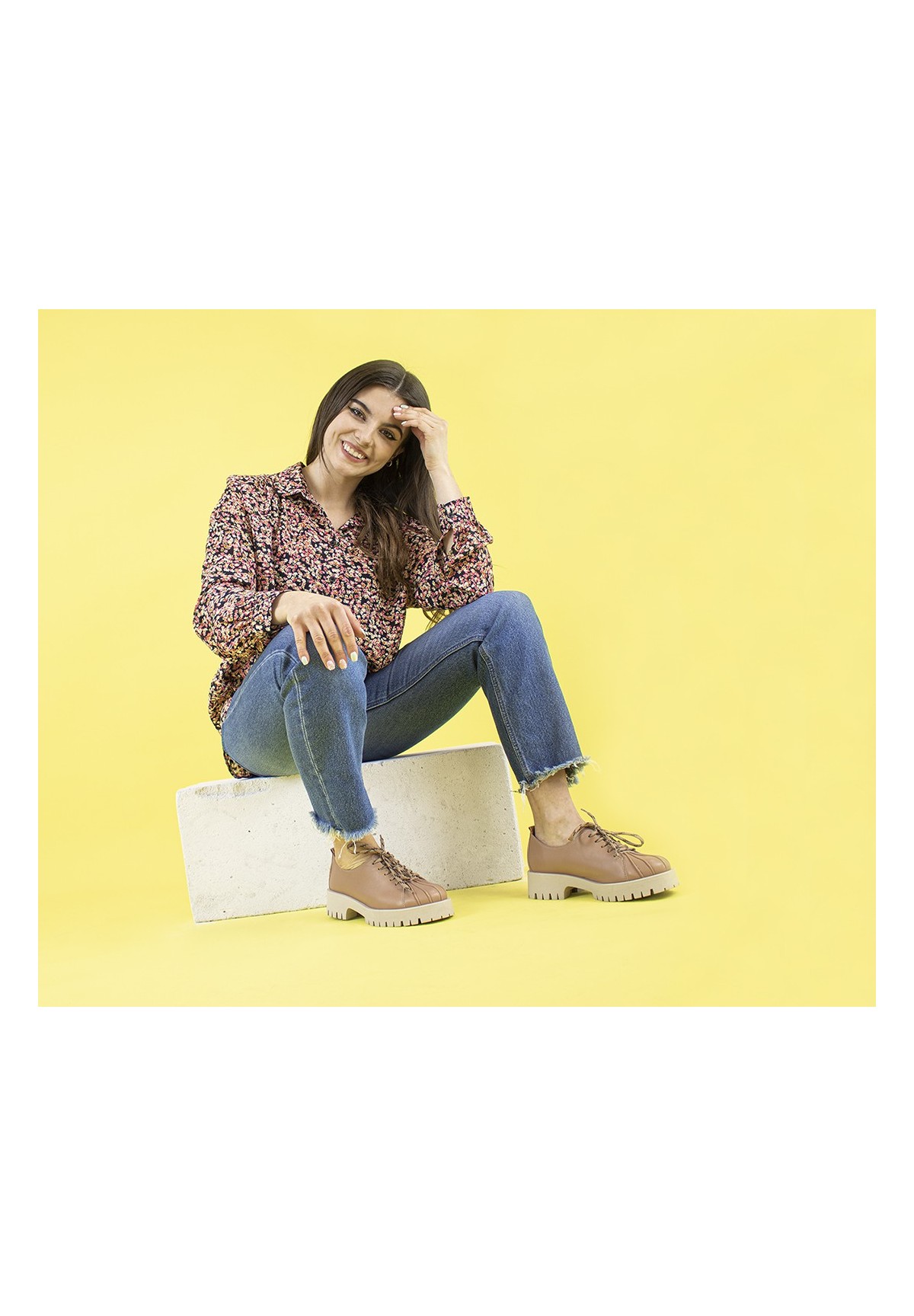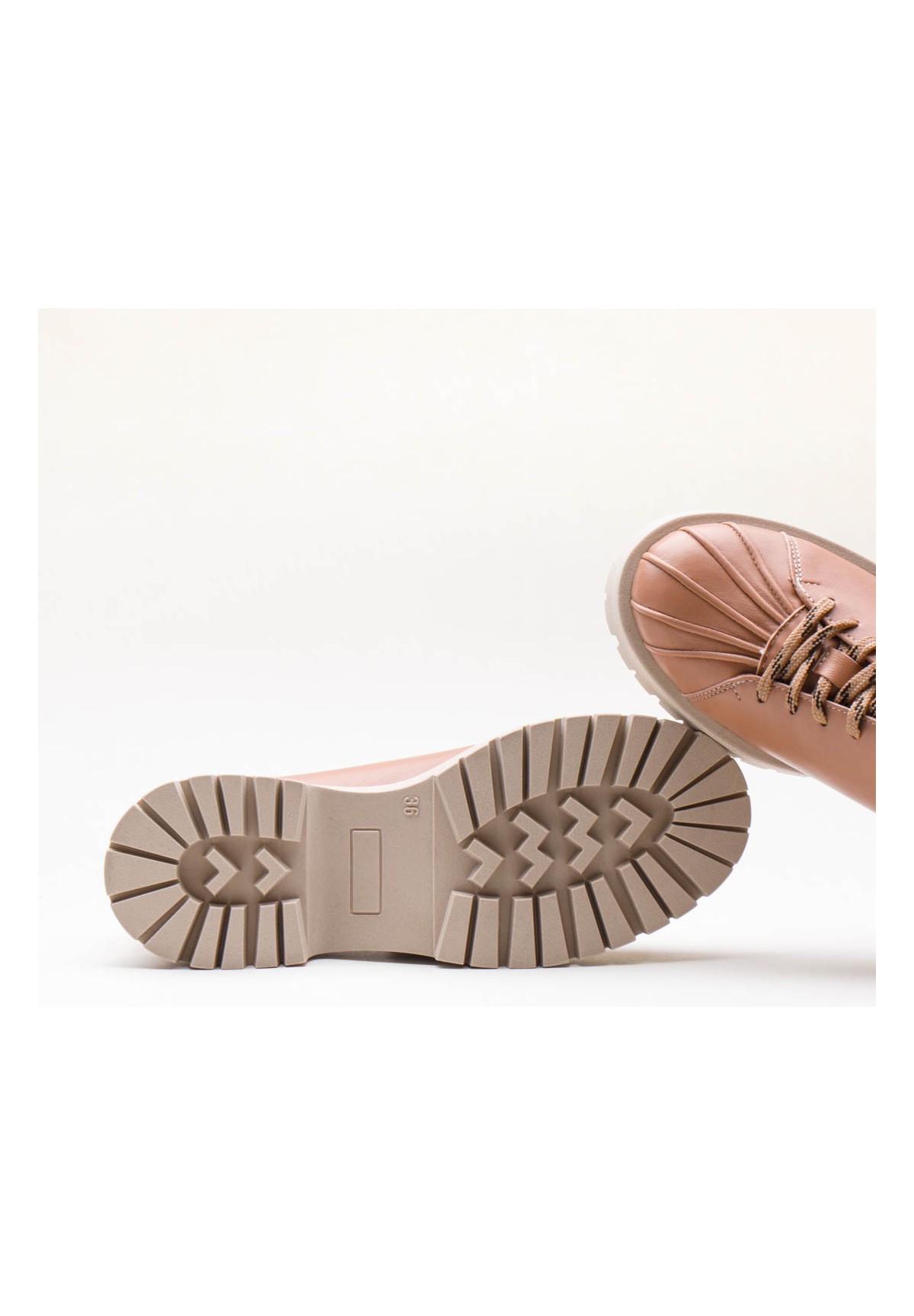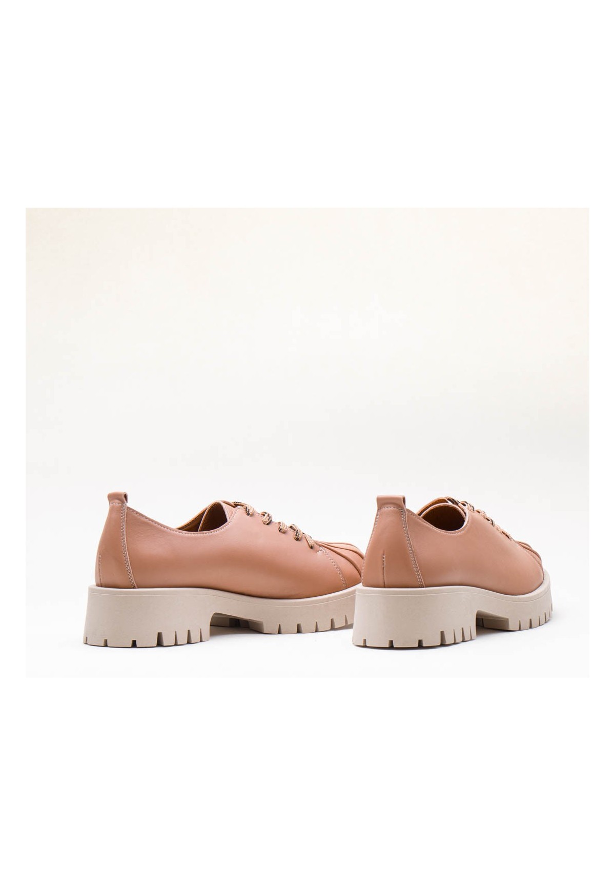 Brązowe półbuty wykonane z naturalnej skóry licowej. Wiązane na czarno-brązowe sznurowadła.