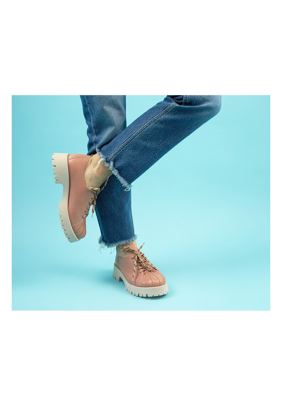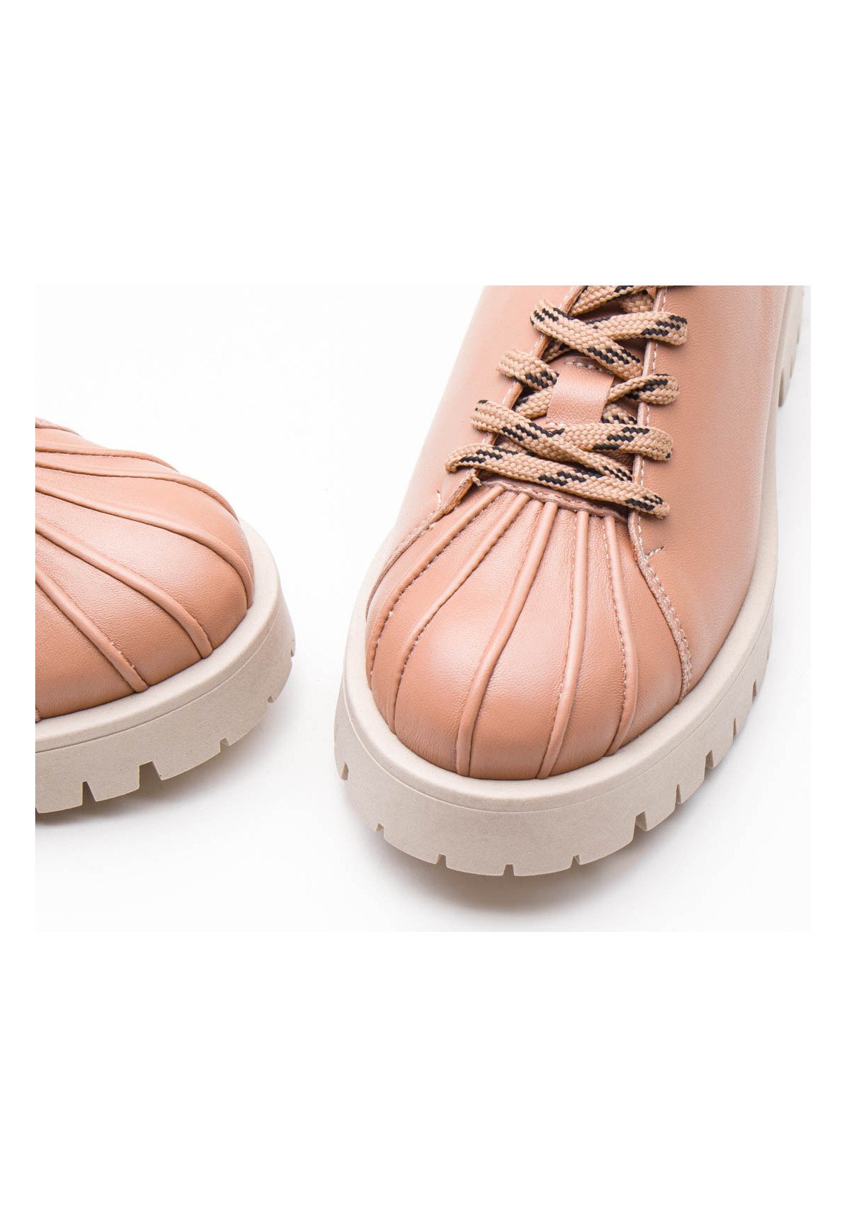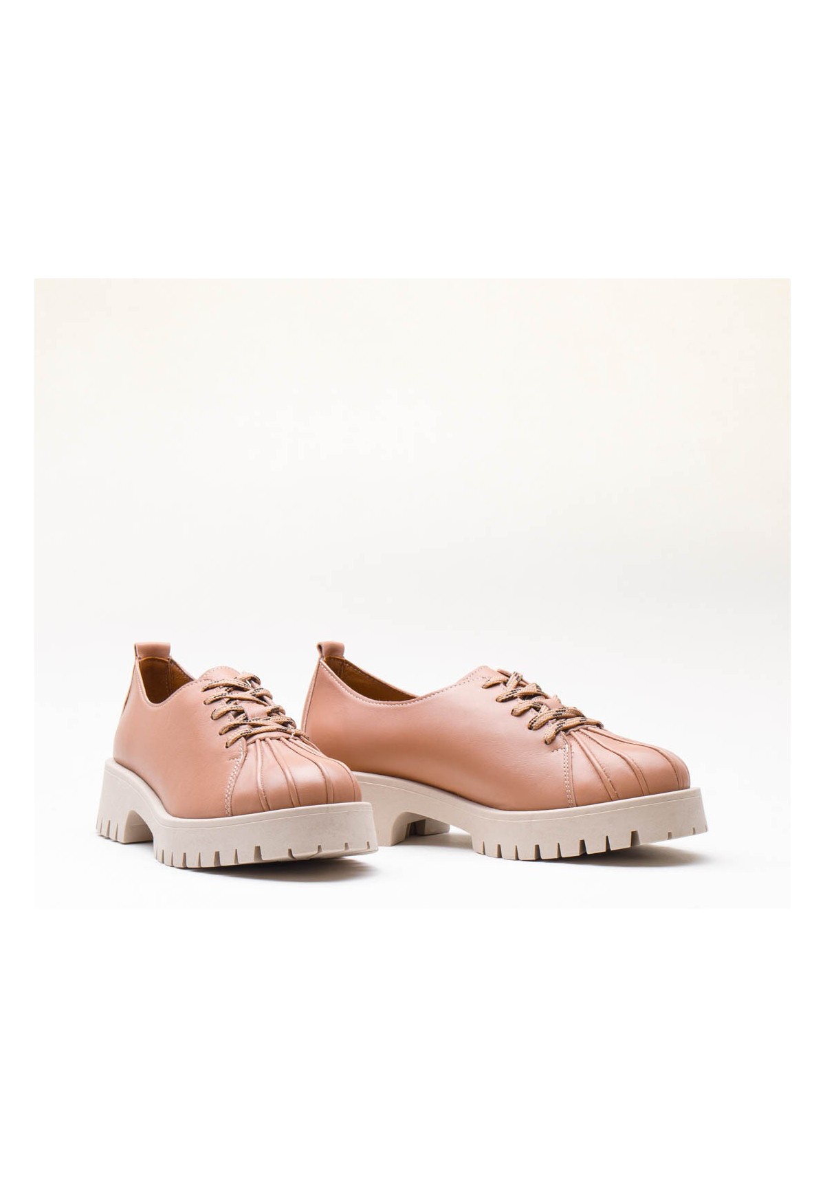Brązowe półbuty wykonane z naturalnej skóry licowej. Wiązane na czarno-brązowe sznurowadła.