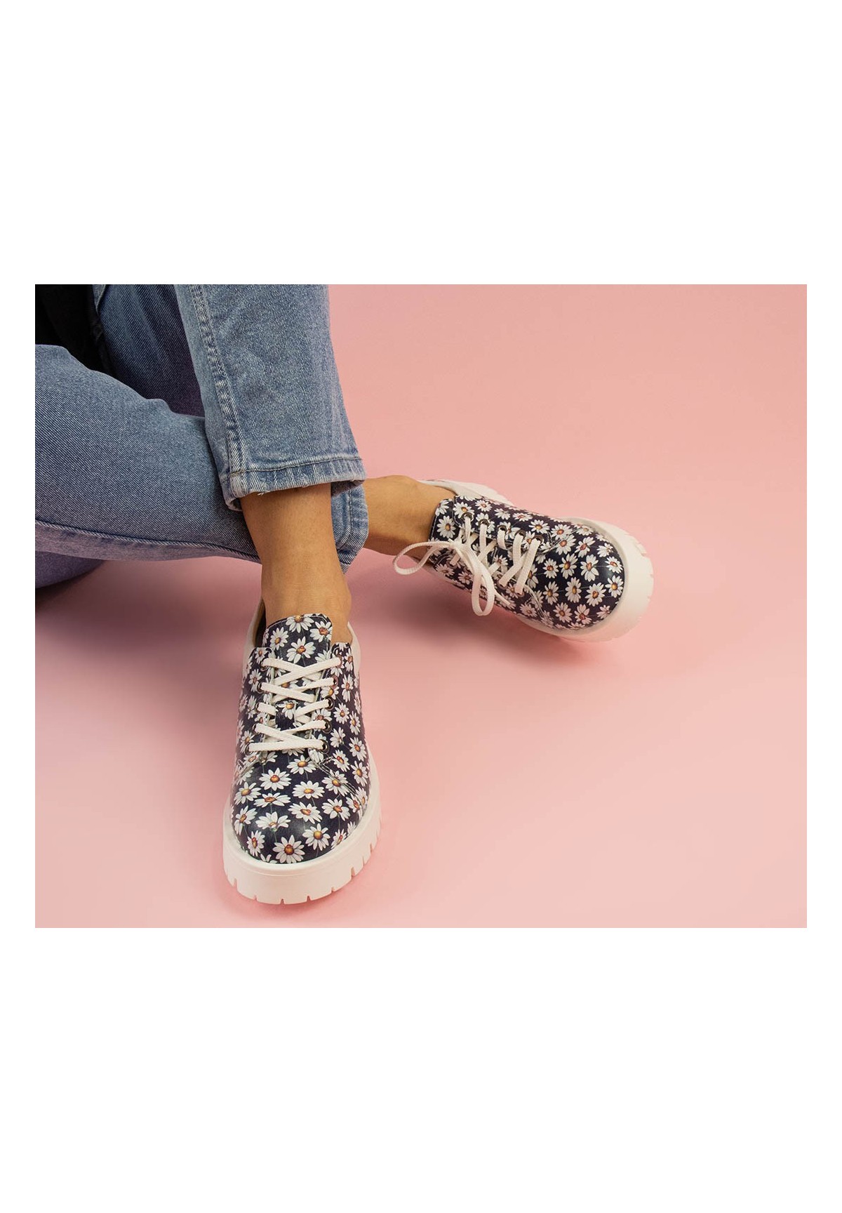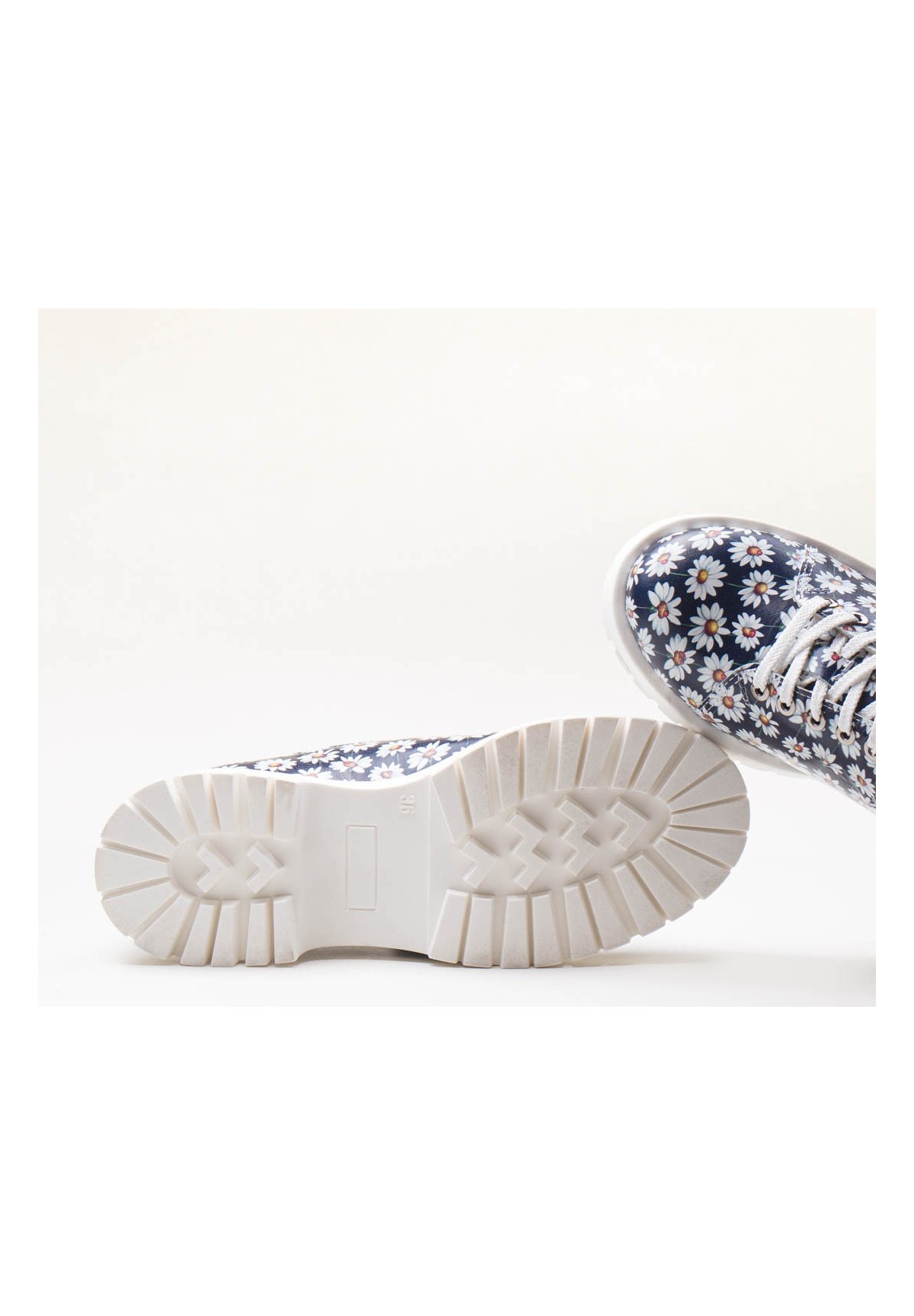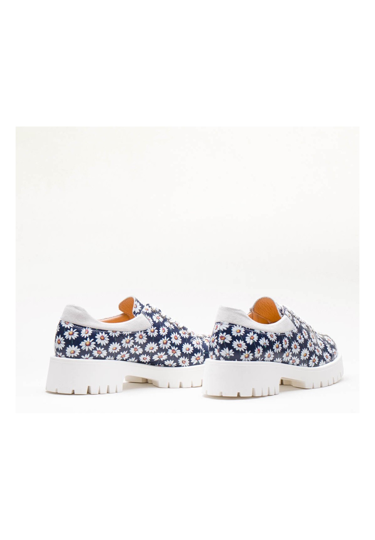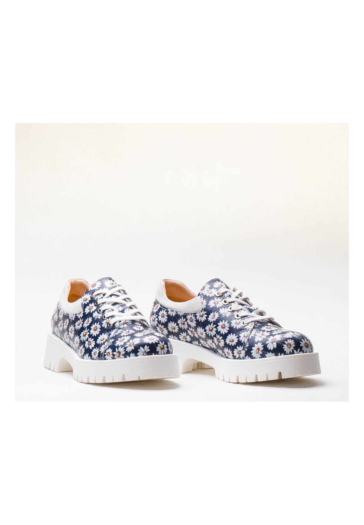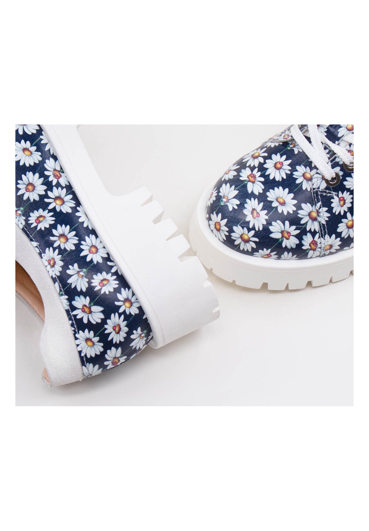 Biało-granatowe półbuty wykonane ze skóry foliowanej z motywem stokrotki.