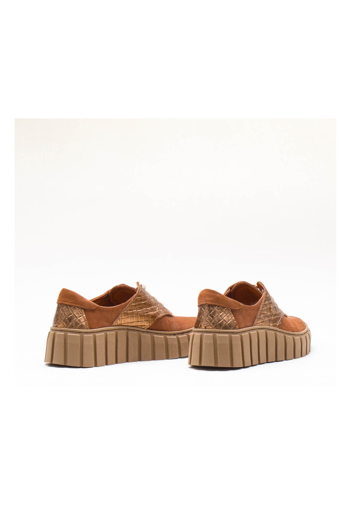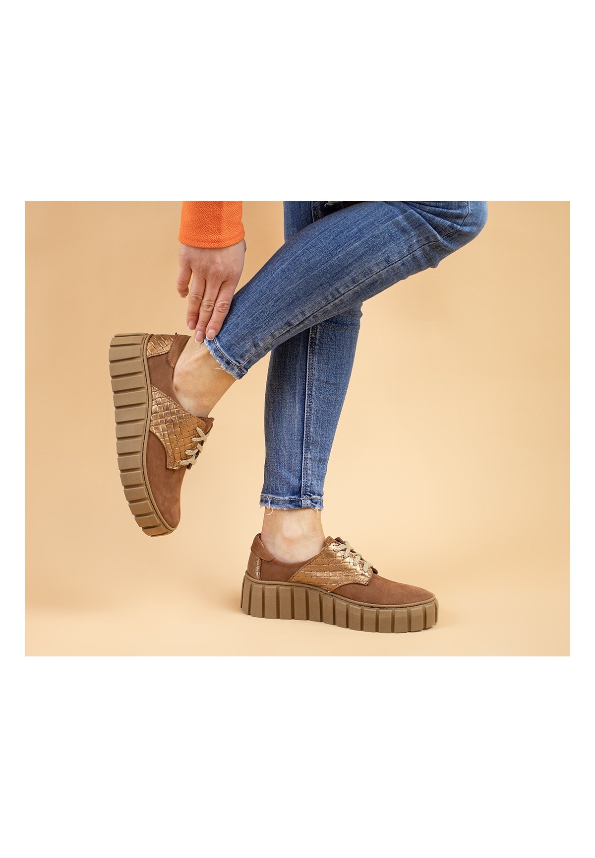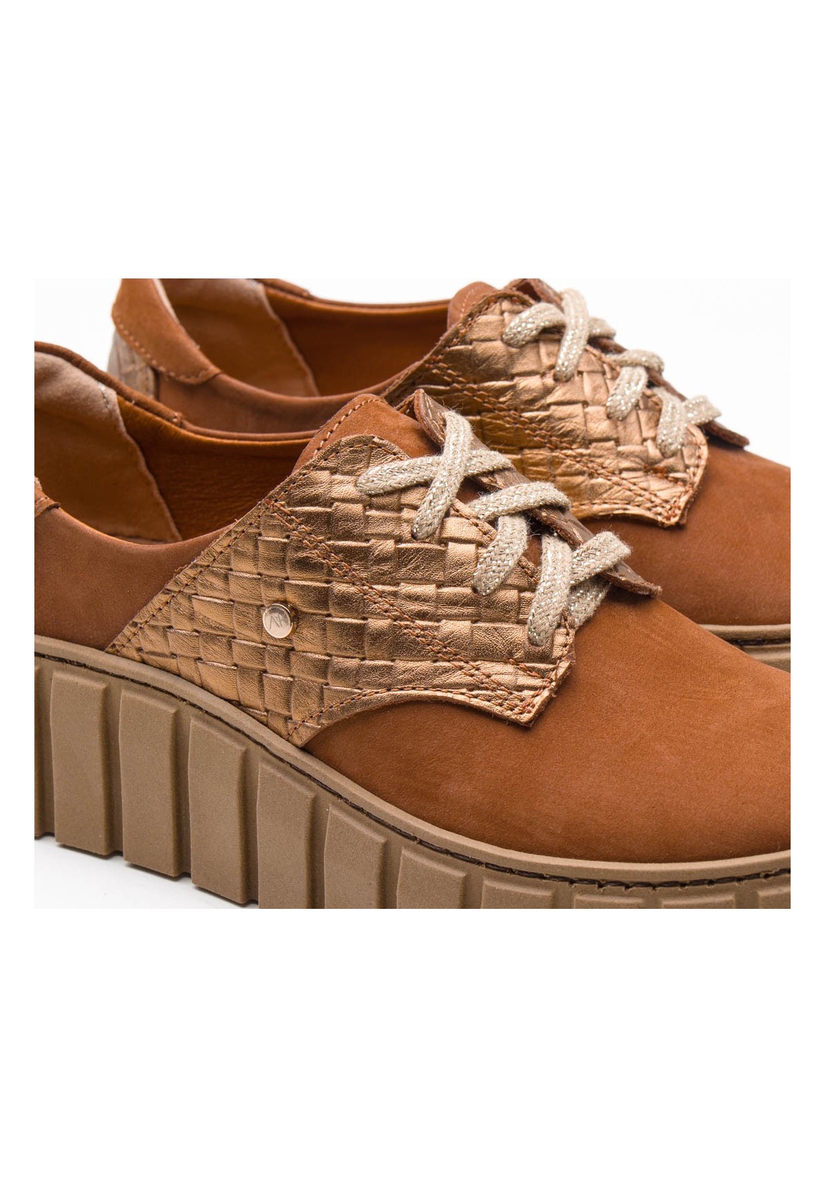 Półbuty wykonane z naturalnej skóry nubukowej w kolorze brązowym. Posiadają wstawki ze skóry licowej.