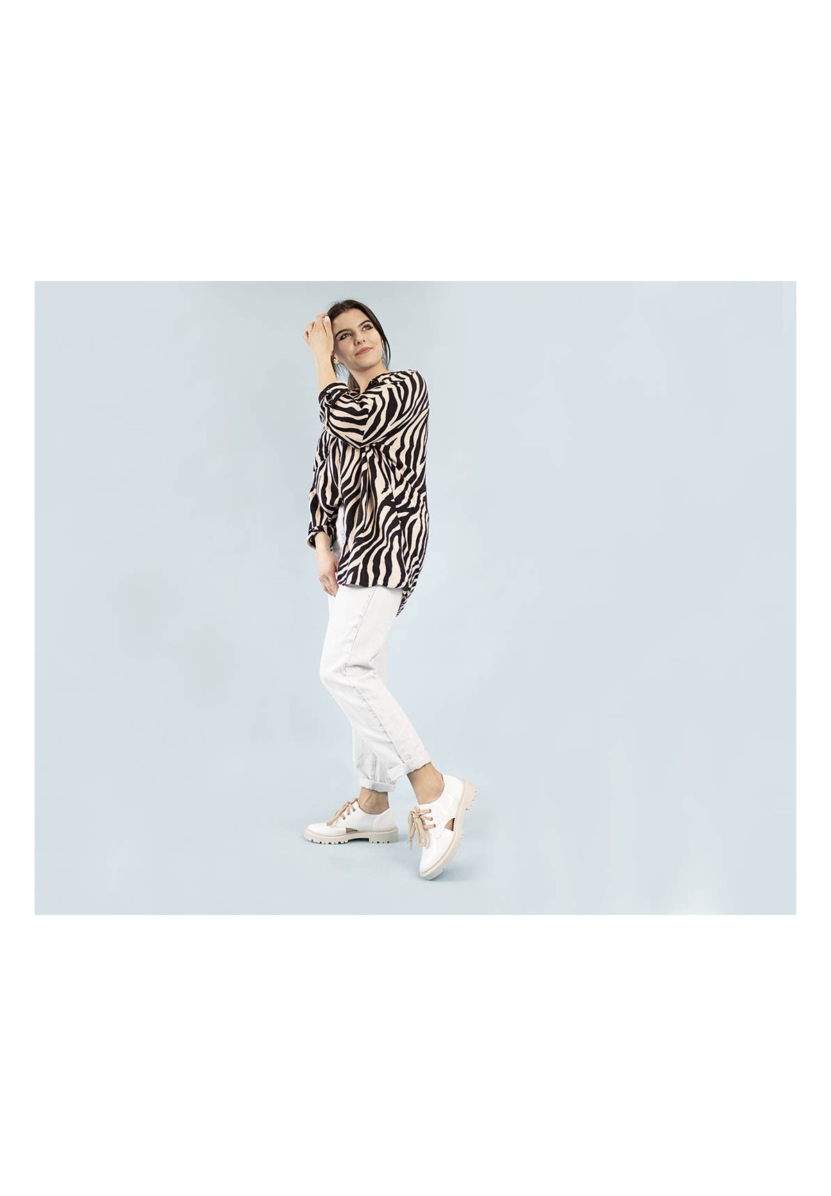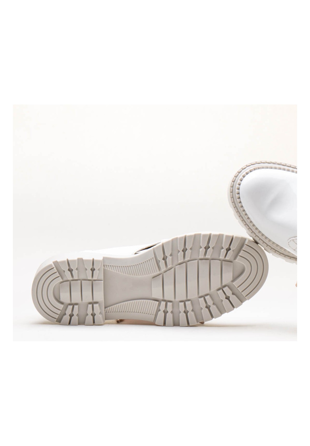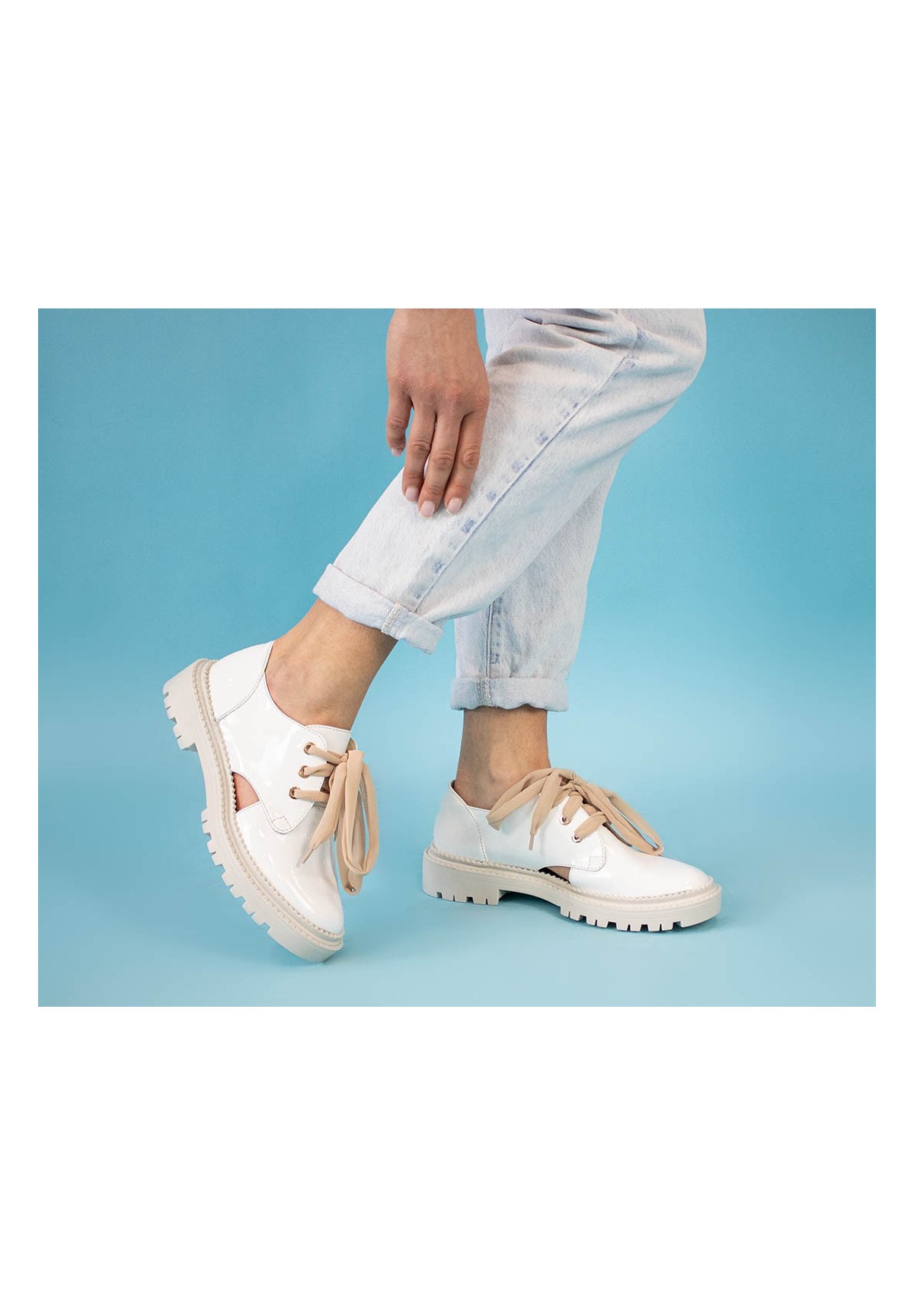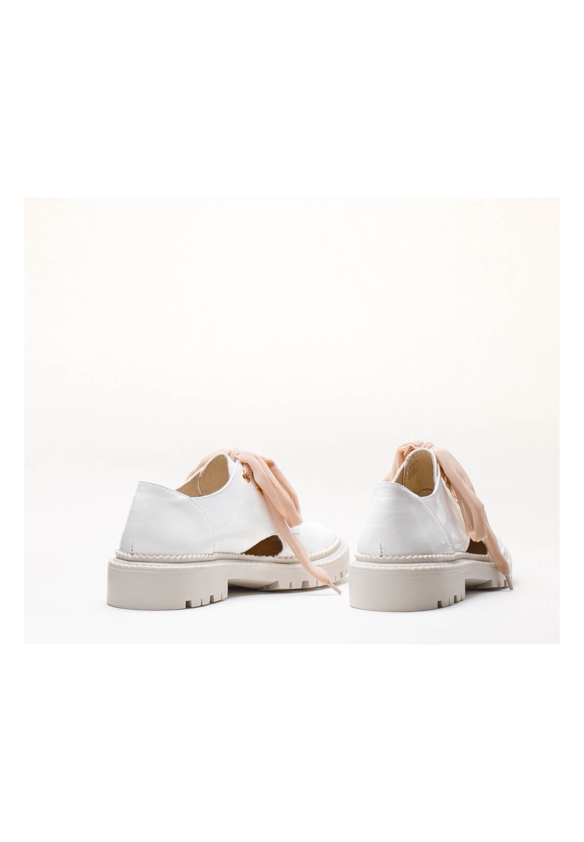 Półbuty wykonane ze skóry naturalnej typu naplak (miękki lakier) w kolorze białym z wycięciami po bokach. Wiązane na wstążkę.