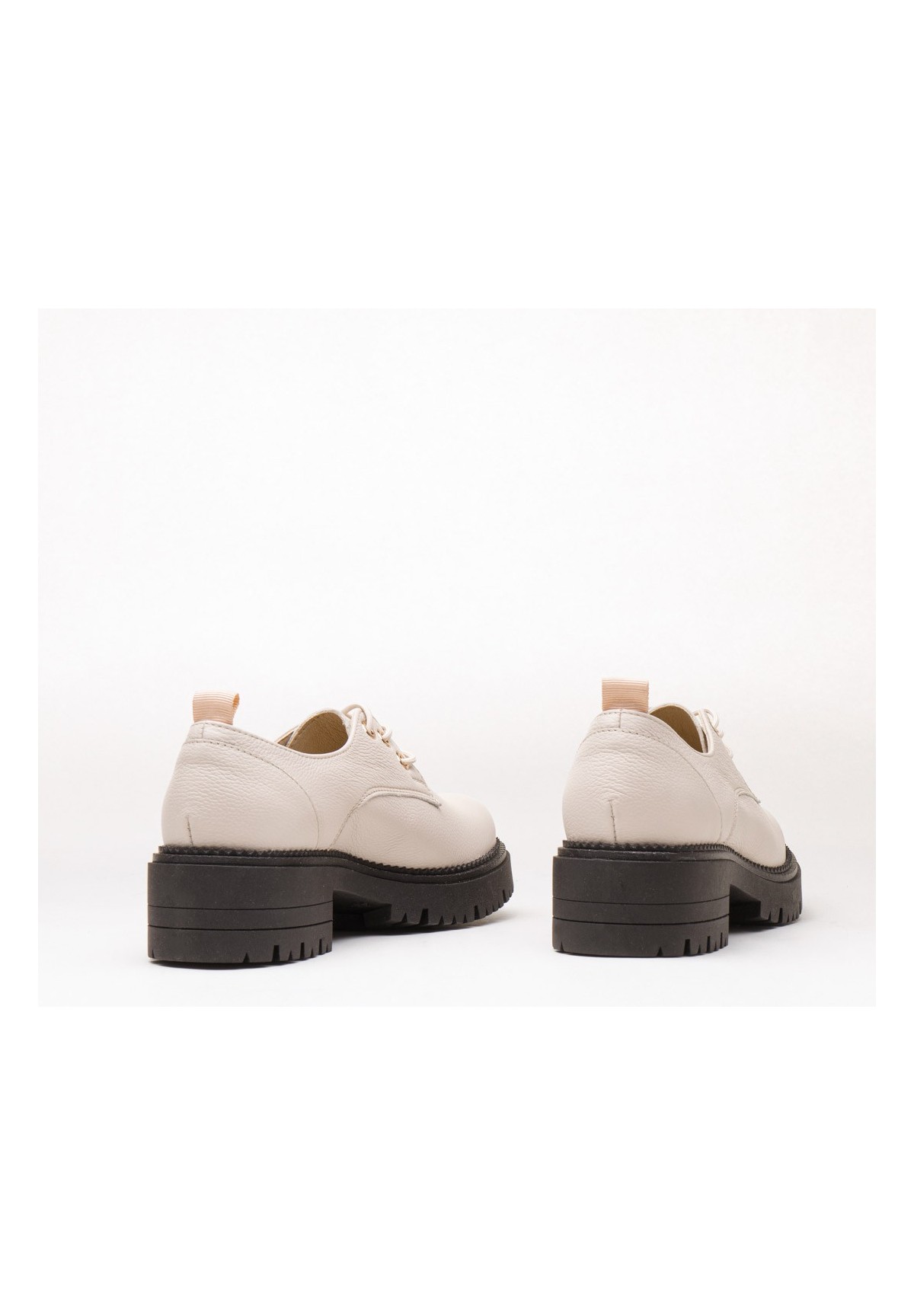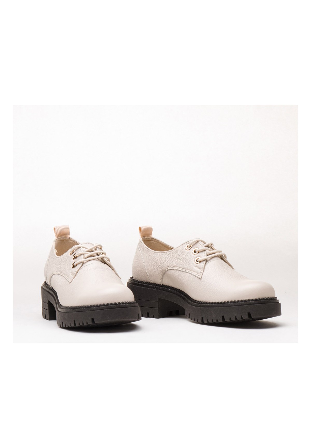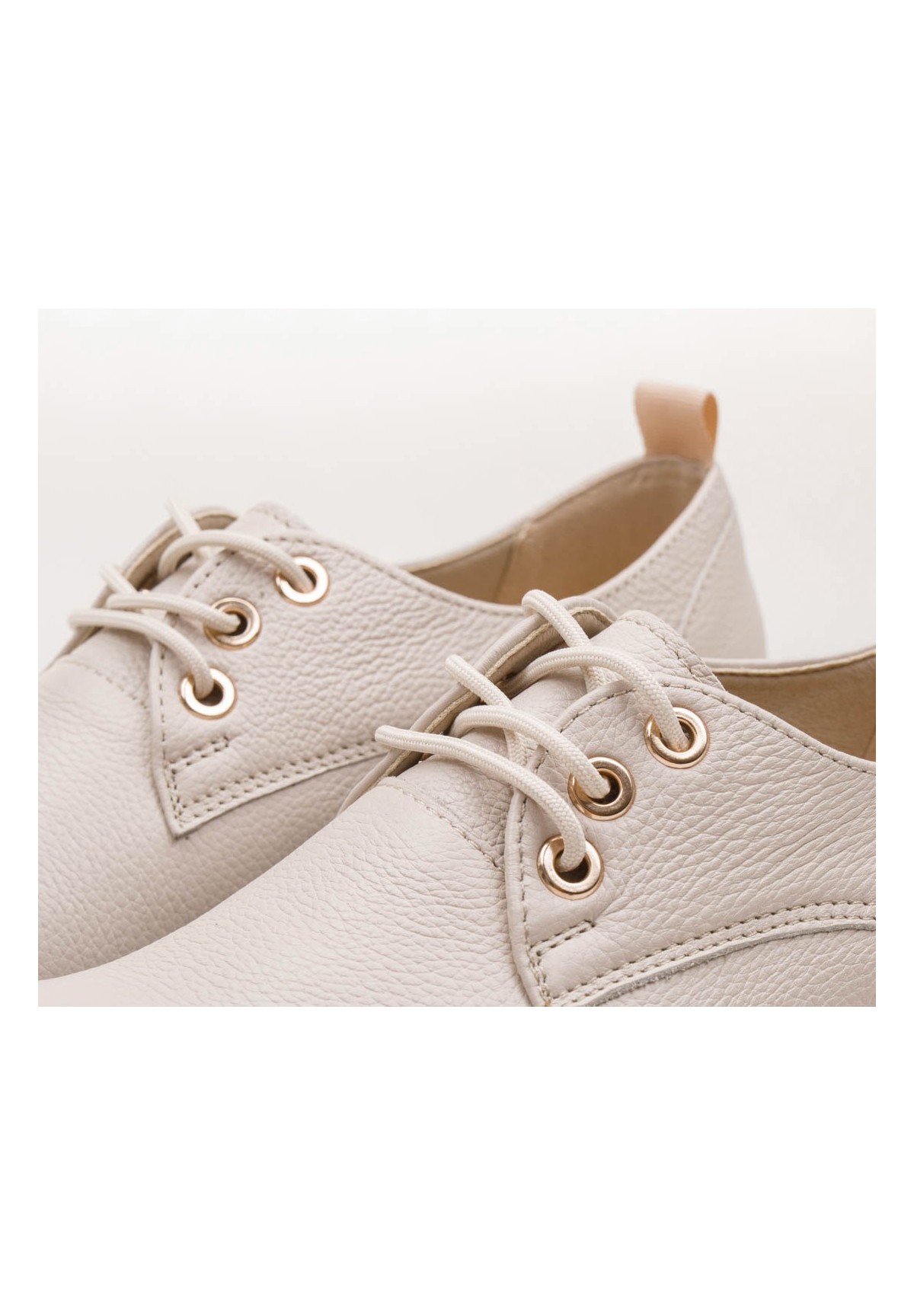Półbuty wykonane z naturalnej skóry licowej w kolorze beżowym. Posiadają grubą podeszwę. Wiązane na cienkie sznurowadła.