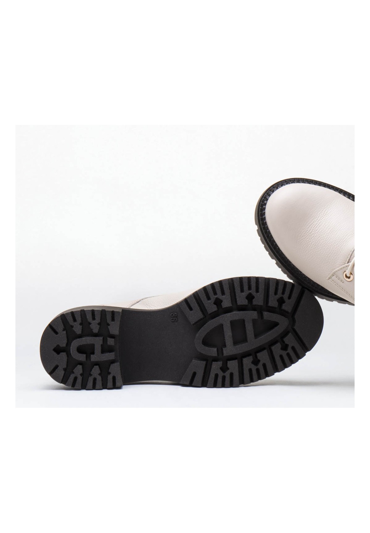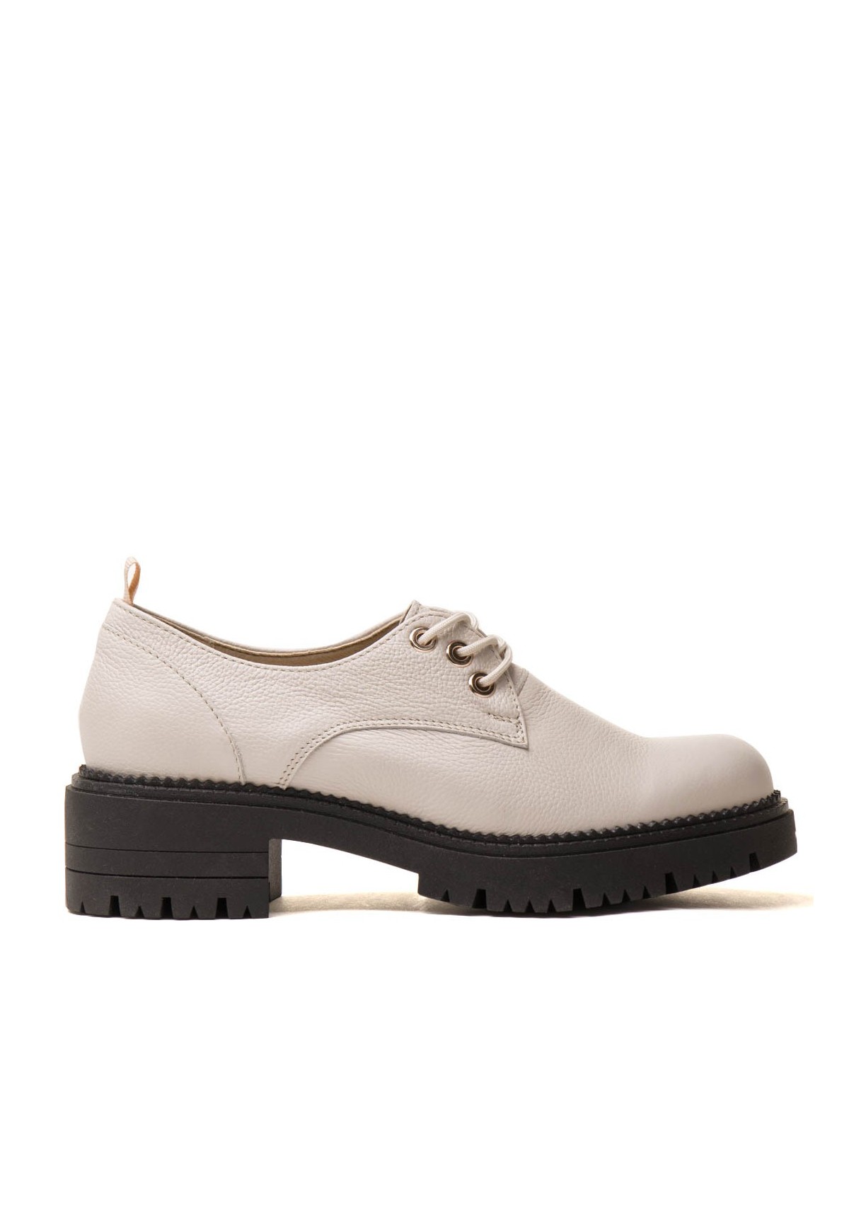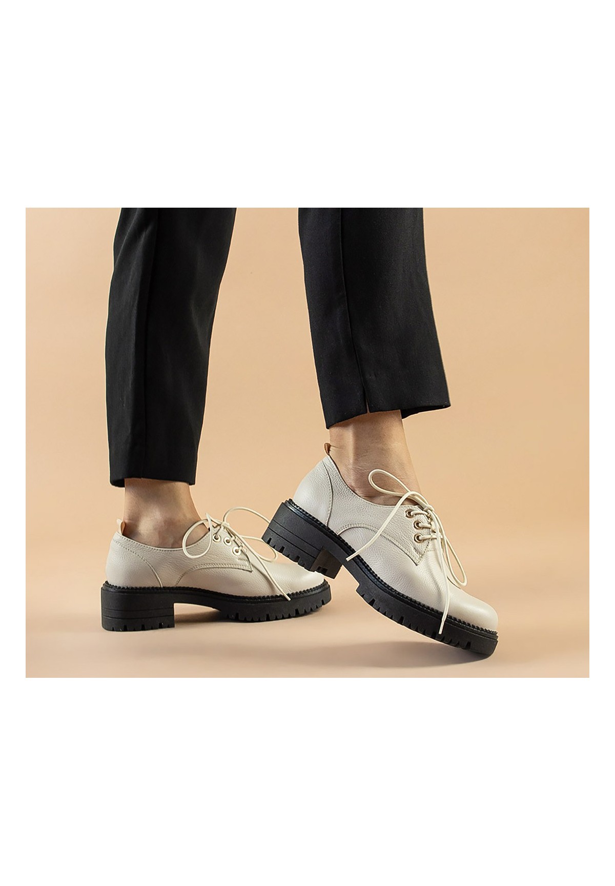 Półbuty wykonane z naturalnej skóry licowej w kolorze beżowym. Posiadają grubą podeszwę. Wiązane na cienkie sznurowadła.