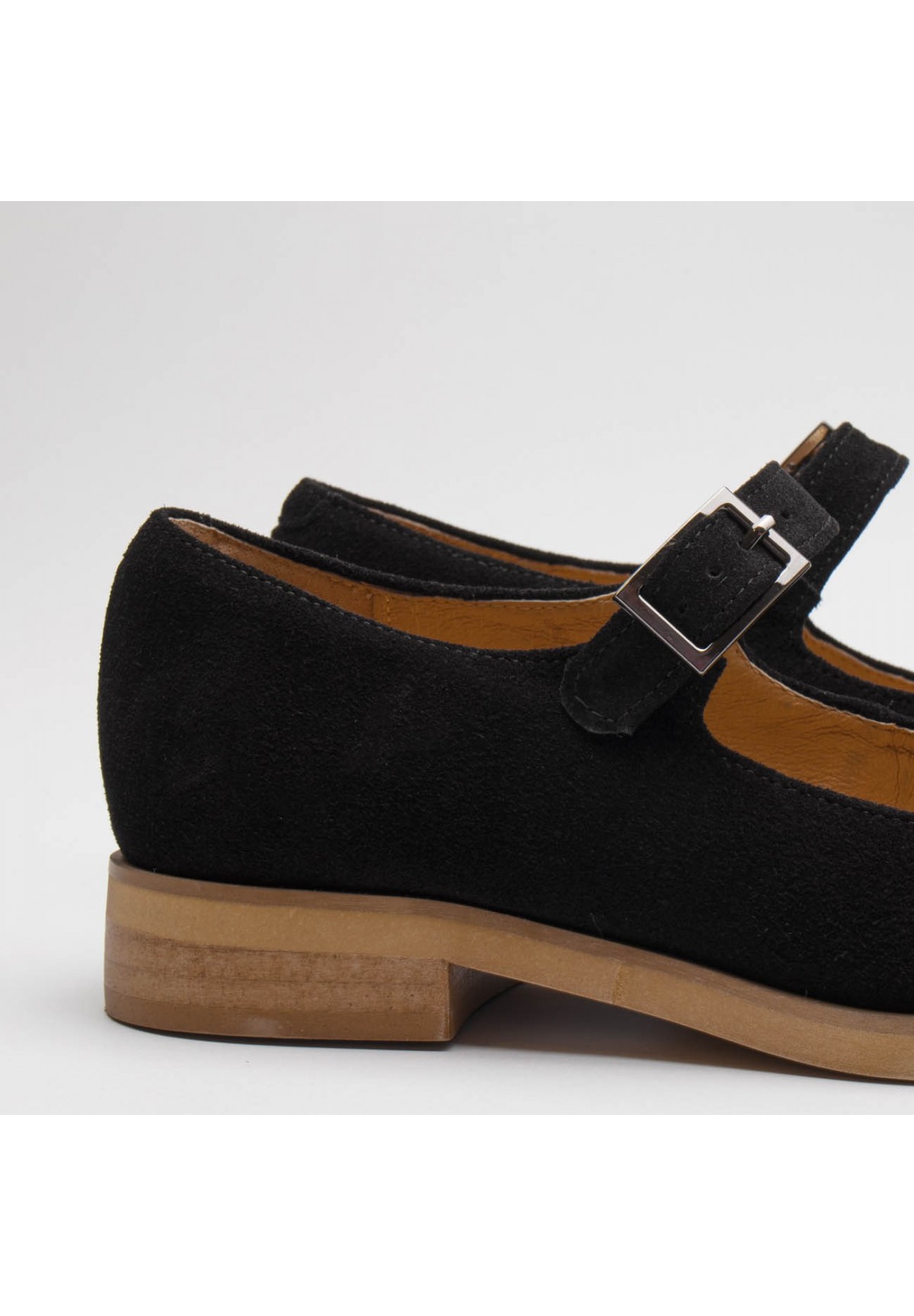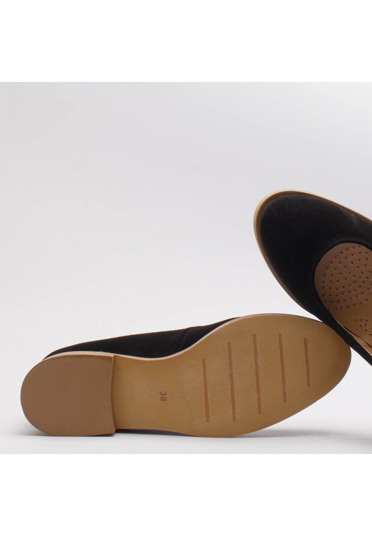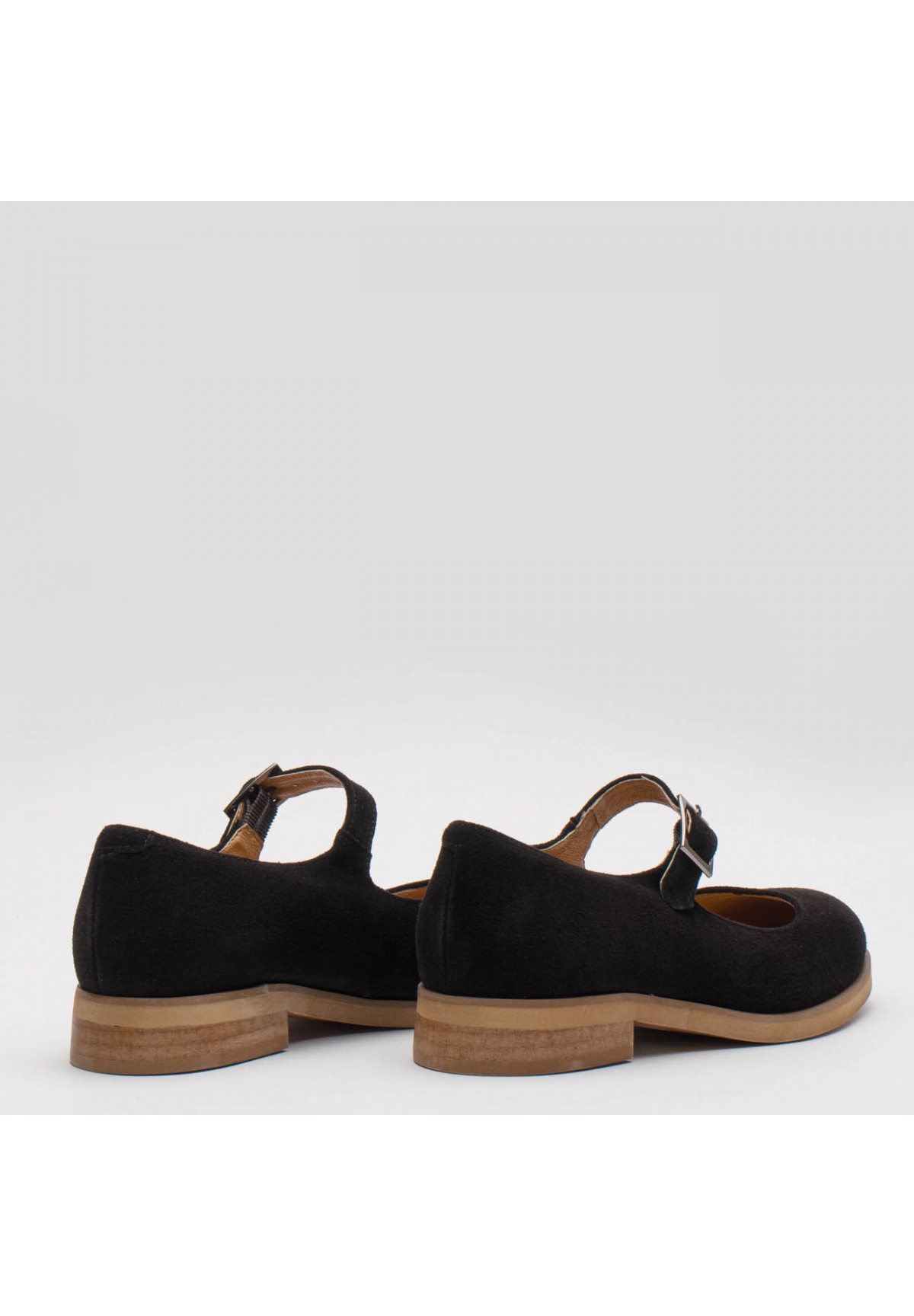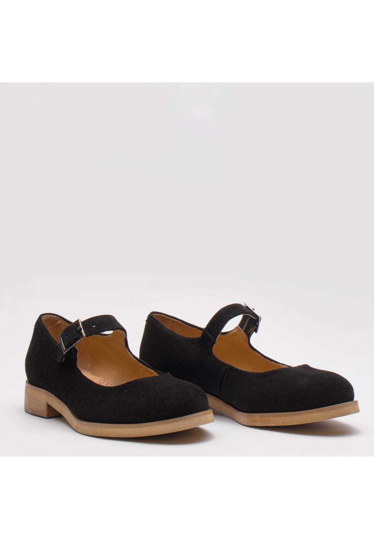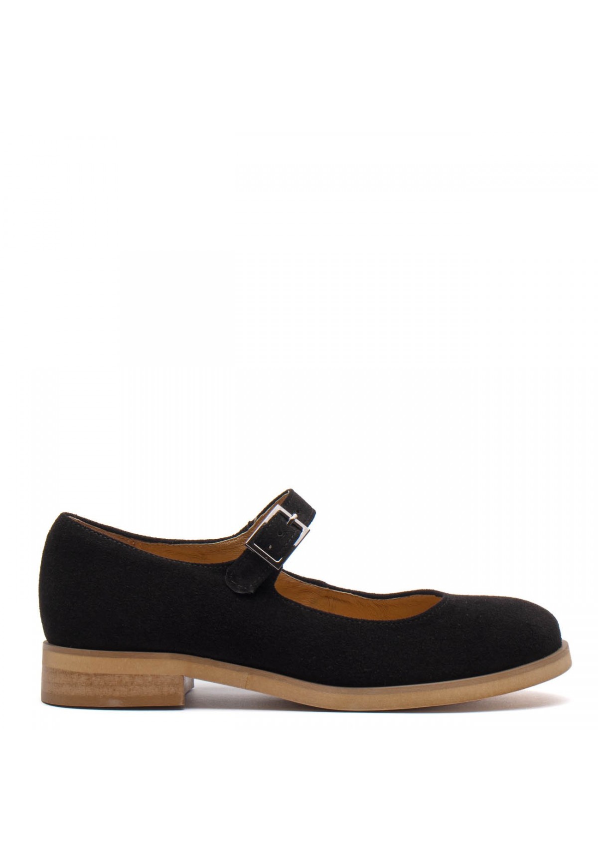 Półbuty damskie o subtelnej elegancji, wykonane z czarnej skóry welurowej. Ich głęboko wycięta cholewka i noski w kształcie migdała dodają szyku i wdzięku. Zapinane za pomocą paska ze sprzączką. Buty na niskim obcasie - są zarówno stylowe, jak i wygodne. Wnętrze butów wyściełane jest naturalną, skórzaną podszewką, a miękka wkładka zapewnia dodatkowy komfort. Idealne dla kobiet ceniących sobie wyrafinowany design i wysoką jakość wykonania.