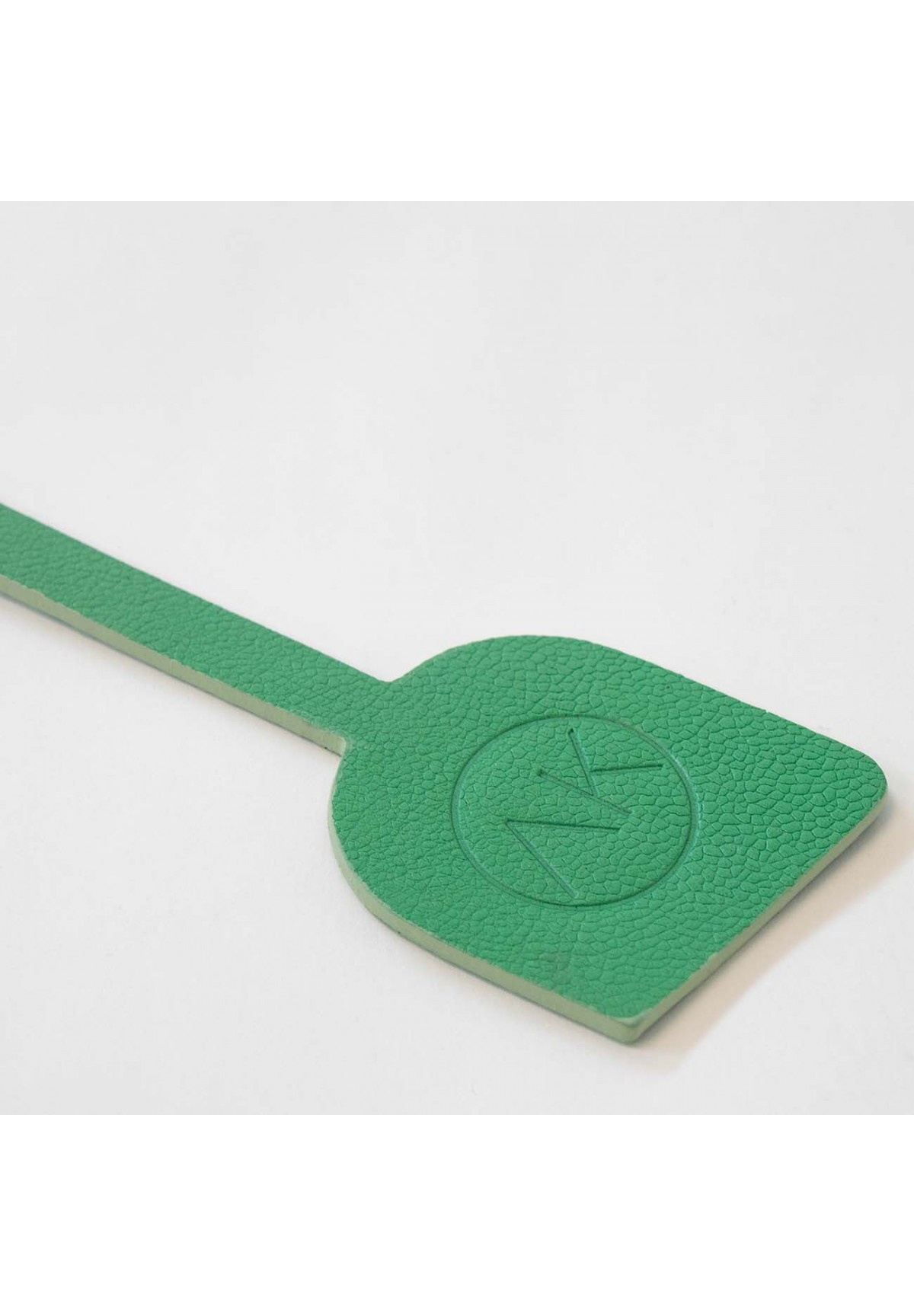 Płaski brelok typu plomba, w zielonym kolorze, z pewnością będzie świetnie prezentował się dopięty do torebki lub kluczy. Wykonany z naturalnej skóry będzie służył długi czas.