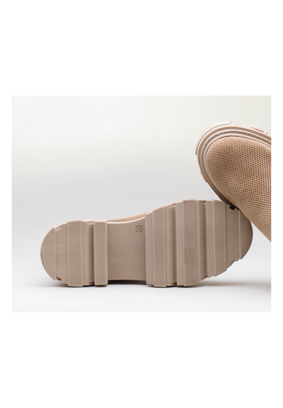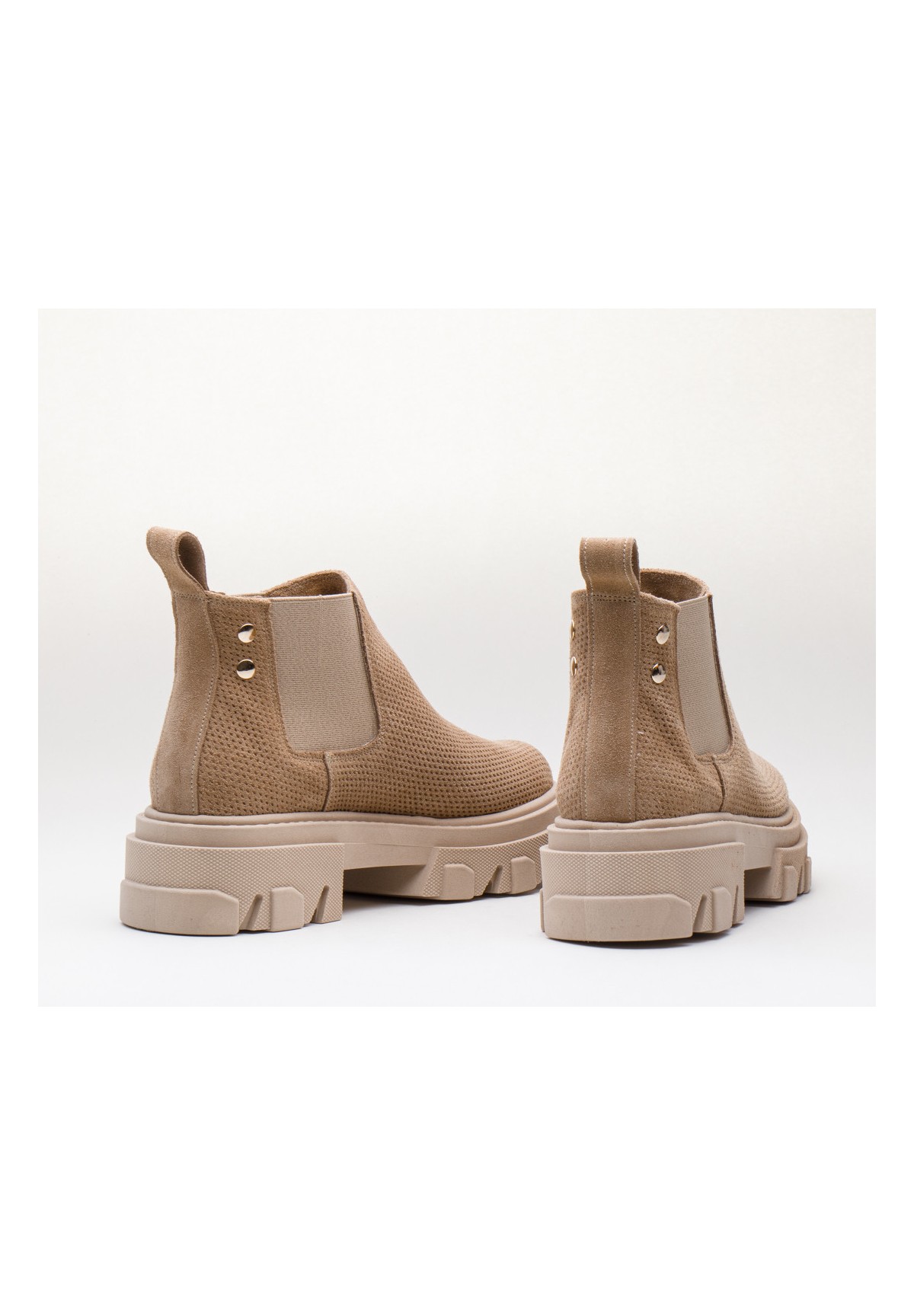 Beżowe botki damskie, osadzone na grubej, masywnej podeszwie, zapewniającej doskonałą amortyzację i stabilność podczas chodzenia. Wykonane ze skóry welurowej perforowanej. Model z okrągłym noskiem. Wewnątrz ocieplone filcem, dzięki czemu chodzenie w nich w chłodne dni nie będzie sprawiało problemu. Po bokach elastyczne wstawki ułatwiające szybkie ubieranie.