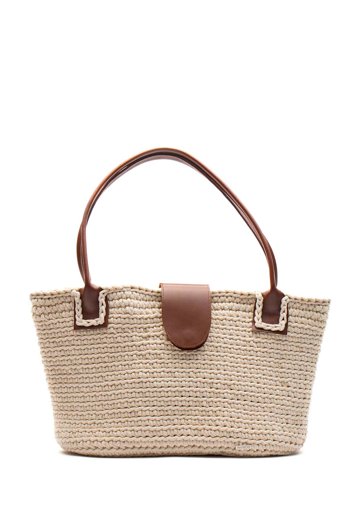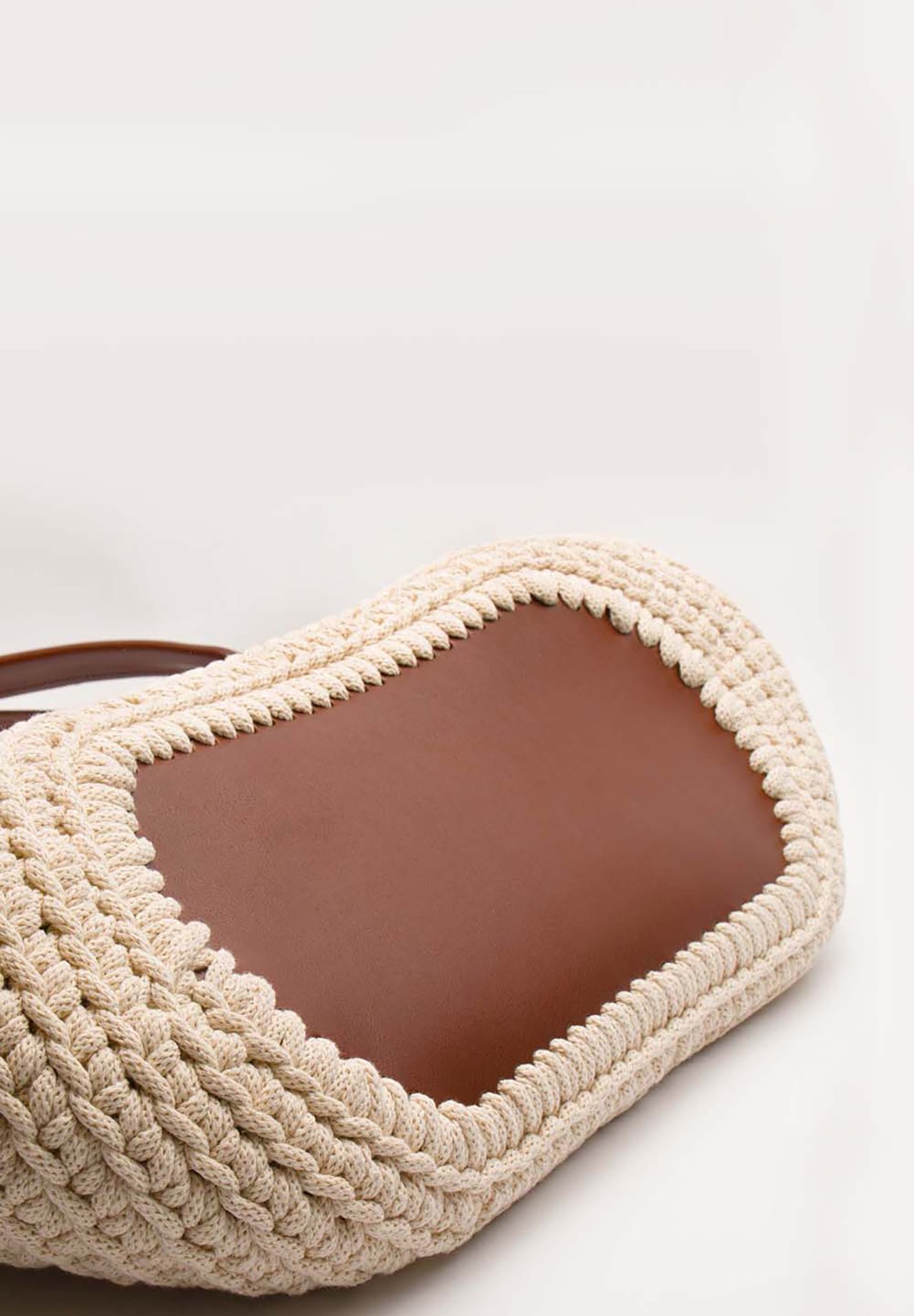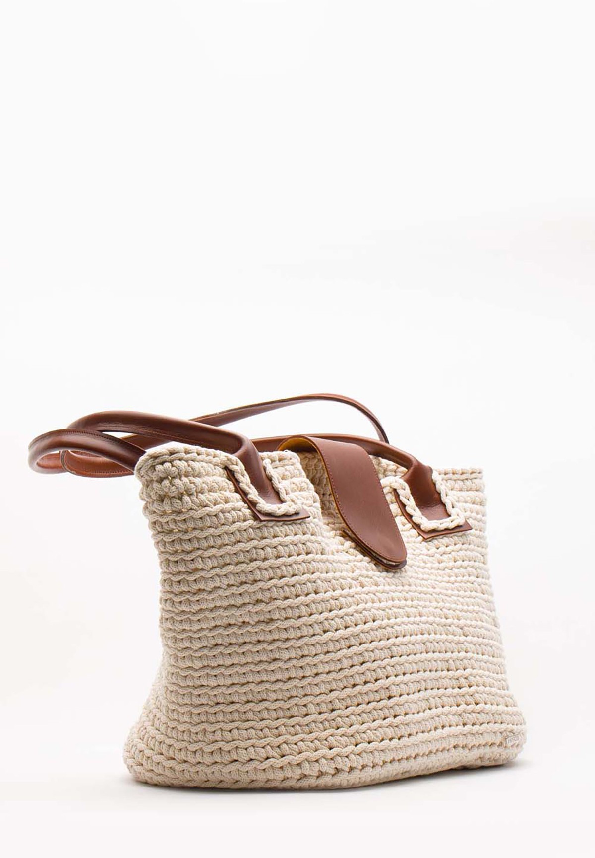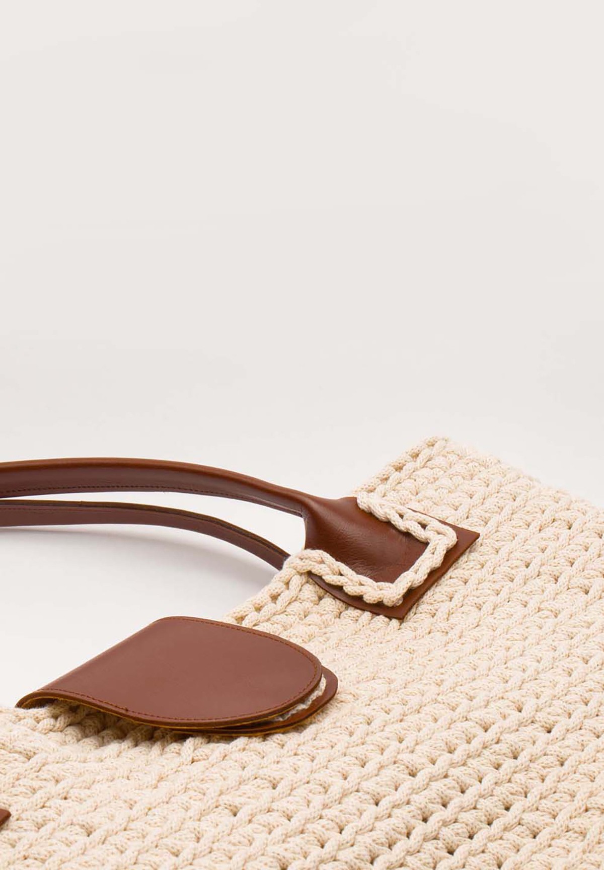 Pleciona z beżowego sznurka bawełnianego, przepiękna torebka damska wpadnie w oko nie jednej kobiecie, w szczególności tym, które uwielbiają handmade. Duży model sprawdzi się do codziennych, jak i wakacyjnych stylizacji. Dodatek naturalnej skóry licowej sprawia, że zyskuje na wyglądzie.