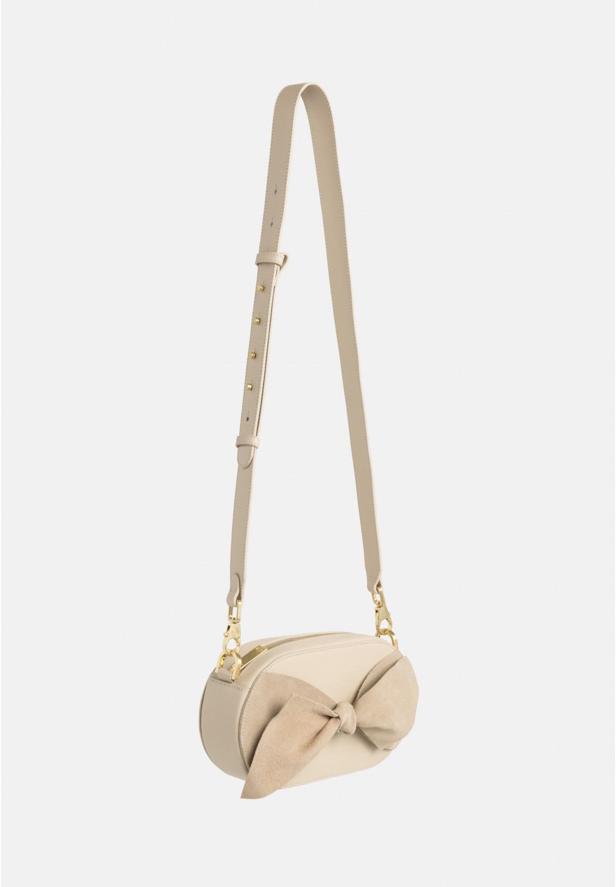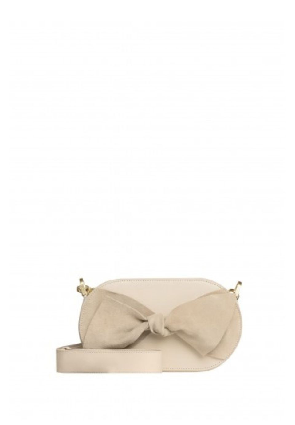 Mała, kompaktowa torebka LUCILLE ze skóry to idealny wybór dla kobiet ceniących połączenie elegancji i oryginalnego stylu. Jej unikalnym wyróżnikiem jest duża kokarda, wykonana z miękkiego zamszu, która przyciąga uwagę i nadaje całości kobiecego charakteru. Klasyczny, owalny kształt torebki w połączeniu z minimalistyczną formą sprawia, że będzie pasować zarówno do codziennych stylizacji, jak i na wyjątkowe okazje. Dodatkowego szyku dodają jej złote okucia z wygrawerowanym logo, które podkreślają dbałość o detale i nadają całości luksusowego wykończenia.