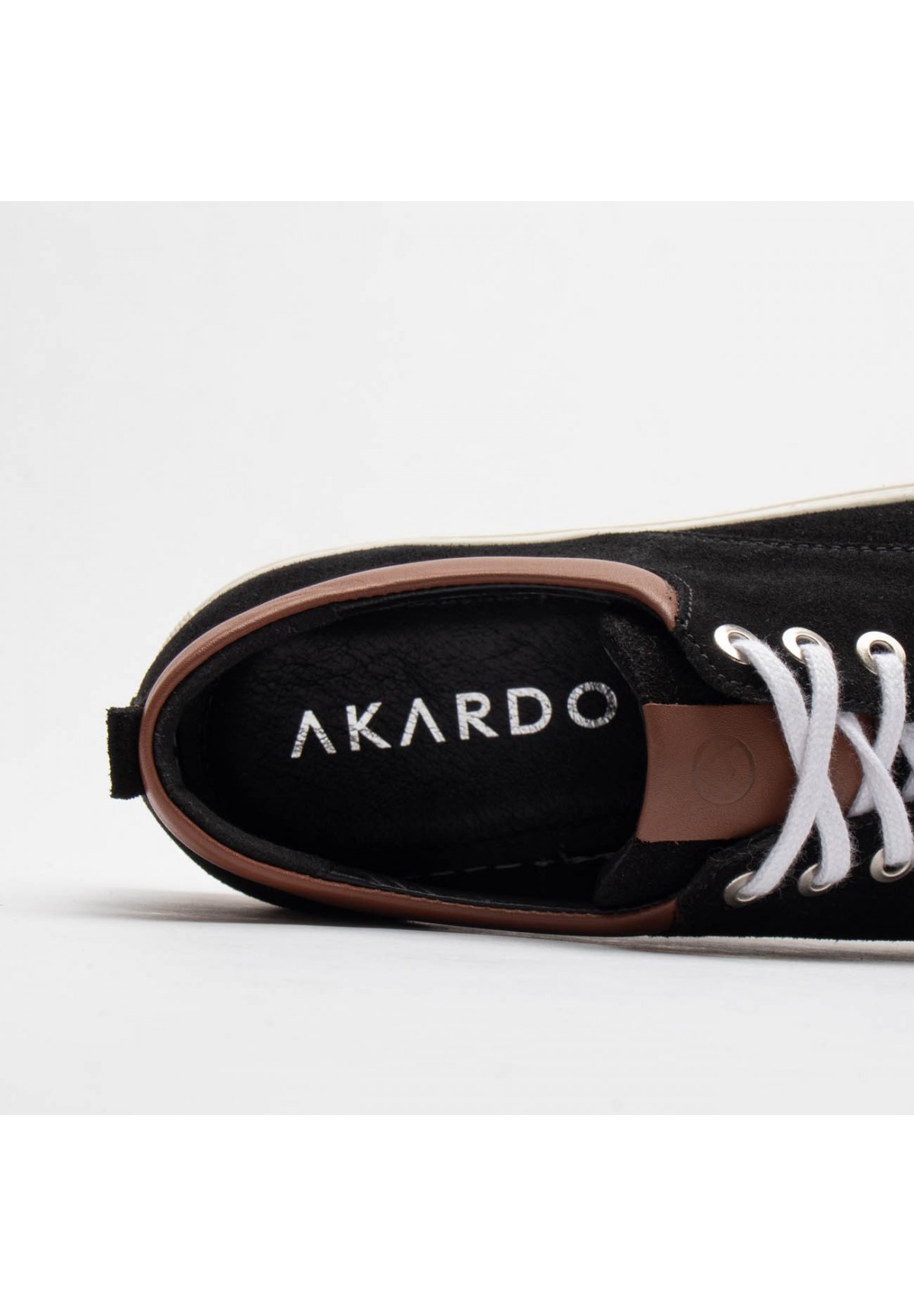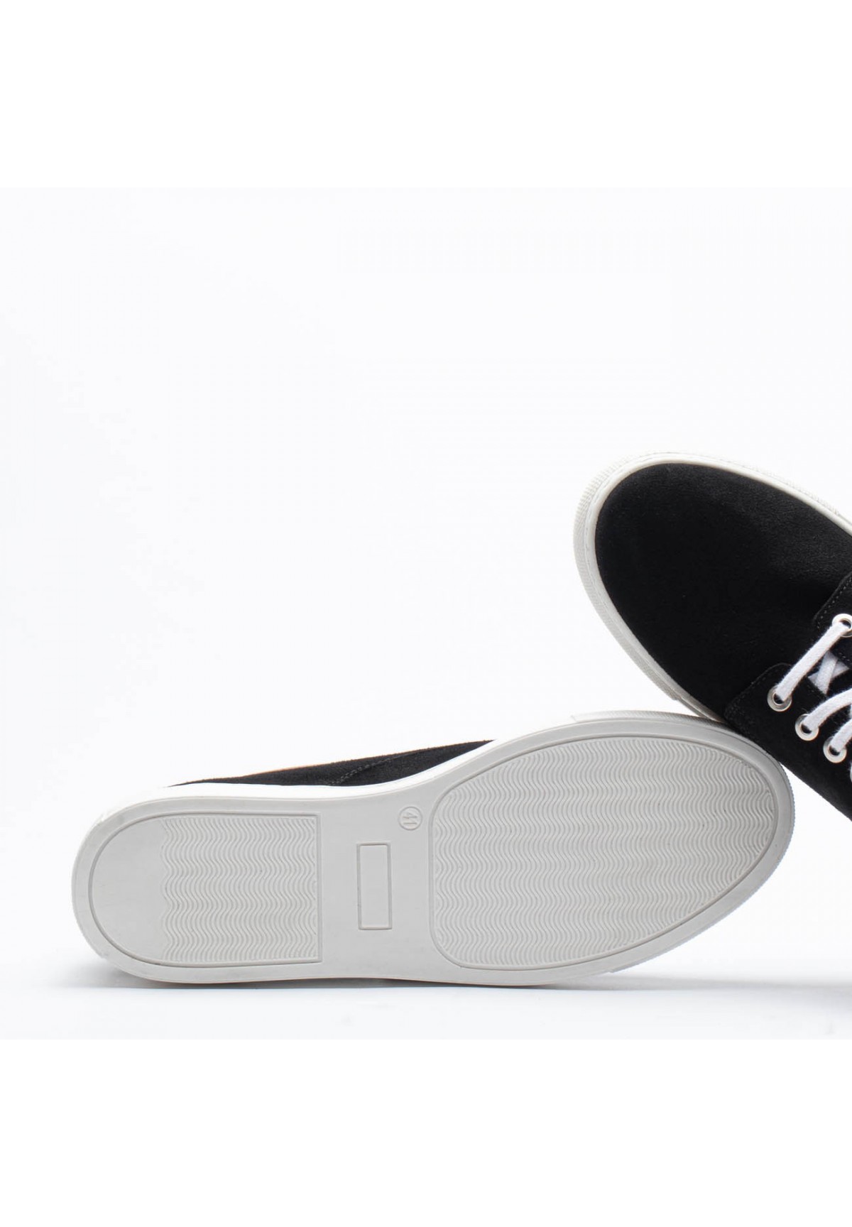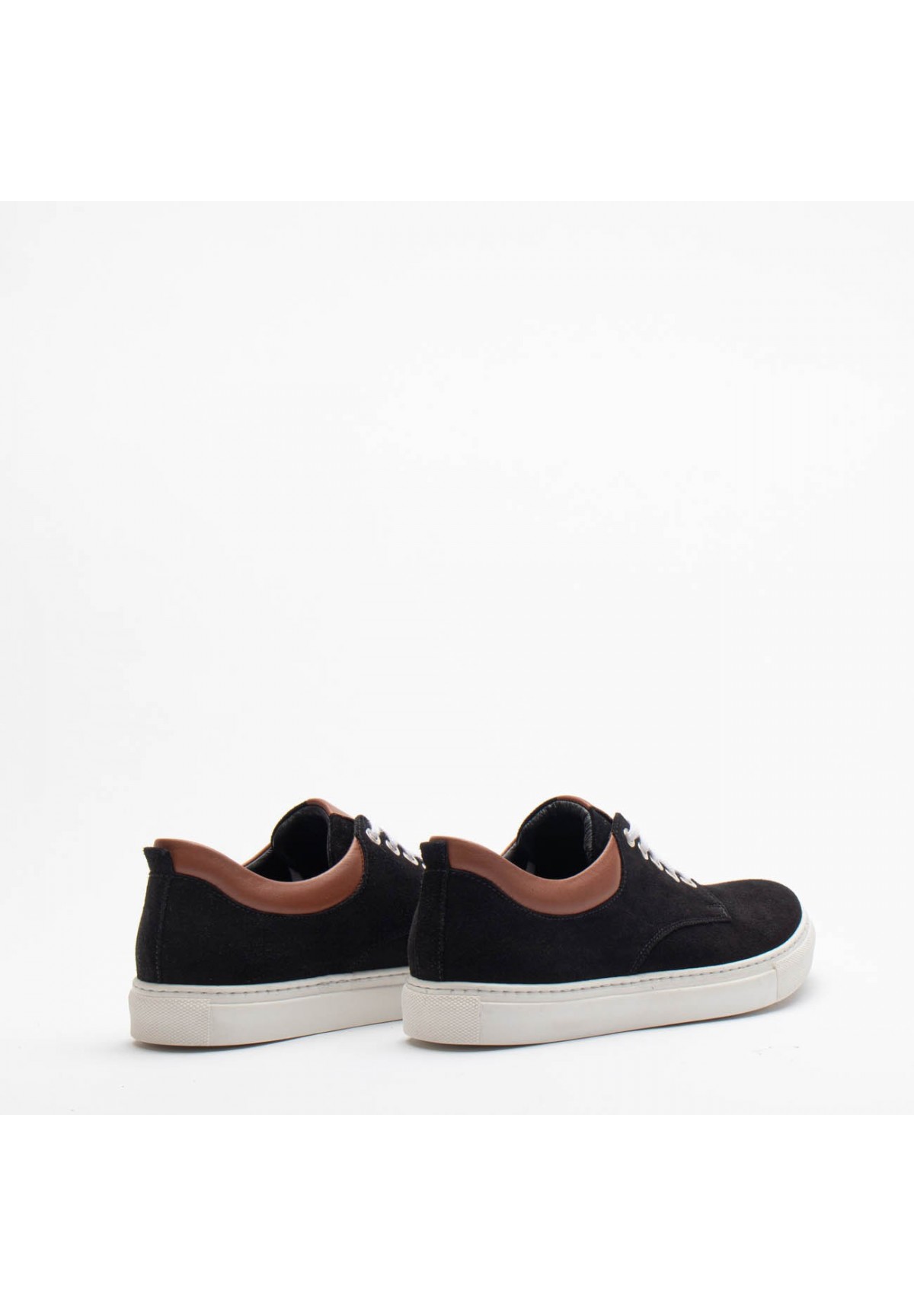 Buty męskie wykonane z welurowej skóry naturalnej w głębokim kolorze czarnym, emanują prestiżem i klasą. Ich biała podeszwa dodaje im świeżości i kontrastuje z ciemnym kolorem skóry, tworząc efektowne połączenie. Wstawka ze skóry licowej w brązowym odcieniu przy kostce nadaje butom subtelny akcent i wyróżnia je spośród innych modeli. To szczegół, który dodaje im charakteru i unikalnego wyrazu. Prezentują się doskonale, ale także zapewniają niezrównany komfort noszenia. Ich doskonale zaprojektowana konstrukcja gwarantuje wsparcie dla stóp, co sprawia, że możesz cieszyć się wygodą przez cały dzień, bez względu na aktywność. Wnętrze butów zostało wyściełane wysokiej jakości skórzaną podszewką oraz wkładką, co zapewnia nie tylko miękkość, ale także trwałość i optymalne dopasowanie do Twoich stóp. To sprawia, że buty idealnie dopasowują się do Twoich potrzeb, zapewniając jednocześnie luksusowe uczucie noszenia. Zestaw te buty z klasycznymi spodniami i elegancką koszulą dla formalnego looku, albo połącz je z casualowymi jeansami i t-shirtem dla bardziej swobodnego stylu. Niezależnie od tego, jak będziesz je nosił, te trampki dodadzą Twojemu outfitowi niepowtarzalnego charakteru i sprawią, że będziesz czuł się zarówno stylowo, jak i wygodnie.