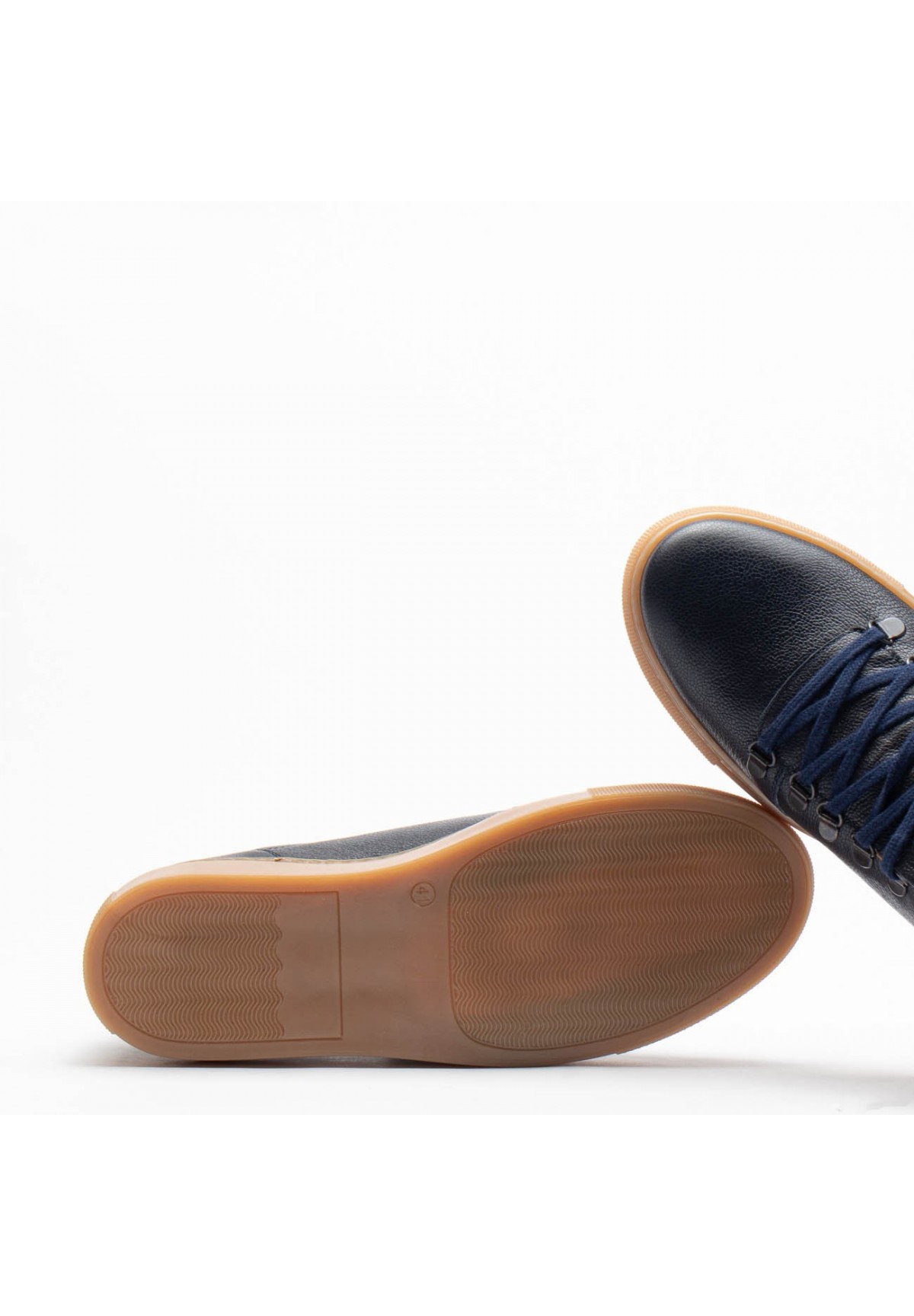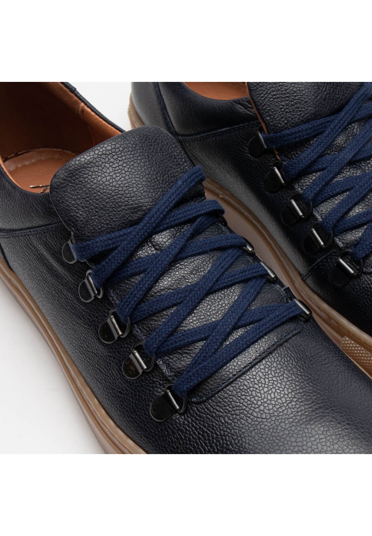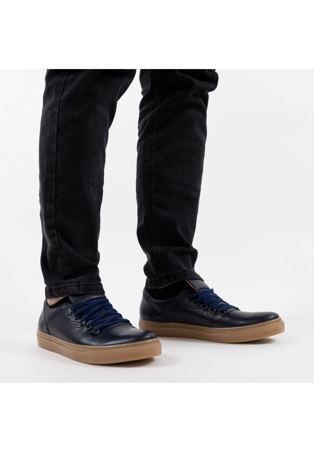 Buty męskie wykonane z wysokiej jakości skóry naturalnej o subtelnej, groszkowanej fakturze, prezentują się niezwykle stylowo. Ich głęboki odcień granatu dodaje im wyrafinowanego charakteru, podczas gdy beżowa podeszwa nadaje im lekkości i świeżości. Wygodne trampki zapewniają nie tylko świetny wygląd, ale także doskonałe wsparcie dla Twoich stóp. Ich starannie zaprojektowana konstrukcja gwarantuje komfort nawet podczas długotrwałego noszenia. Wnętrze butów zostało wyścielane wysokiej jakości skórzaną podszewką oraz wkładką, co sprawia, że stopy czują się komfortowo i chronione. To doskonała kombinacja miękkości i trwałości, która zapewnia maksymalny komfort przez cały dzień.
