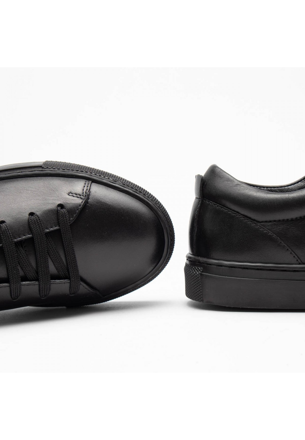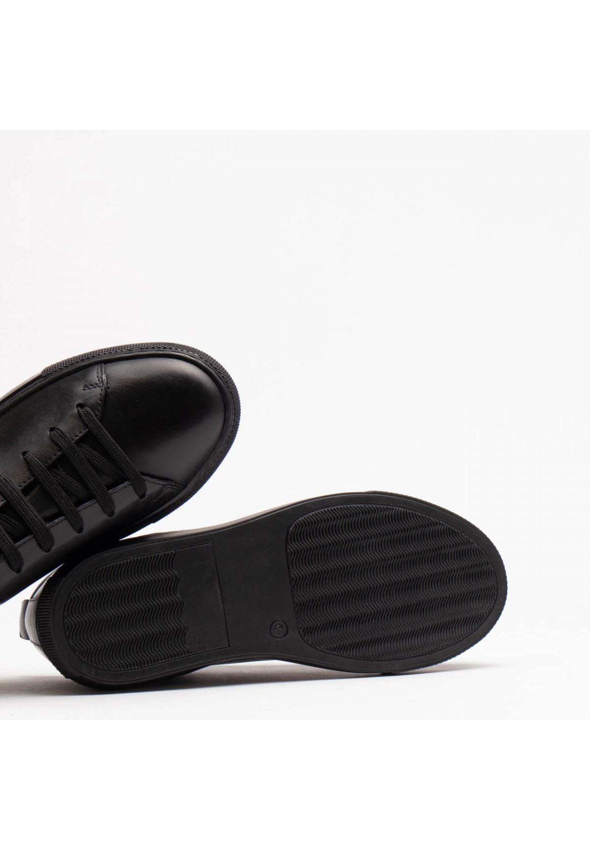 Klasyczne trampki damskie wykonane z naturalnej skóry licowej w eleganckim kolorze czarnym to esencja stylu, komfortu i ponadczasowej elegancji. Posiadają tradycyjny model z sznurowaniem, co pozwala na dostosowanie butów do kształtu stopy i zapewnia pewne i stabilne dopasowanie. Sznurowanie dodaje również nuty sportowego stylu. Nosek trampek jest okrągły i gładki, co sprawia, że buty te prezentują się elegancko i ponadczasowo. Ten klasyczny detal sprawia, że są one doskonałym wyborem zarówno na co dzień, jak i na bardziej formalne okazje.