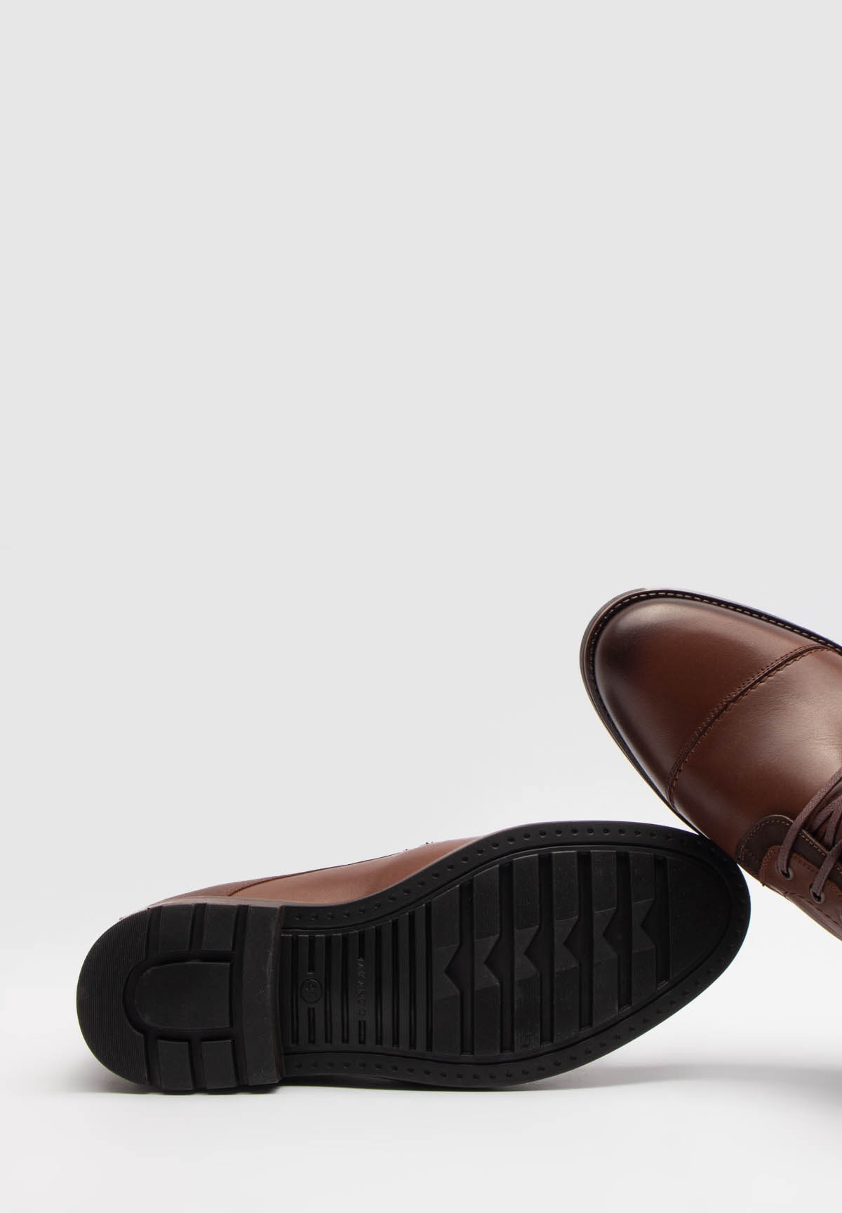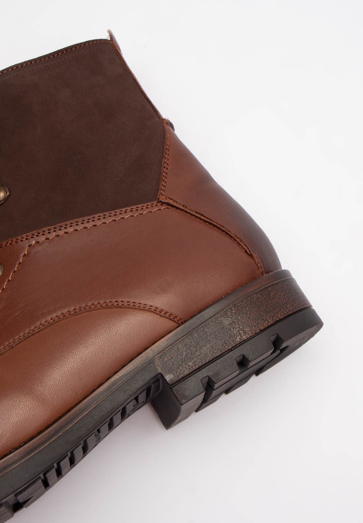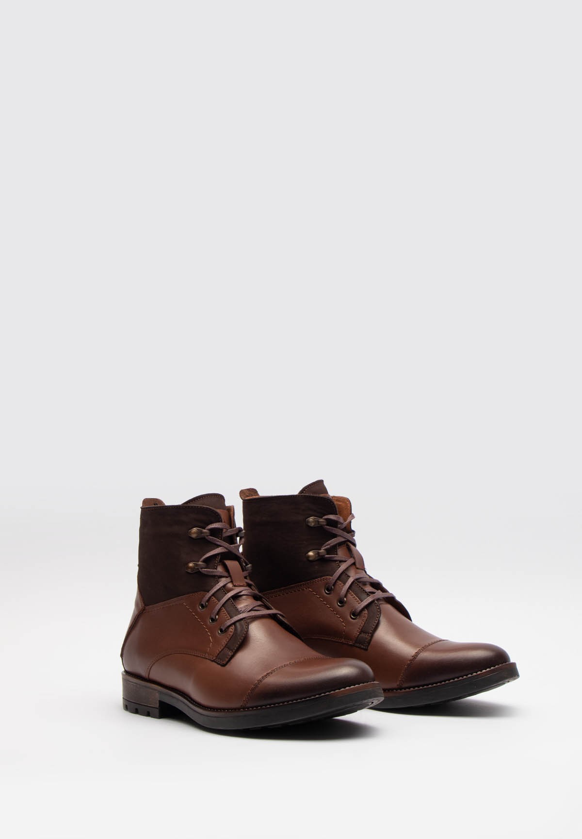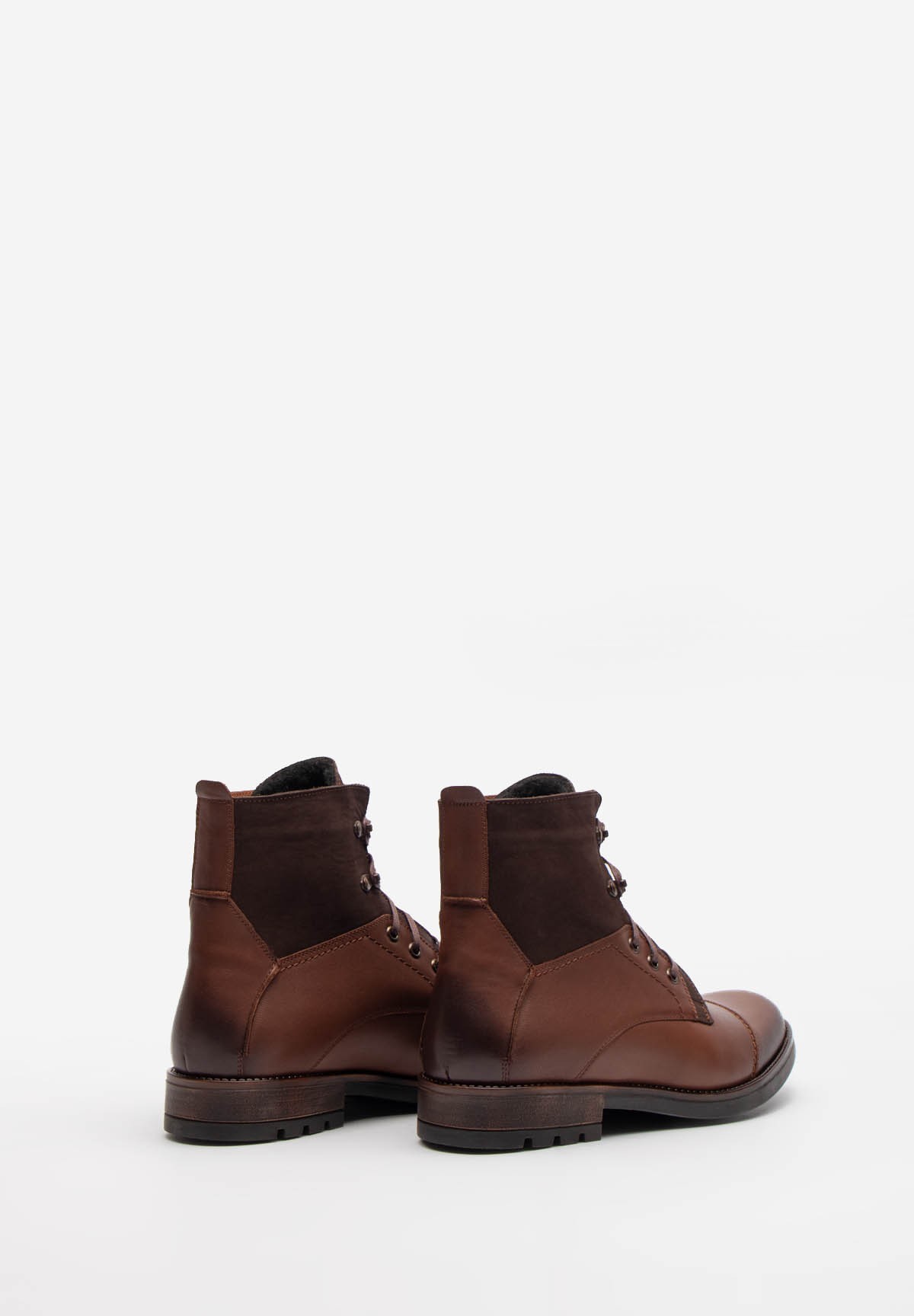 Buty zimowe wykonane ze skóry licowej z wykończeniem z nubuku na górze cholewki. Wygodne, ocieplane wewnątrz i wiązane powyżej kostki buty idealnie sprawdzą się w chłodniejsze dni.