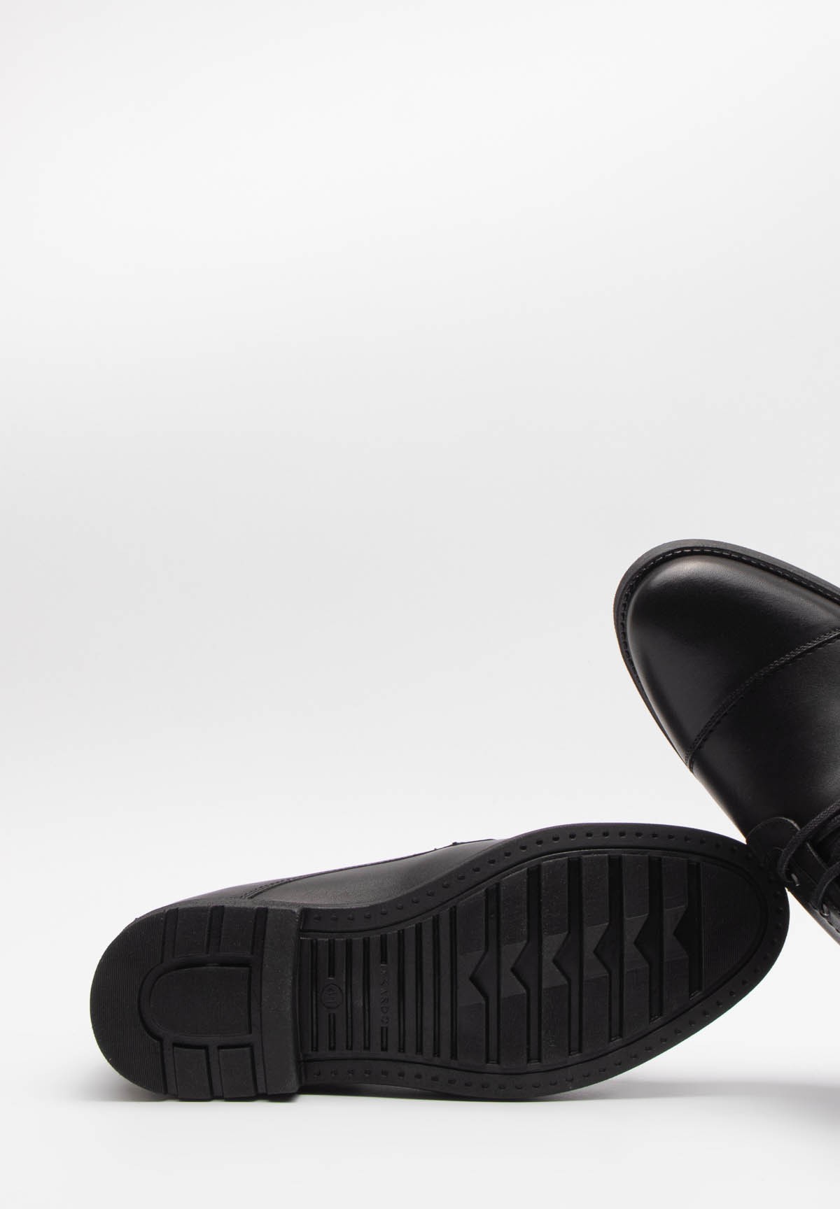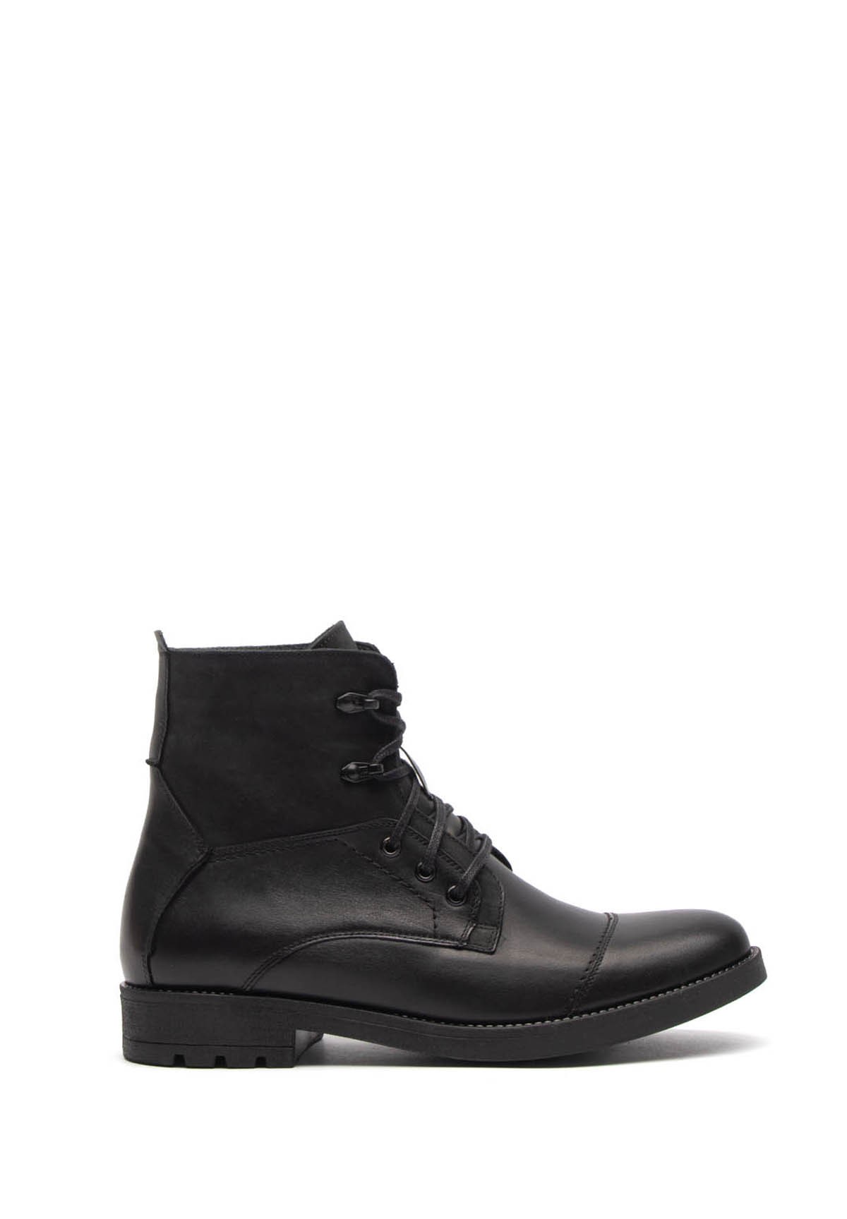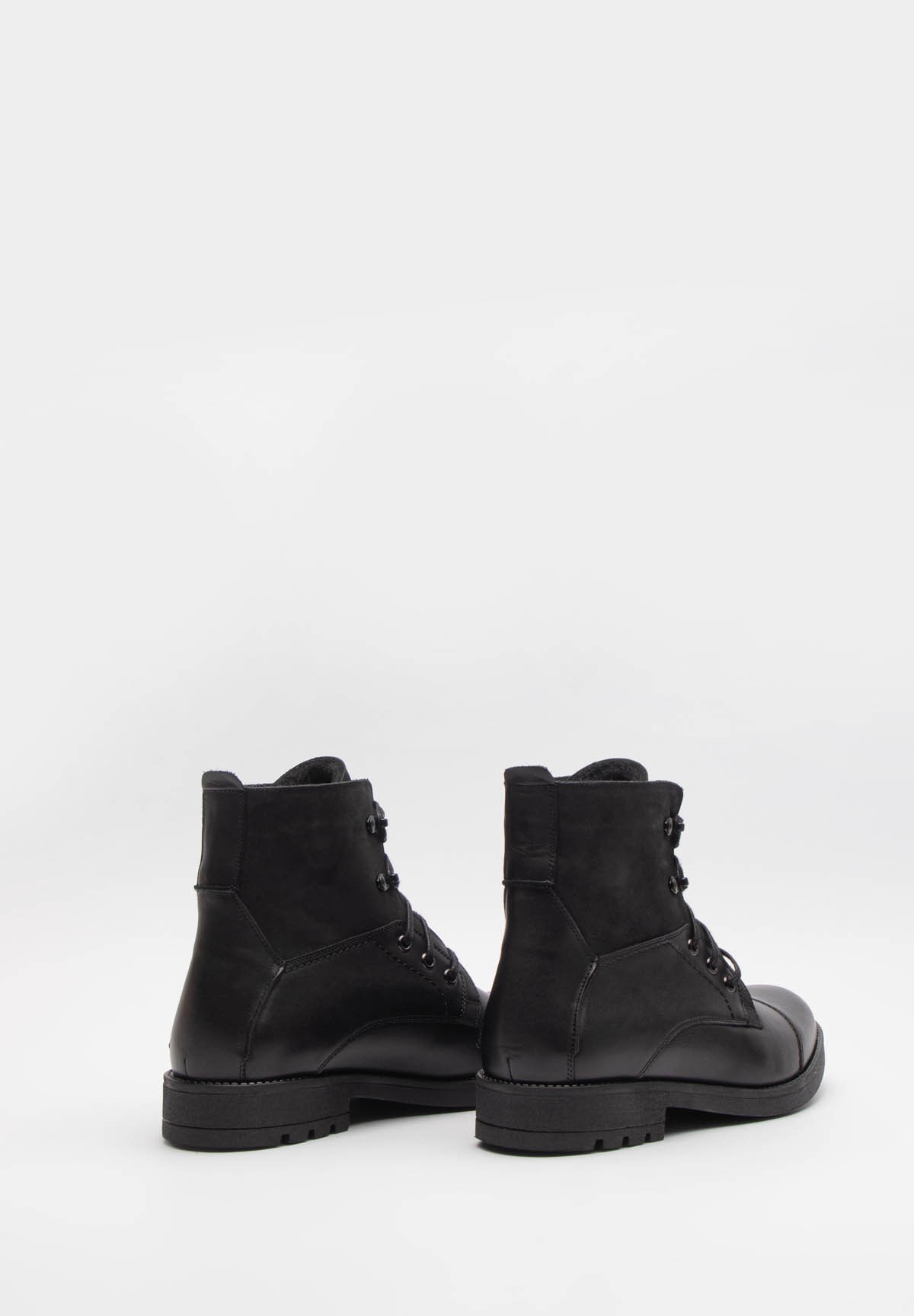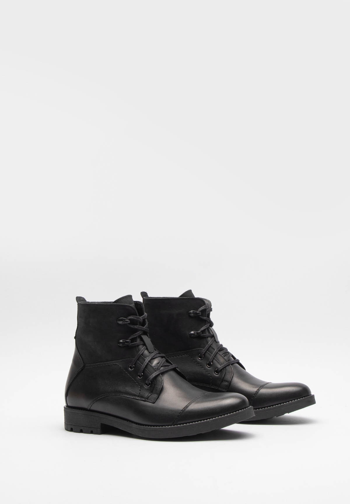 Buty zimowe wykonane ze skóry licowej z wykończeniem z nubuku na górze cholewki. Wygodne, ocieplane wewnątrz i wiązane powyżej kostki buty idealnie sprawdzą się w chłodniejsze dni.